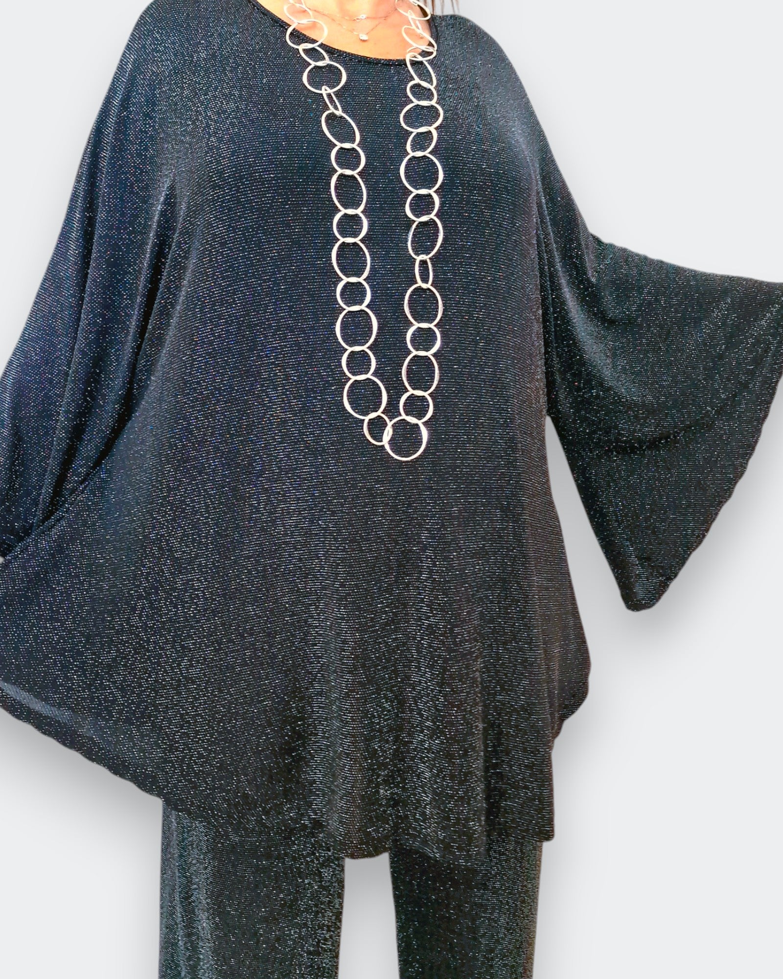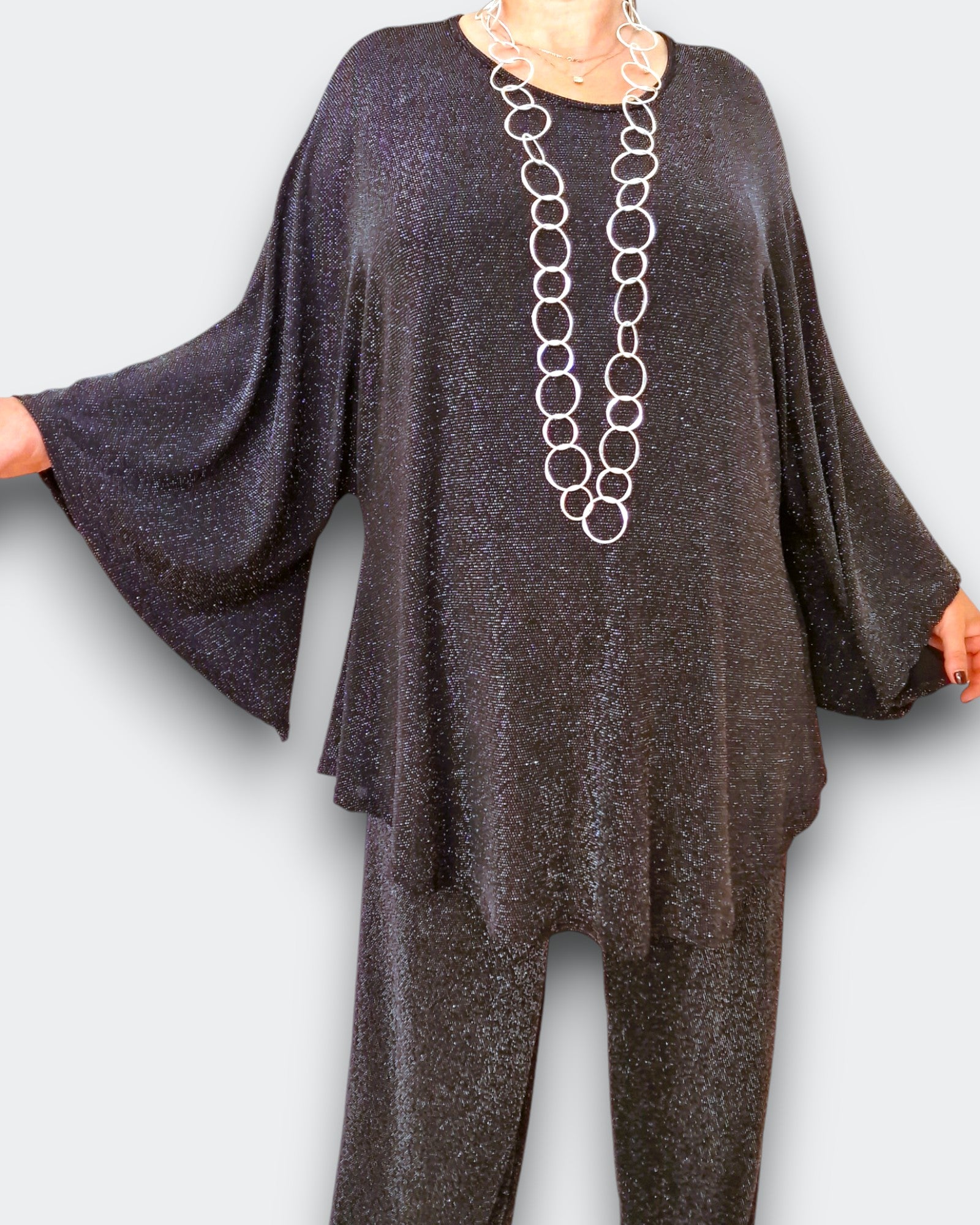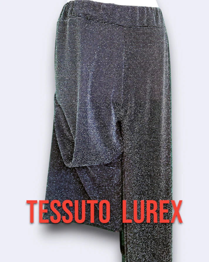 Il Completo in Viscosa Argento è un elegante abbinamento composto da una maglia con manica a campana e orlo stondato in tessuto di crepe di misto viscosa elasticizzata e un pantalone a palazzo realizzato in lurex elasticizzato argentato per un look speciale e raffinato. Questo completo offre una grandissima vestibilità, grazie al suo tessuto elasticizzato ed è perfetto per le donne che vestono le taglie più grandi nelle occasioni più eleganti