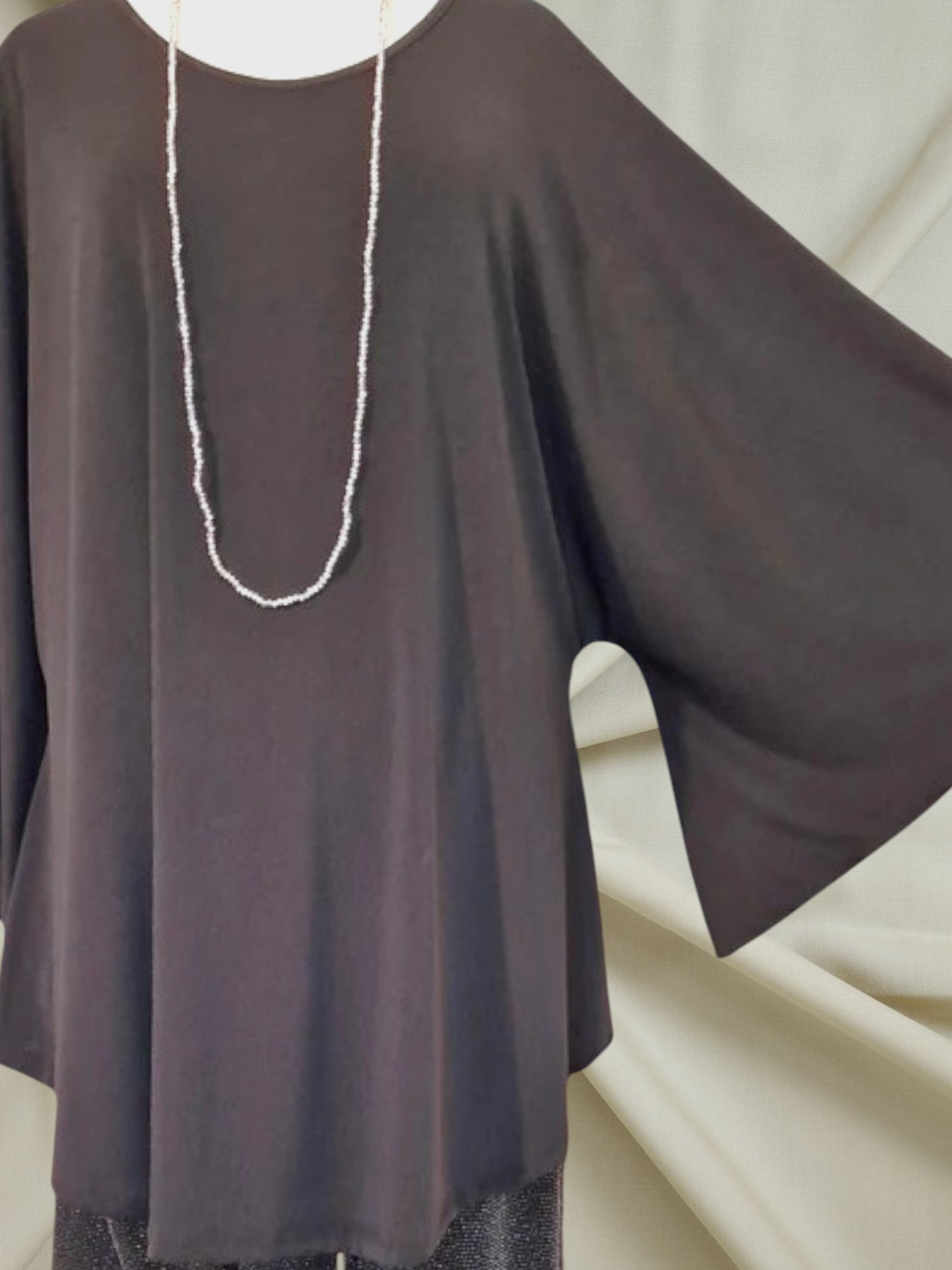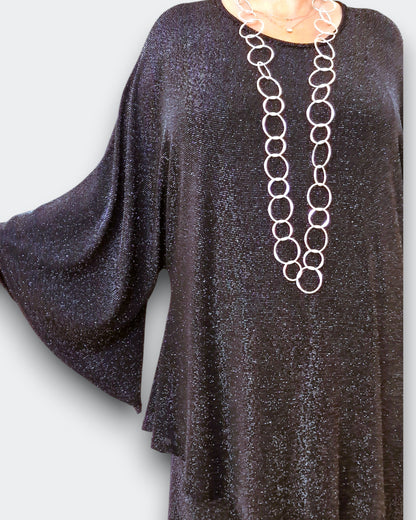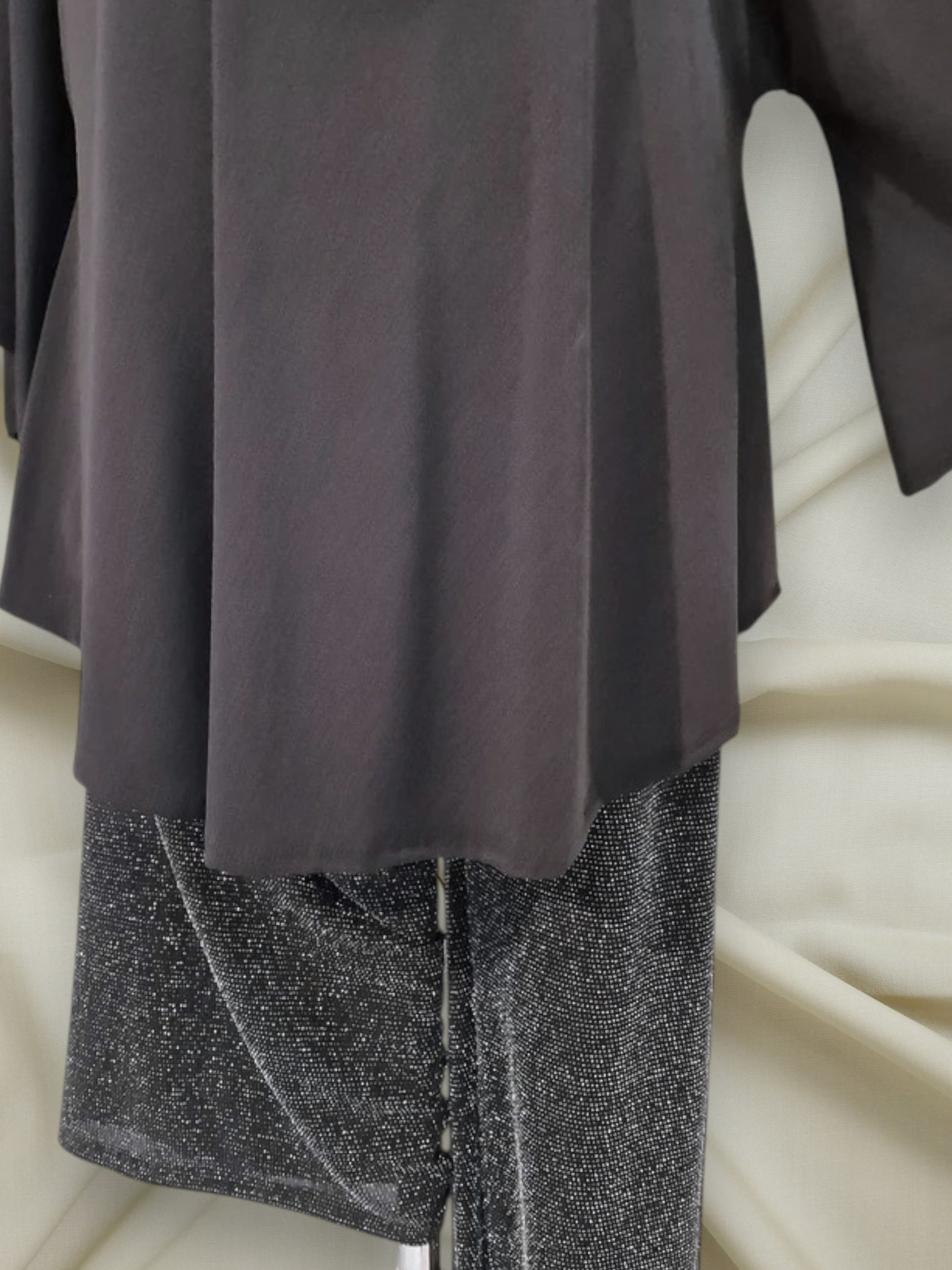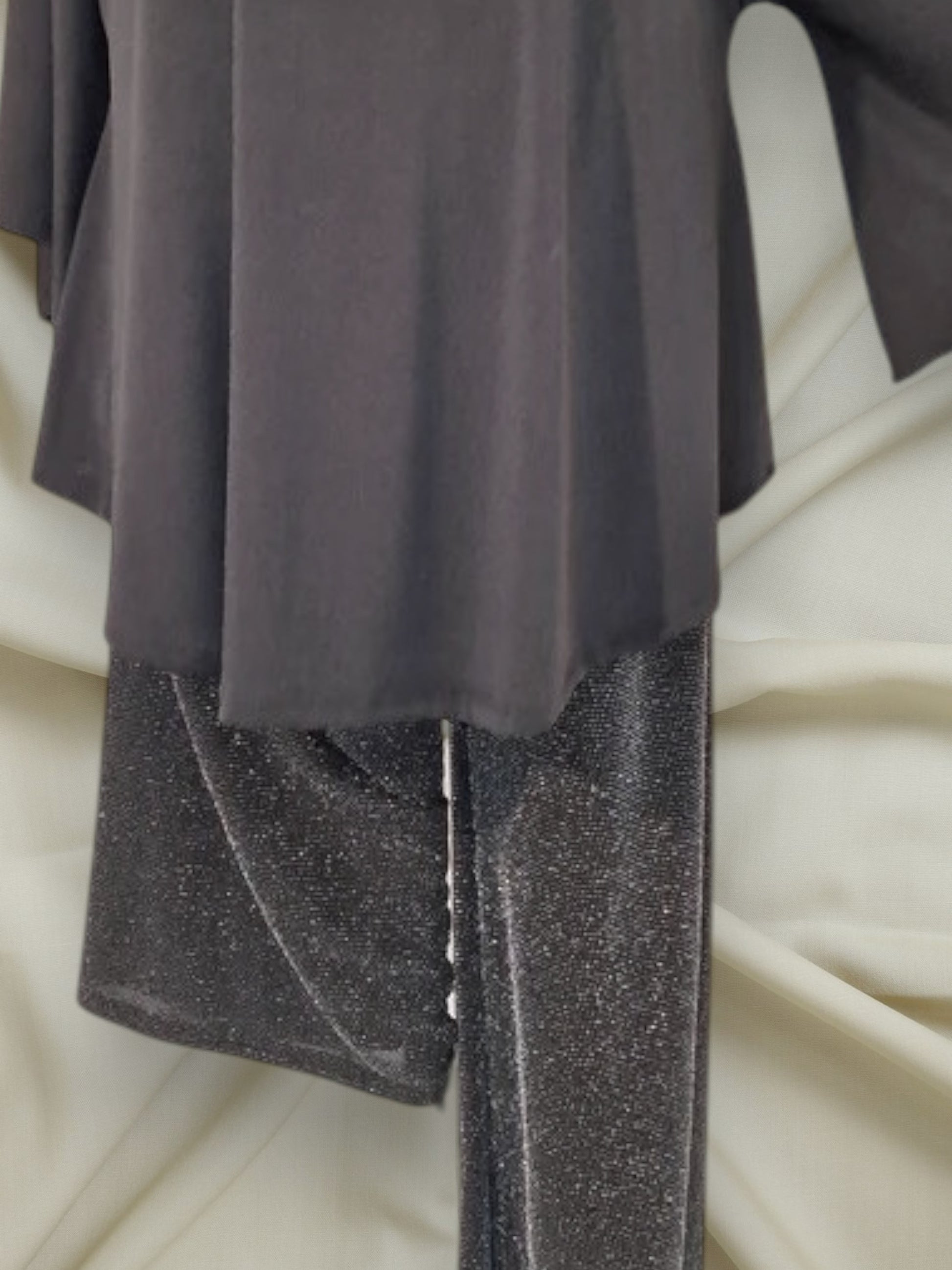 Il Completo in Viscosa Argento è un elegante abbinamento composto da una maglia con manica a campana e orlo stondato in tessuto di crepe di misto viscosa elasticizzata e un pantalone a palazzo realizzato in lurex elasticizzato argentato per un look speciale e raffinato. Questo completo offre una grandissima vestibilità, grazie al suo tessuto elasticizzato ed è perfetto per le donne che vestono le taglie più grandi nelle occasioni più eleganti