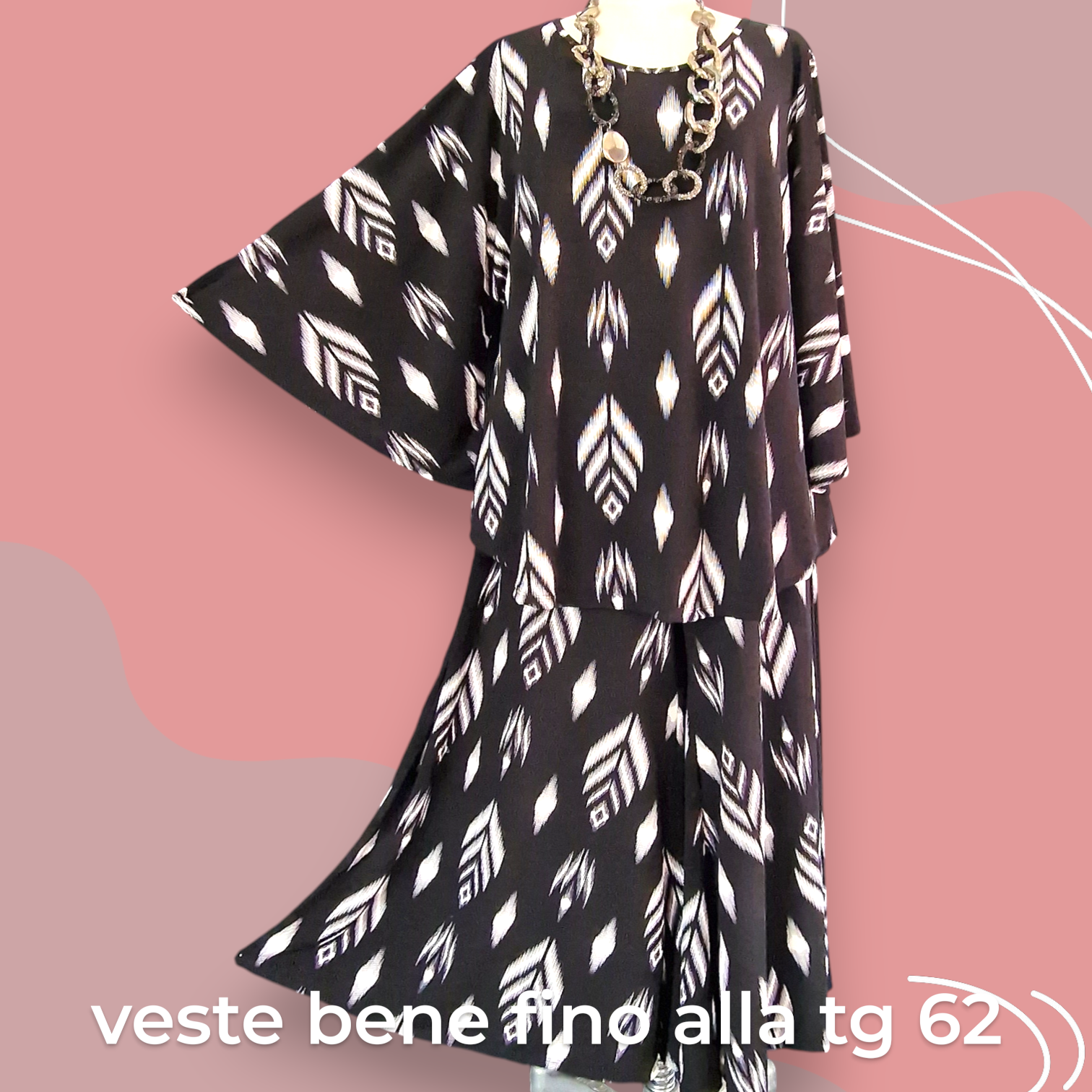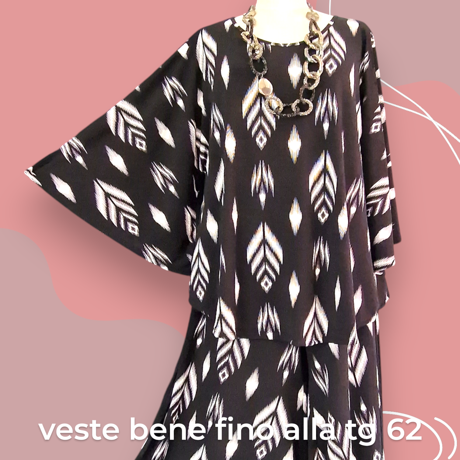 Il Completo Made in Italy Ambra è un elegante abbinamento composto da una maglia con manica a campana e orlo stondato in crepe di misto viscosa elasticizzata fantasia e una Gonna Pantalone realizzati nello stesso tessuto e colore per un look speciale e raffinato. Questo completo offre una grandissima vestibilità, grazie al suo tessuto elasticizzato ed è perfetto per le donne che vestono le taglie più grandi anche nelle occasioni più eleganti