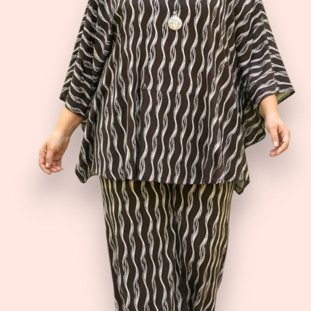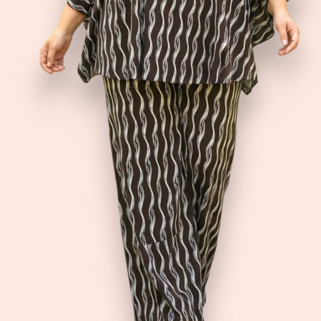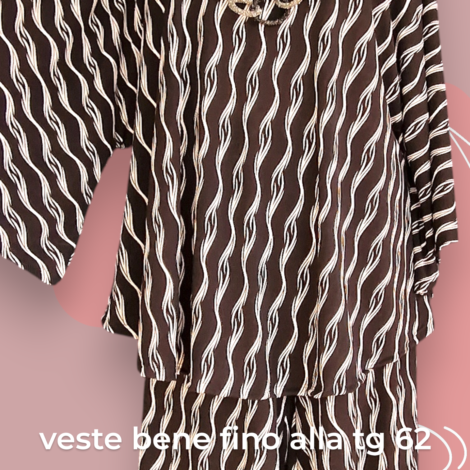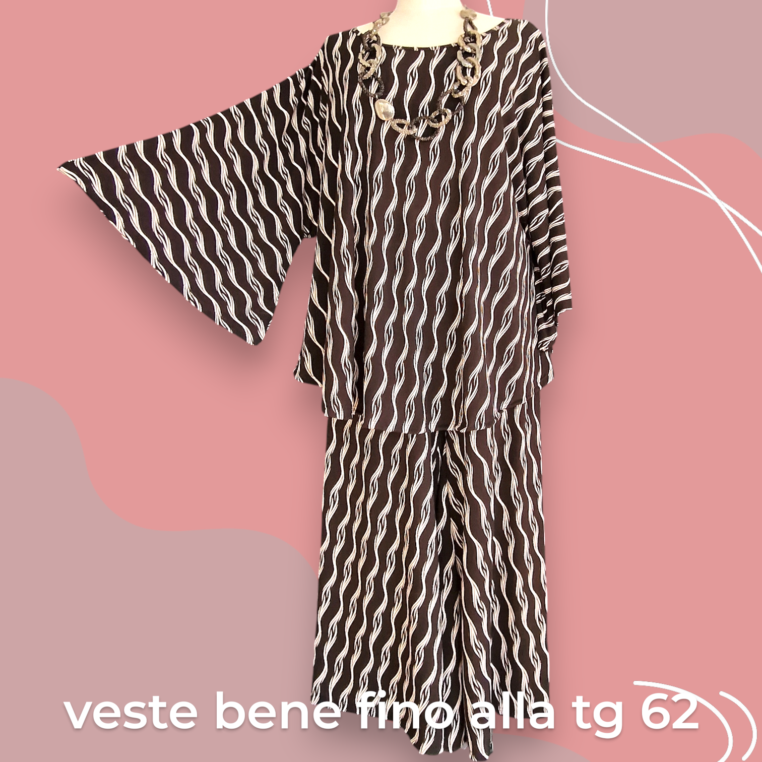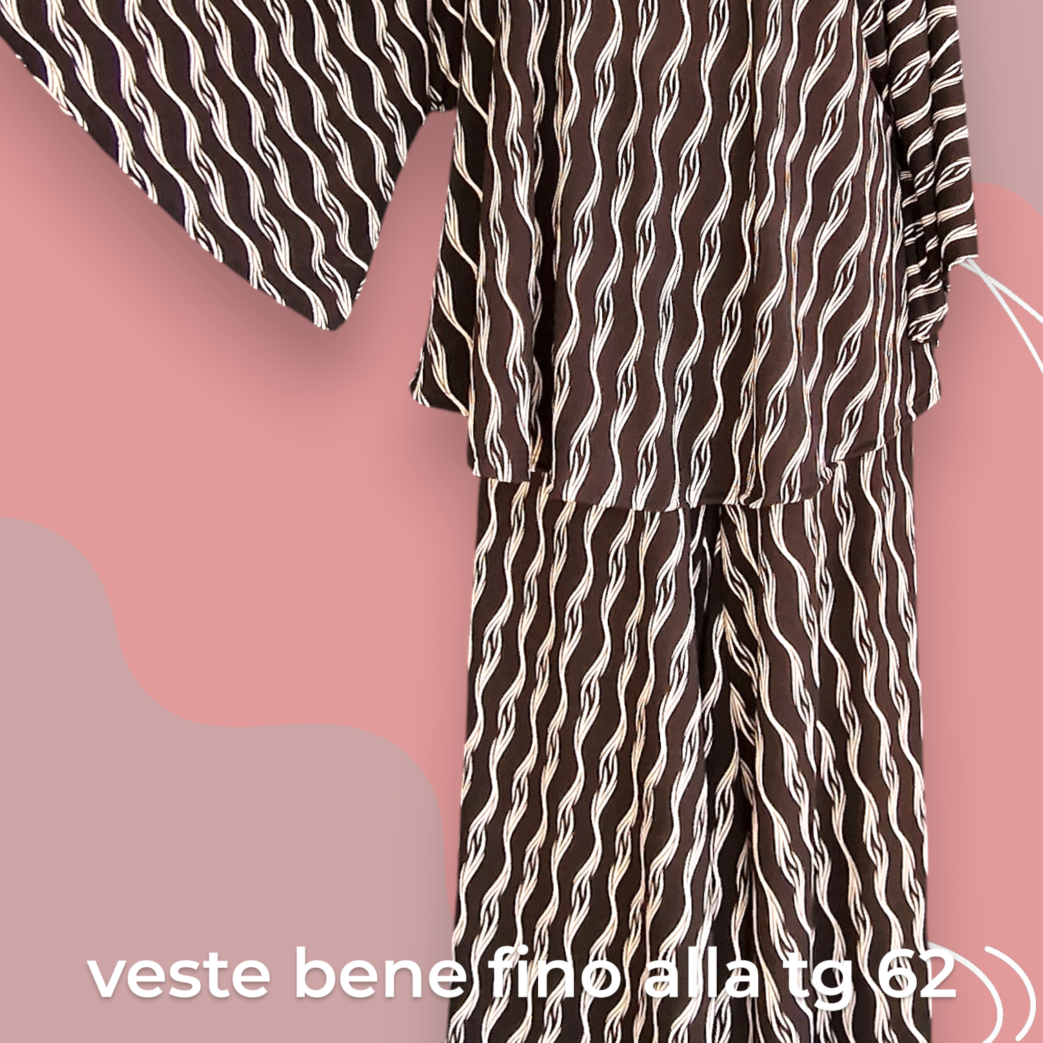 Il Completo Made in Italy Aurelia è un elegante abbinamento composto da una maglia con manica a campana e orlo stondato in crepe di misto viscosa elasticizzata fantasia e un pantalone a palazzo, realizzati nello stesso tessuto e colore per un look speciale e raffinato. Questo completo offre una grandissima vestibilità, grazie al suo tessuto elasticizzato ed è perfetto per le donne che vestono le taglie più grandi anche nelle occasioni più eleganti