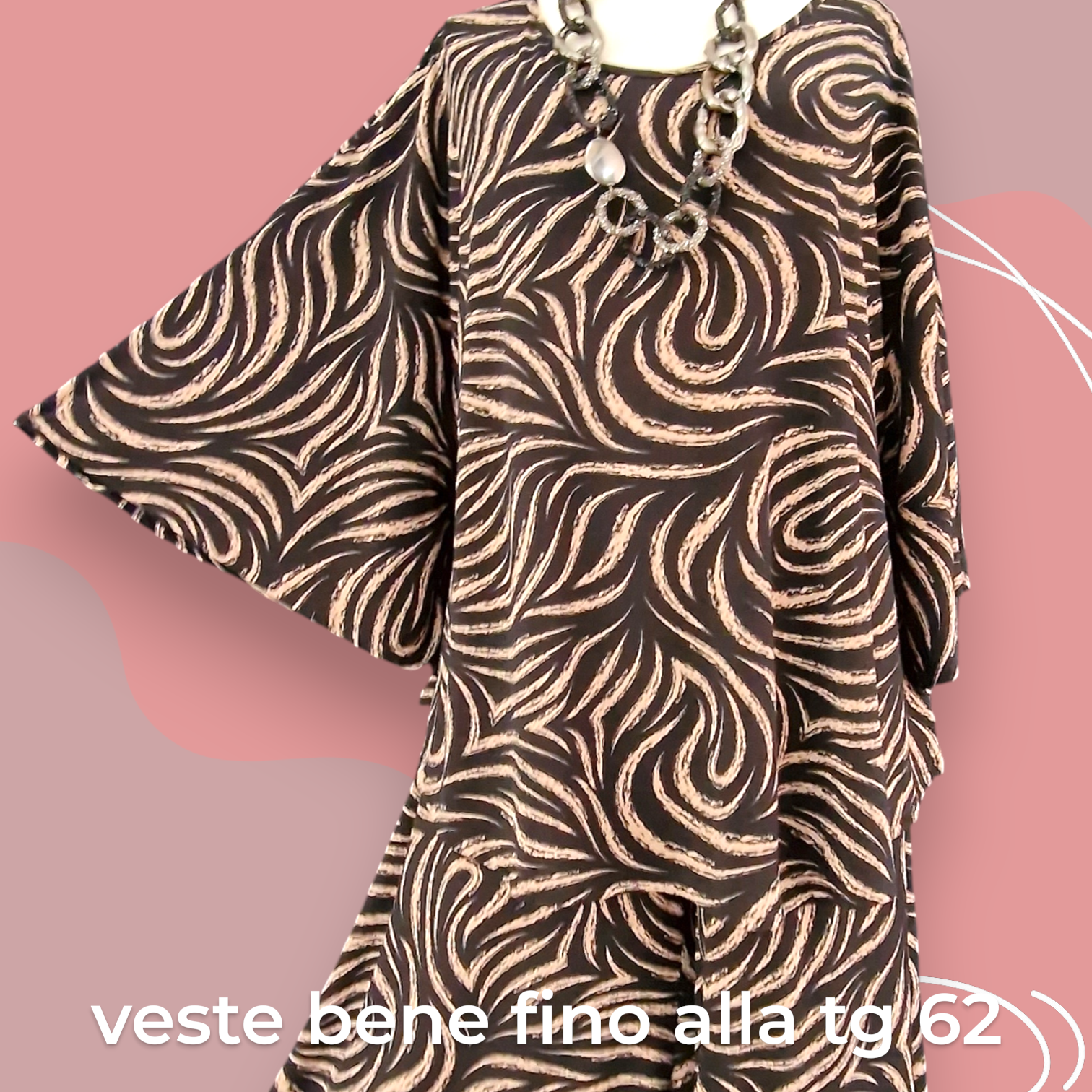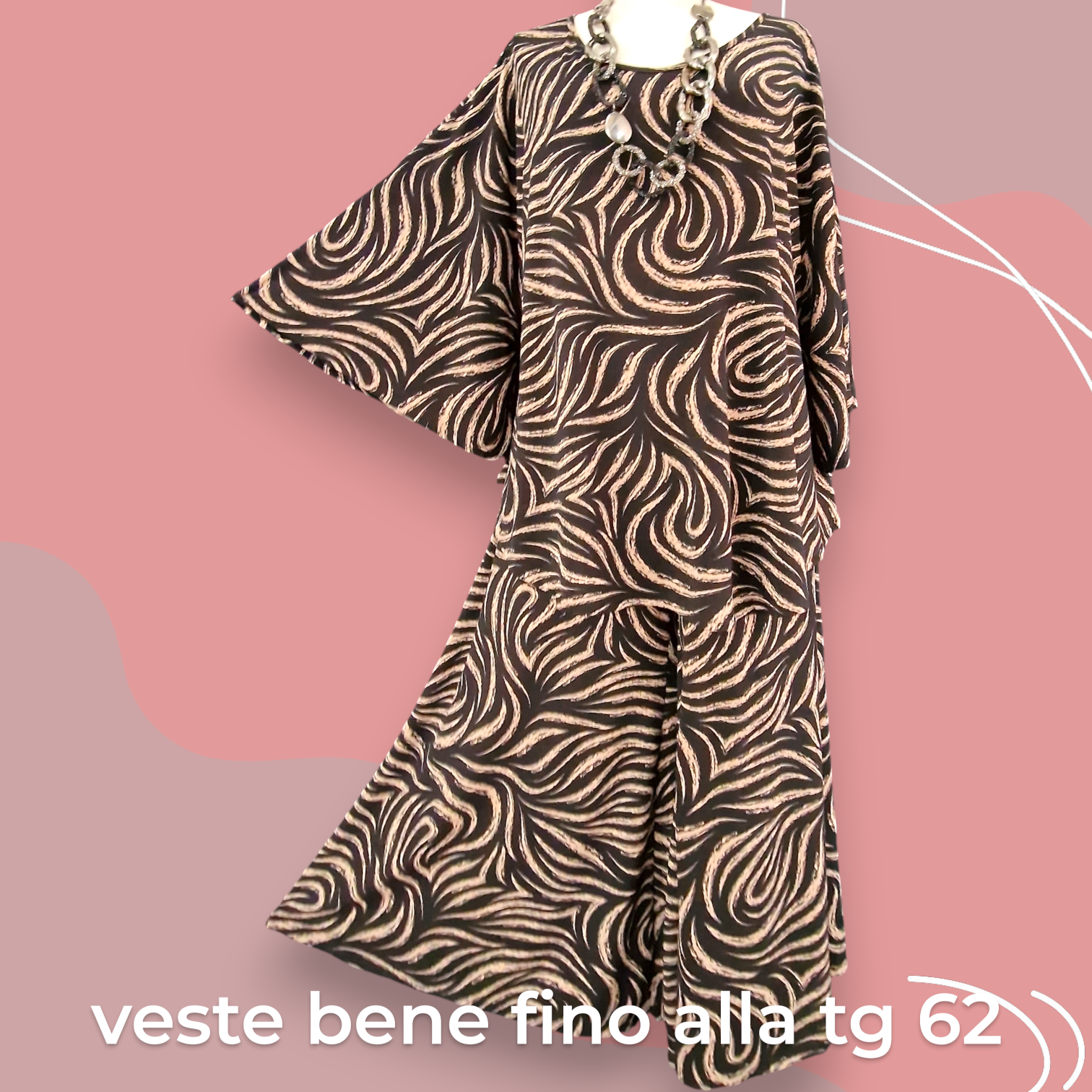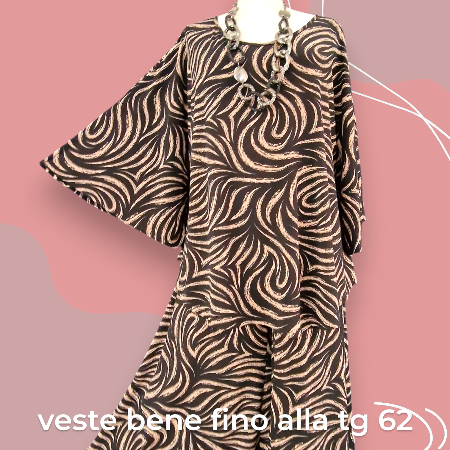 Il Completo Made in Italy Aurica è un elegante abbinamento composto da una maglia con manica a campana e orlo stondato in crepe di misto viscosa elasticizzata fantasia e una Gonna Pantalone realizzati nello stesso tessuto e colore per un look speciale e raffinato. Questo completo offre una grandissima vestibilità, grazie al suo tessuto elasticizzato ed è perfetto per le donne che vestono le taglie più grandi anche nelle occasioni più eleganti