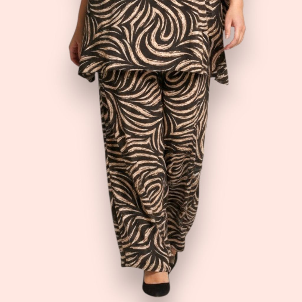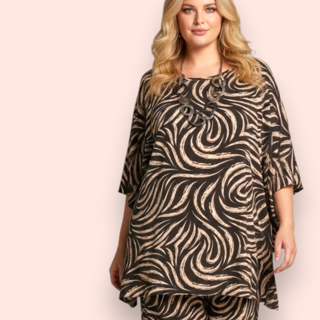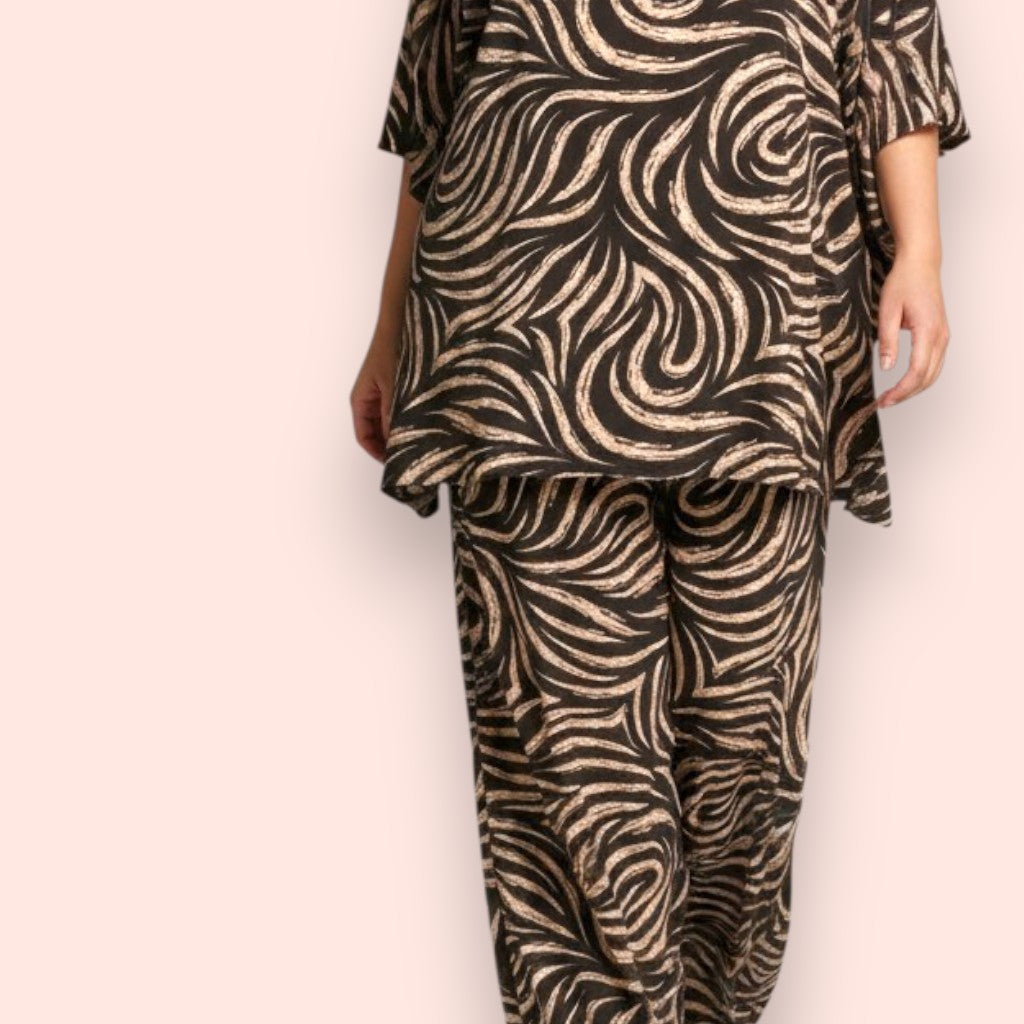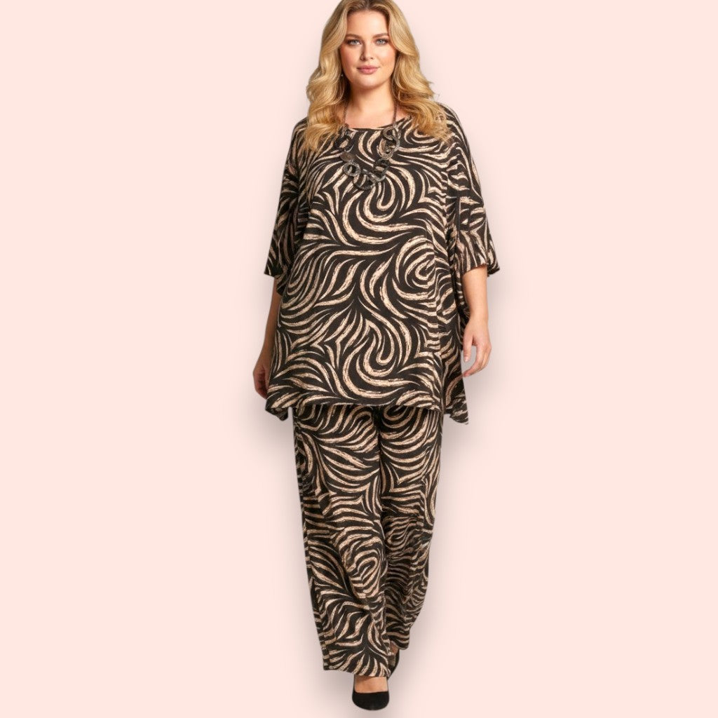 Il Completo Made in Italy Aurica è un elegante abbinamento composto da una maglia con manica a campana e orlo stondato in crepe di misto viscosa elasticizzata fantasia e una Gonna Pantalone realizzati nello stesso tessuto e colore per un look speciale e raffinato. Questo completo offre una grandissima vestibilità, grazie al suo tessuto elasticizzato ed è perfetto per le donne che vestono le taglie più grandi anche nelle occasioni più eleganti