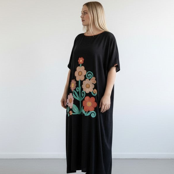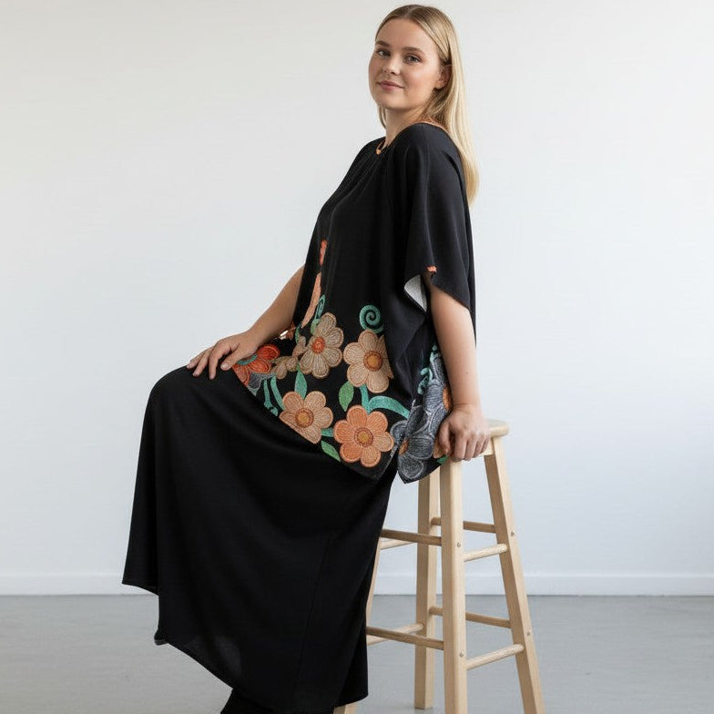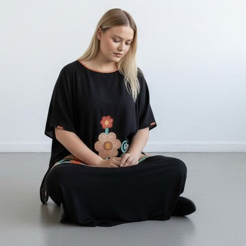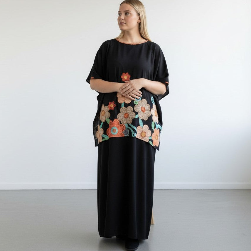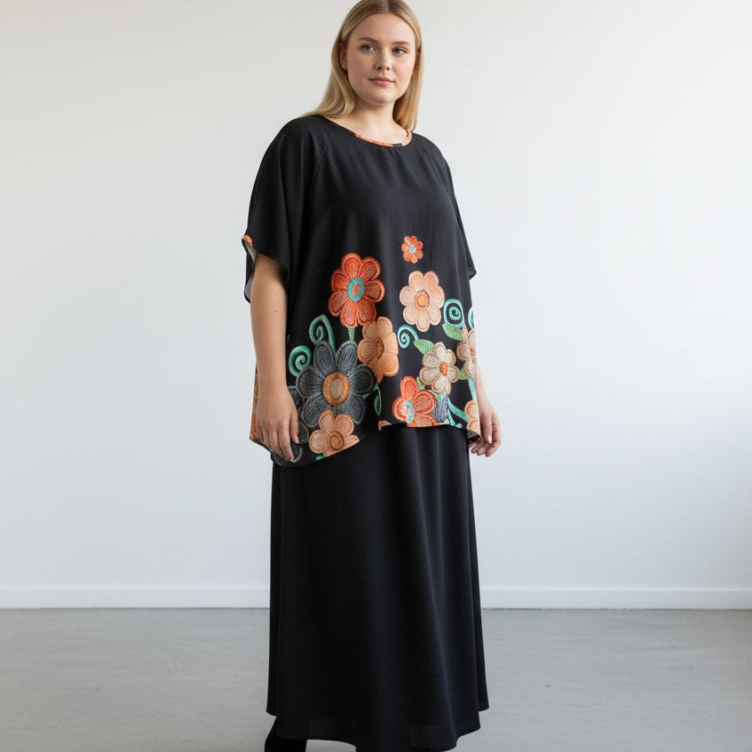 Completo Taglie Forti Morena è composto da una Maxi Maglia in tessuto fermo tinta unita con una stampa a fiori e dal pantalone modello a palazzo NERO in crepe elasticizzato . ottima vestibilità,