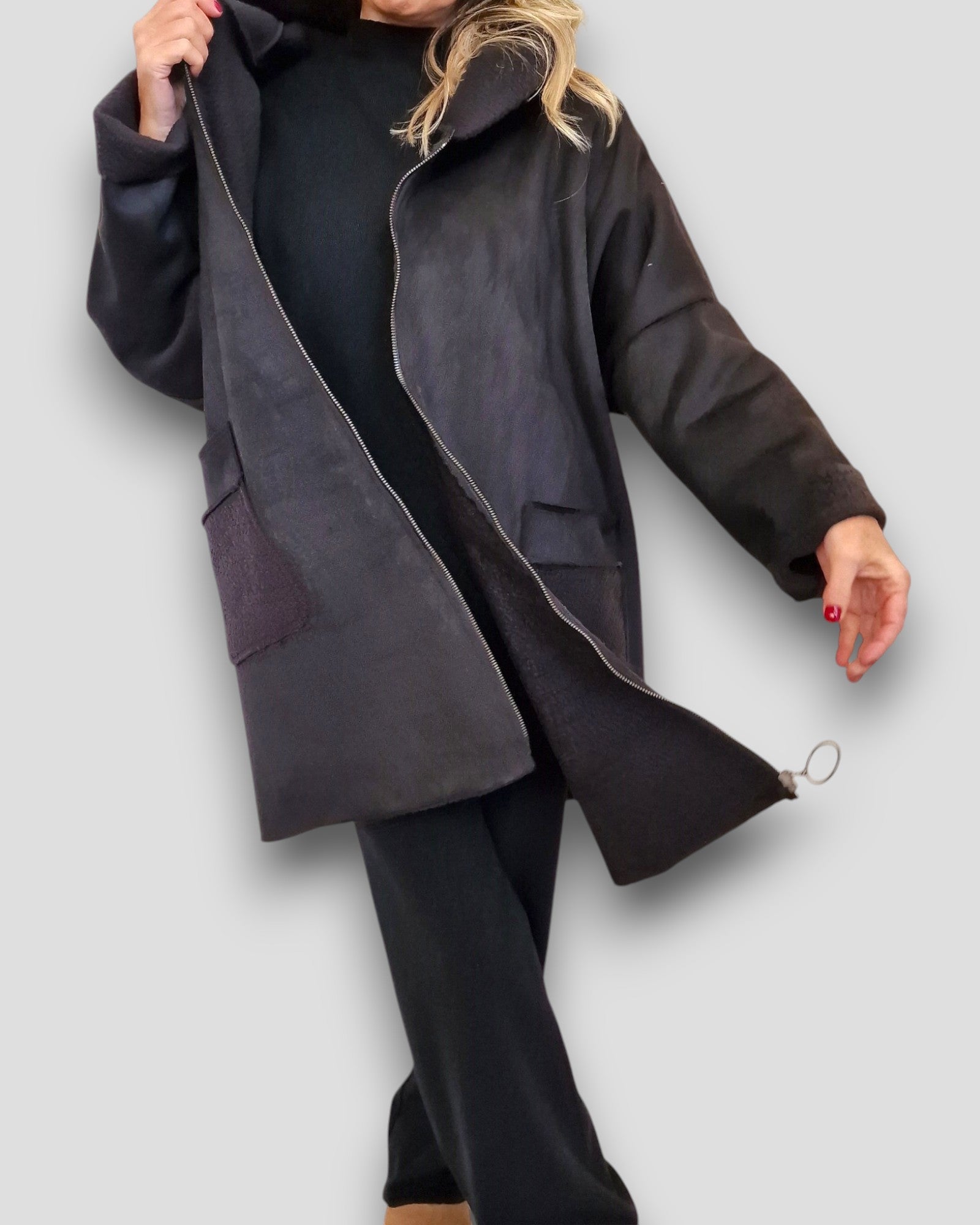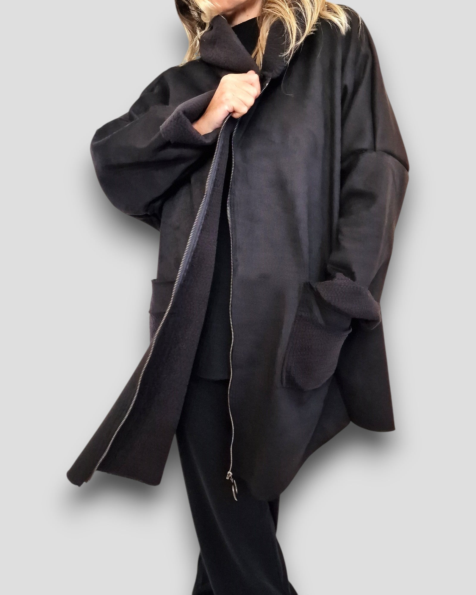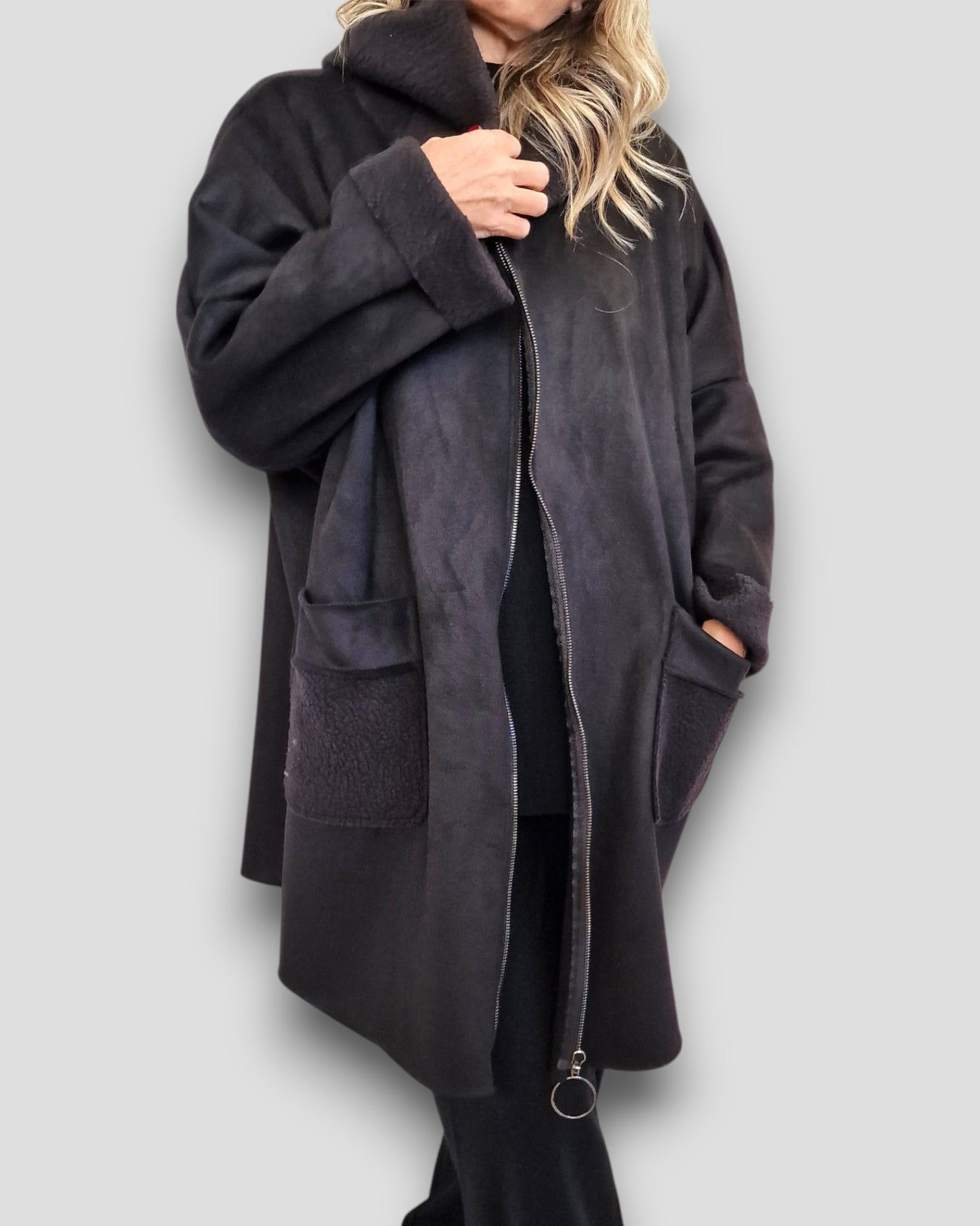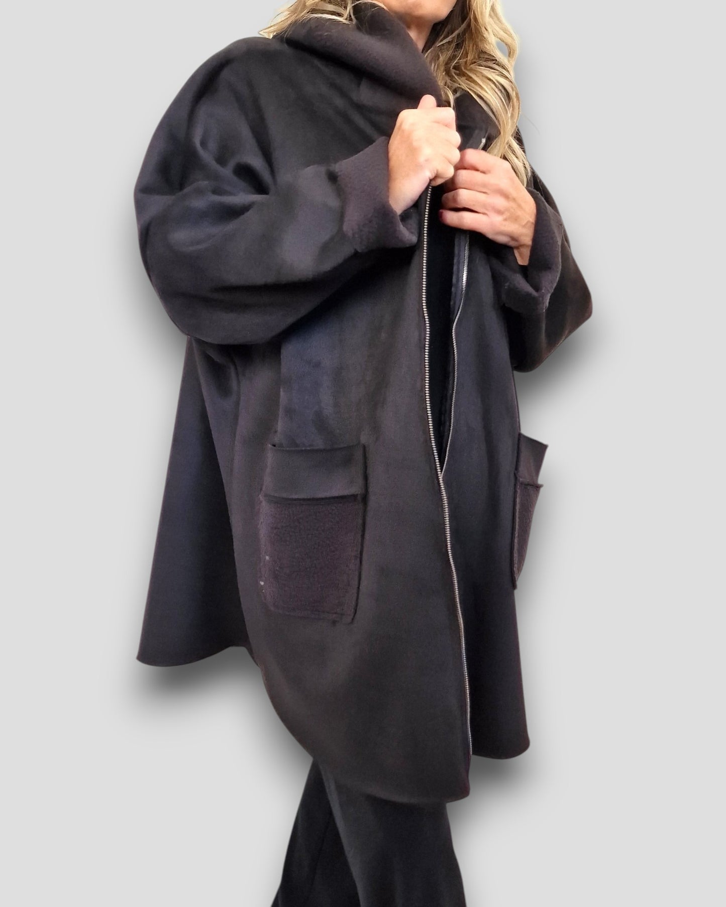 Il modello Prugna è una splendida Giacca taglia grande in tessuto effetto Arancia rovesciato . Modello con cappuccio e tasche a toppa davanti a contrasto, Chiusura con zip, grandissima vestibilità, Made in Italy, taglia unica, colore Nero