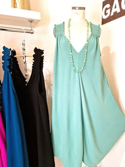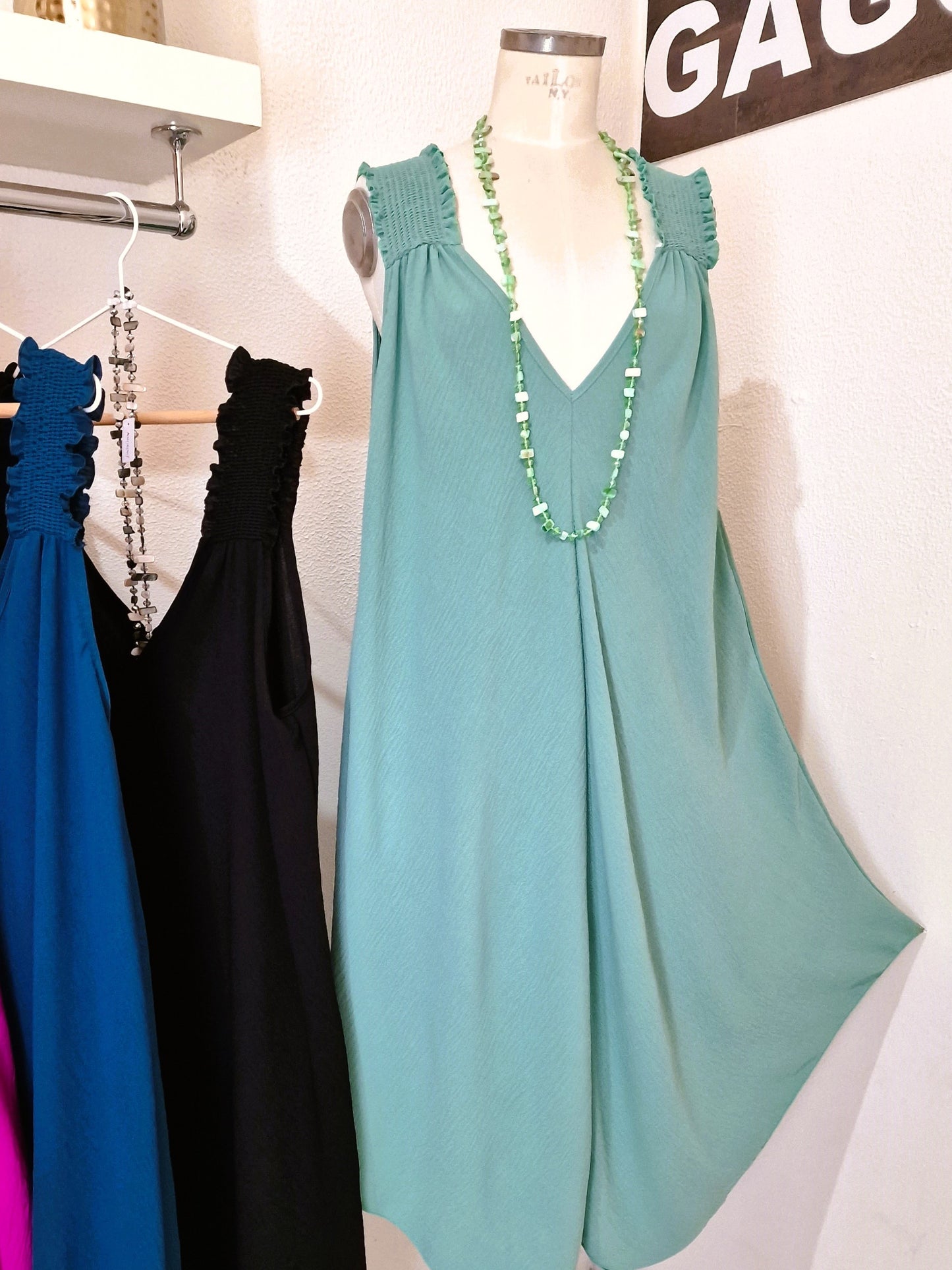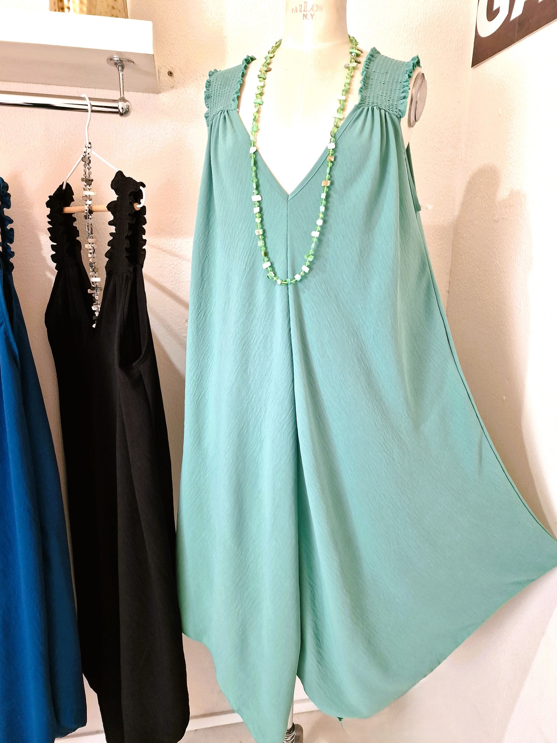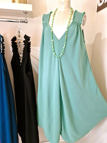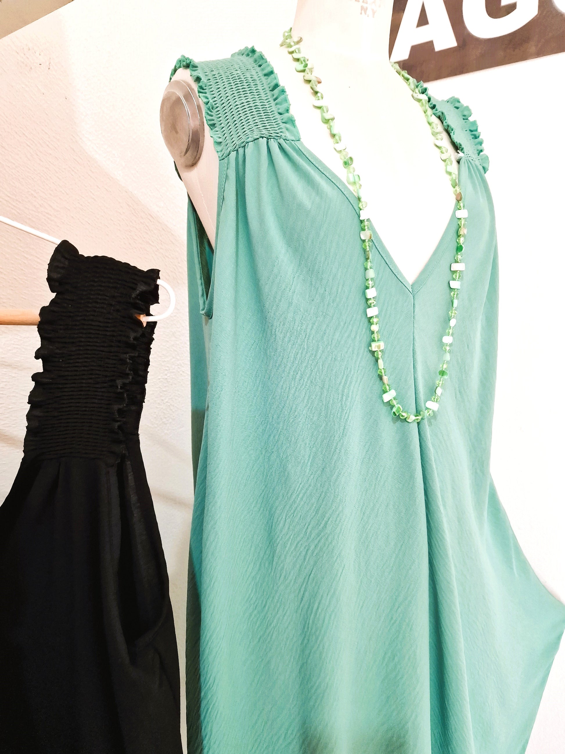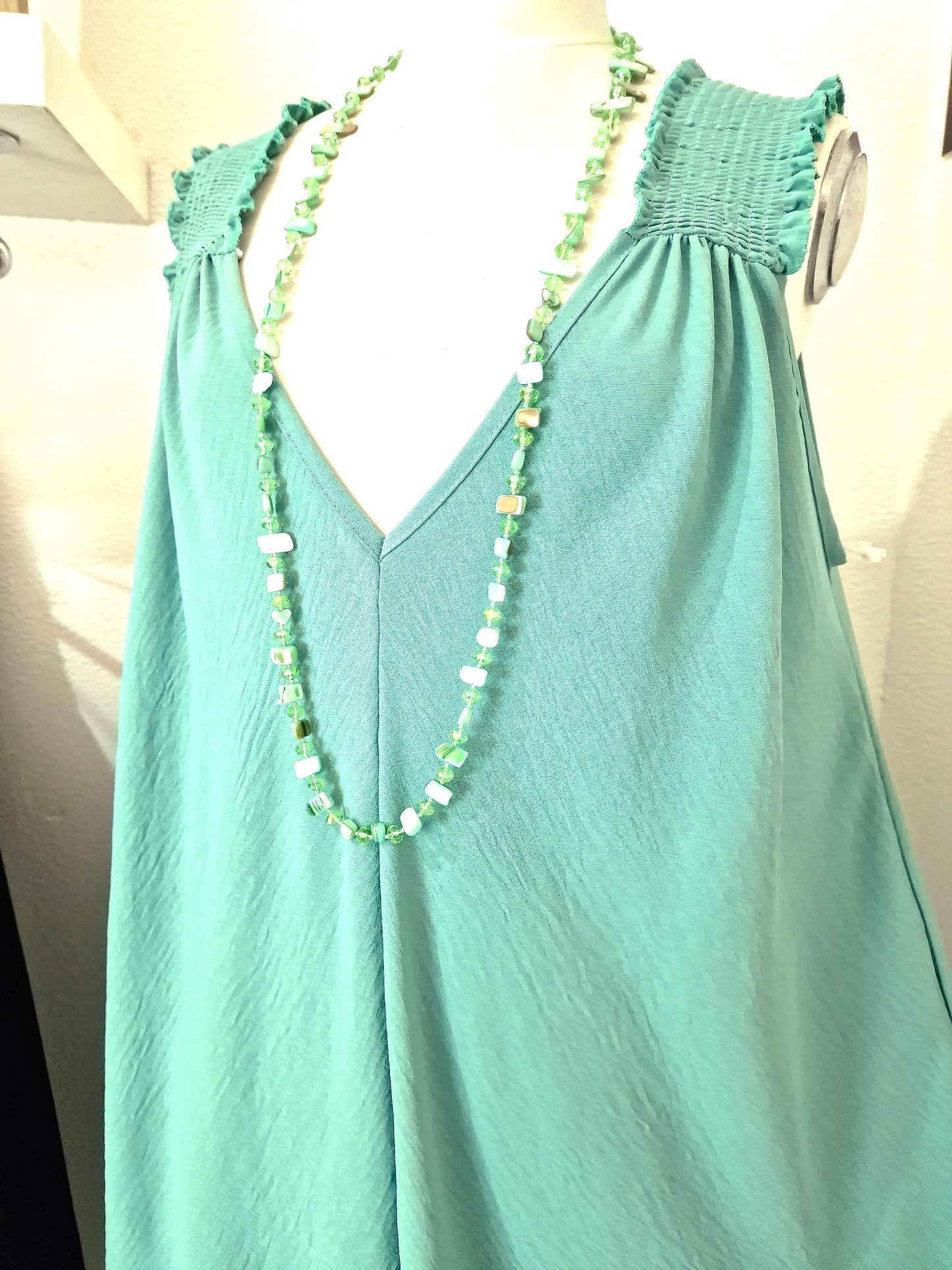 Il modello Cassia è una maxi abito + collana smanicato in tessuto fermo di misto viscosa. Ampio collo a v con spallina elasticizzata. Taglio a Trapezio con pinces davanti. La bellissima collana dona un tocco di classe a questo abito di grandissima vestibilità