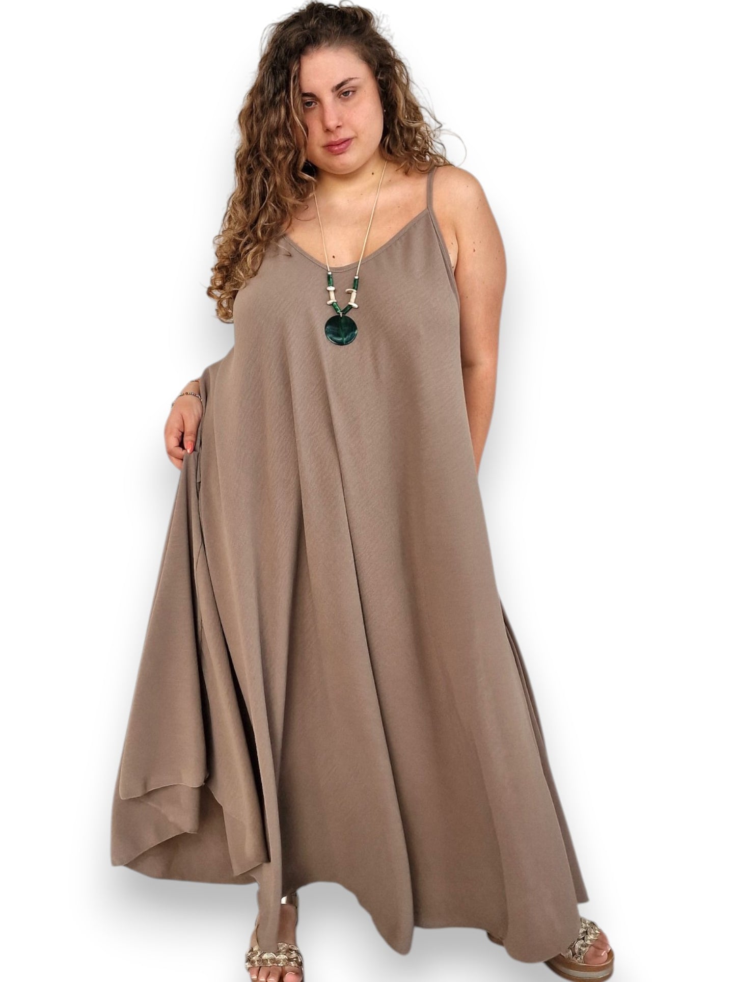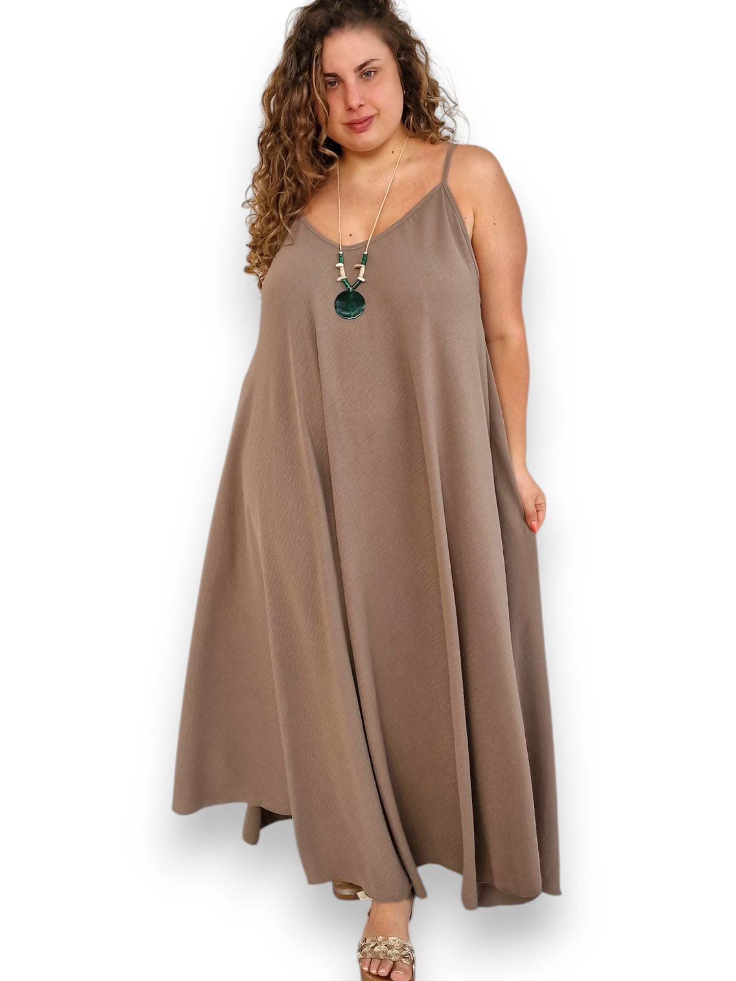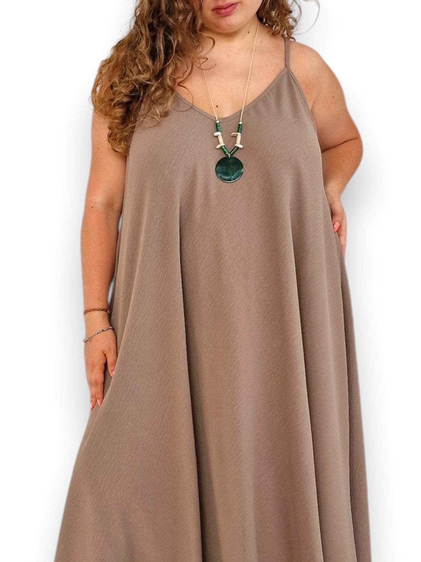 Scopri il Maxi Abito con Collana Taglie Forti Agnese 100% viscosa Tinta Unita . Collo a v con bretelline e lunghezza alla caviglia, tagliato in sbieco per una grandissima vestibilità,