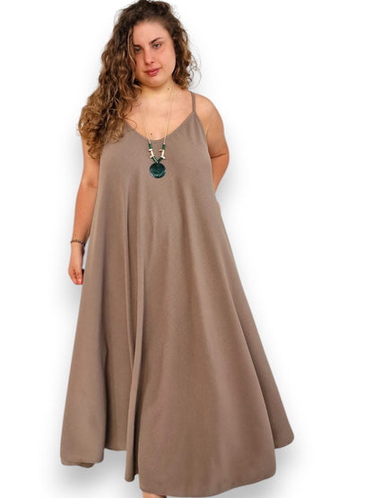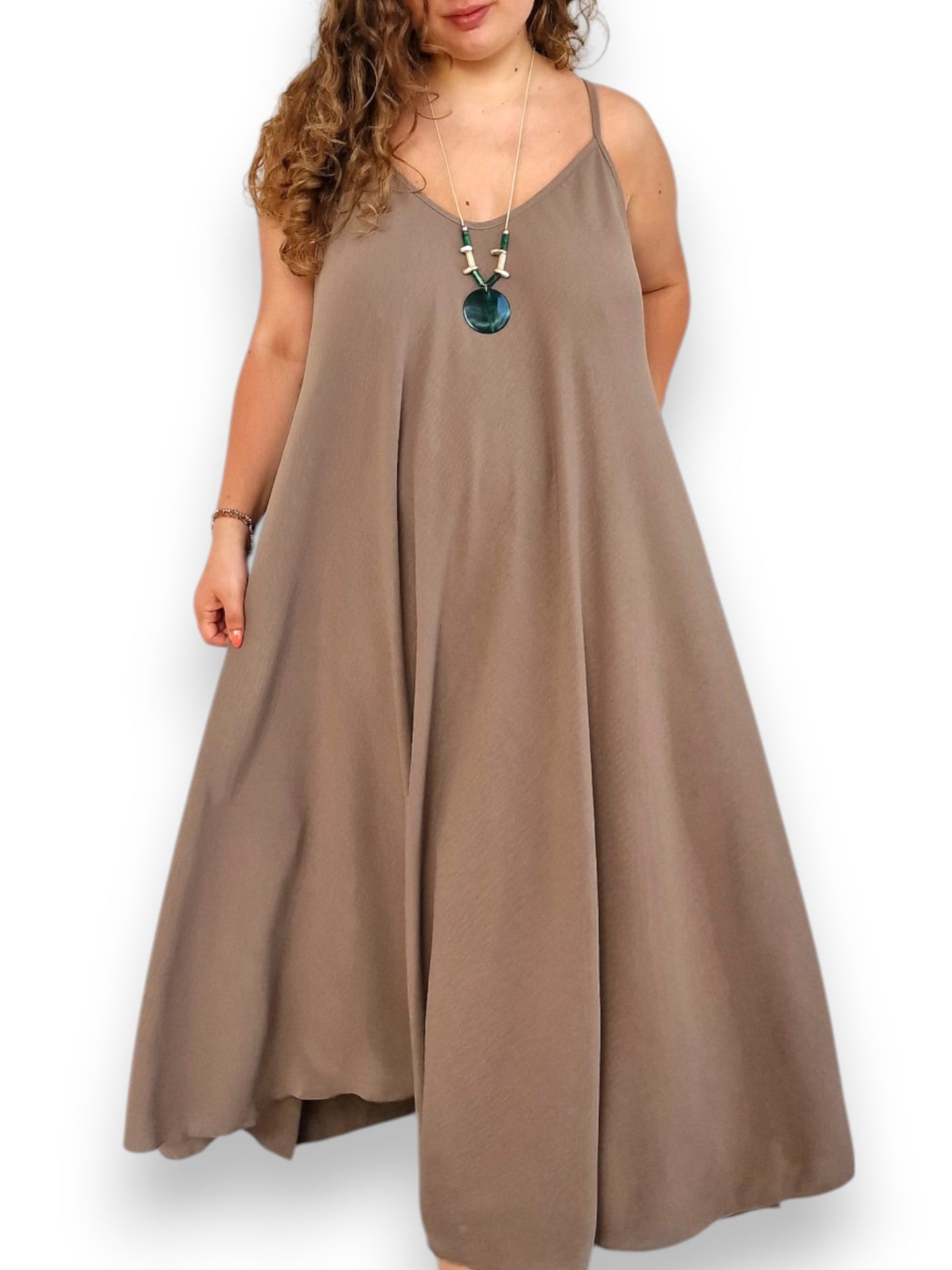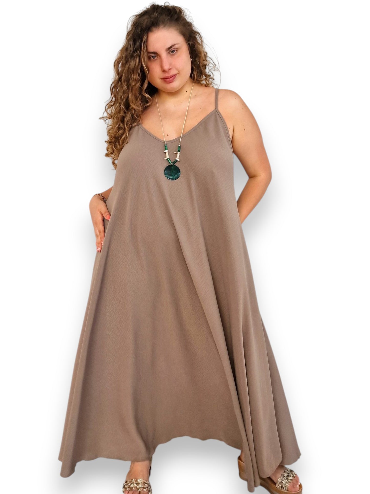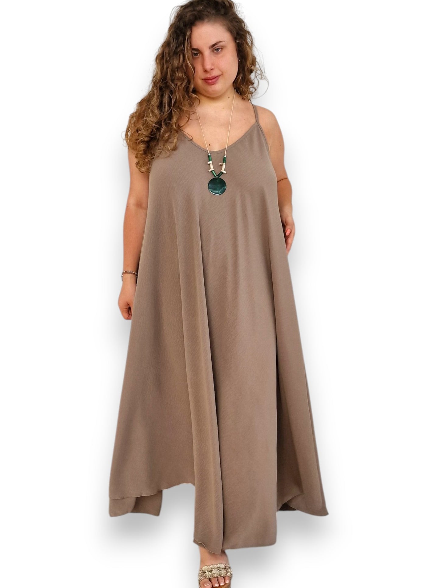 Scopri il Maxi Abito con Collana Taglie Forti Agnese 100% viscosa Tinta Unita . Collo a v con bretelline e lunghezza alla caviglia, tagliato in sbieco per una grandissima vestibilità,