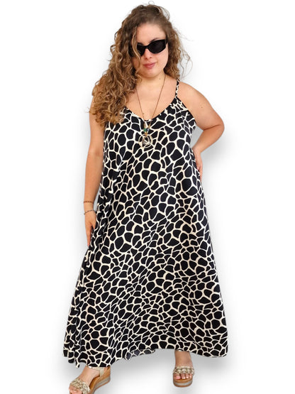 Scopri il Maxi Abito con Collana Taglie Forti Alicia 100% viscosa Fantasia . Collo a v con bretelline e lunghezza alla caviglia, tagliato in sbieco per una grandissima vestibilità,