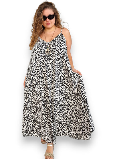 Scopri il Maxi Abito con Collana Taglie Forti Alteaa 100% viscosa Fantasia . Collo a v con bretelline e lunghezza alla caviglia, tagliato in sbieco per una grandissima vestibilità,