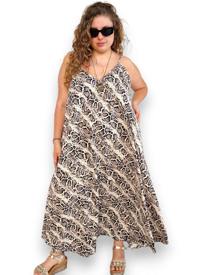 Scopri il Maxi Abito con Collana Taglie Forti Amabel 100% viscosa Fantasia . Collo a v con bretelline e lunghezza alla caviglia, tagliato in sbieco per una grandissima vestibilità,
