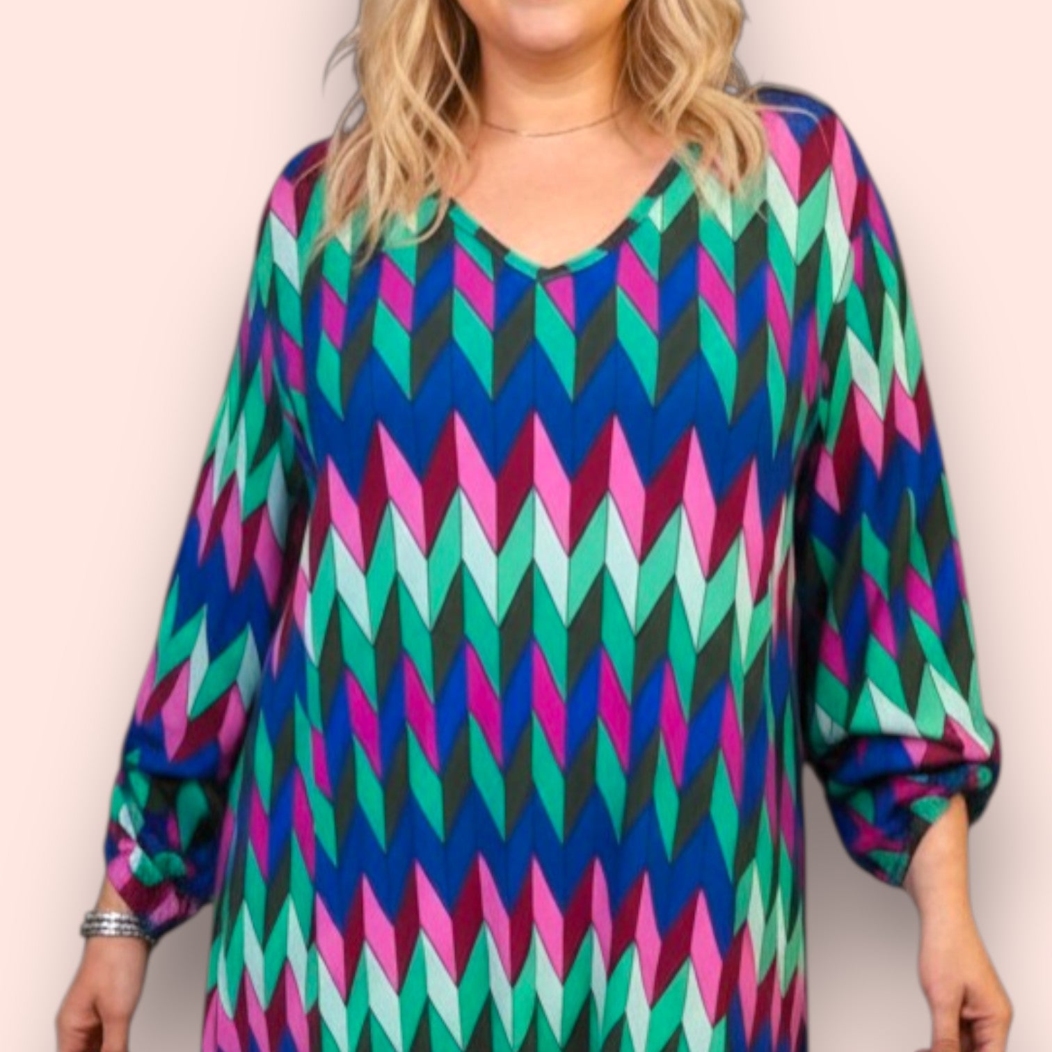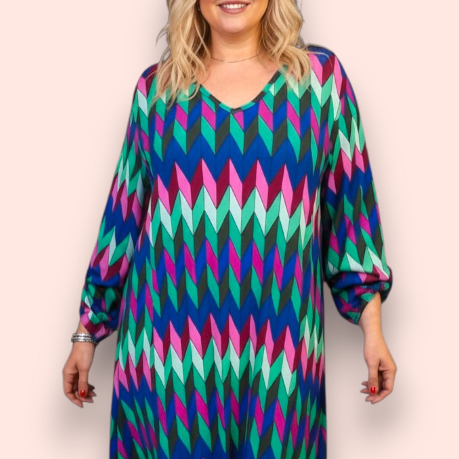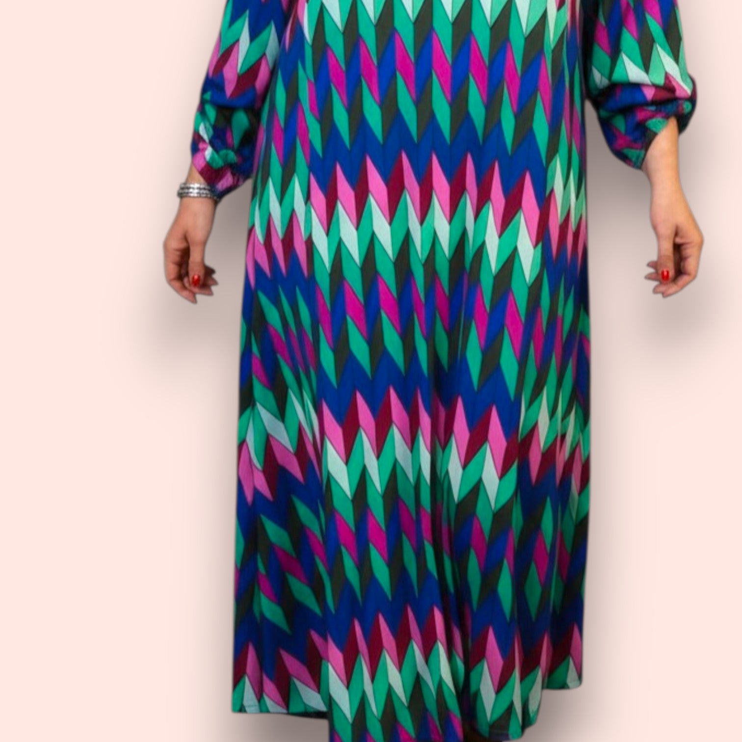 Il modello Ribes è un maxi abito manica lunga accorciabile di tessuto elasticizzato fantasia. Collo a V con taglio a trapezio, grandissima vestibilità, taglia unica, Made in Italy, colore FANATSIA