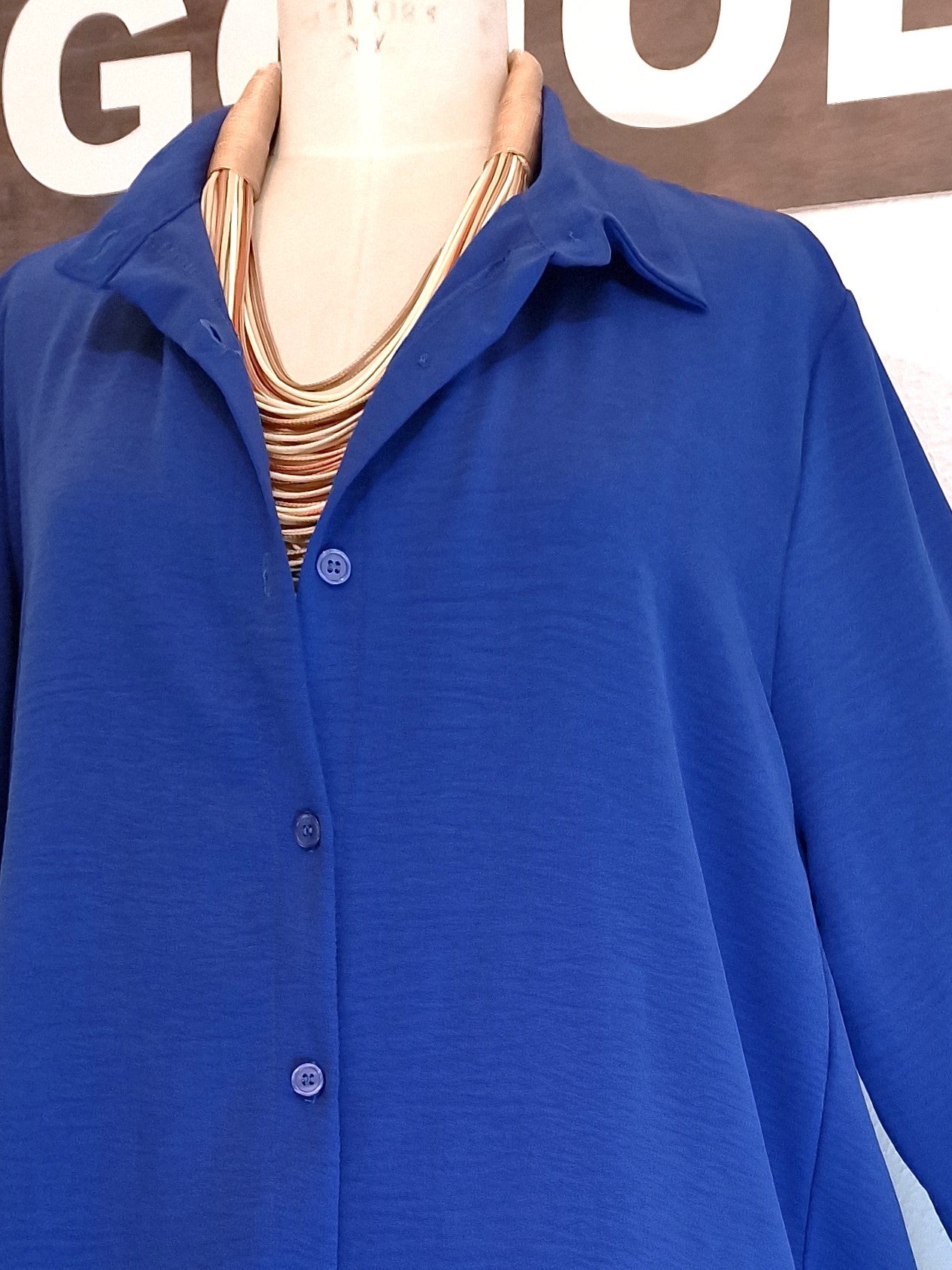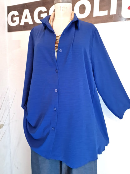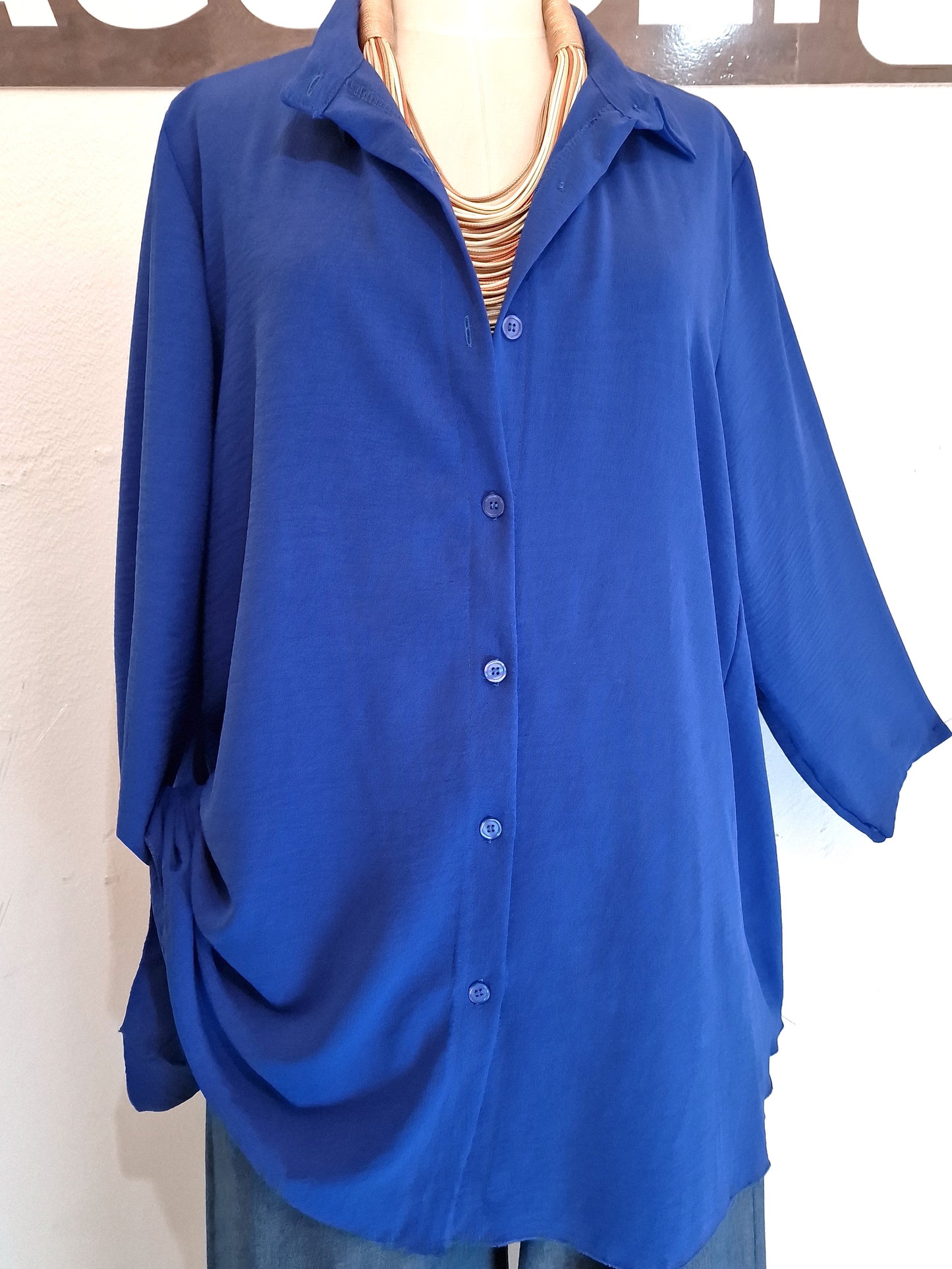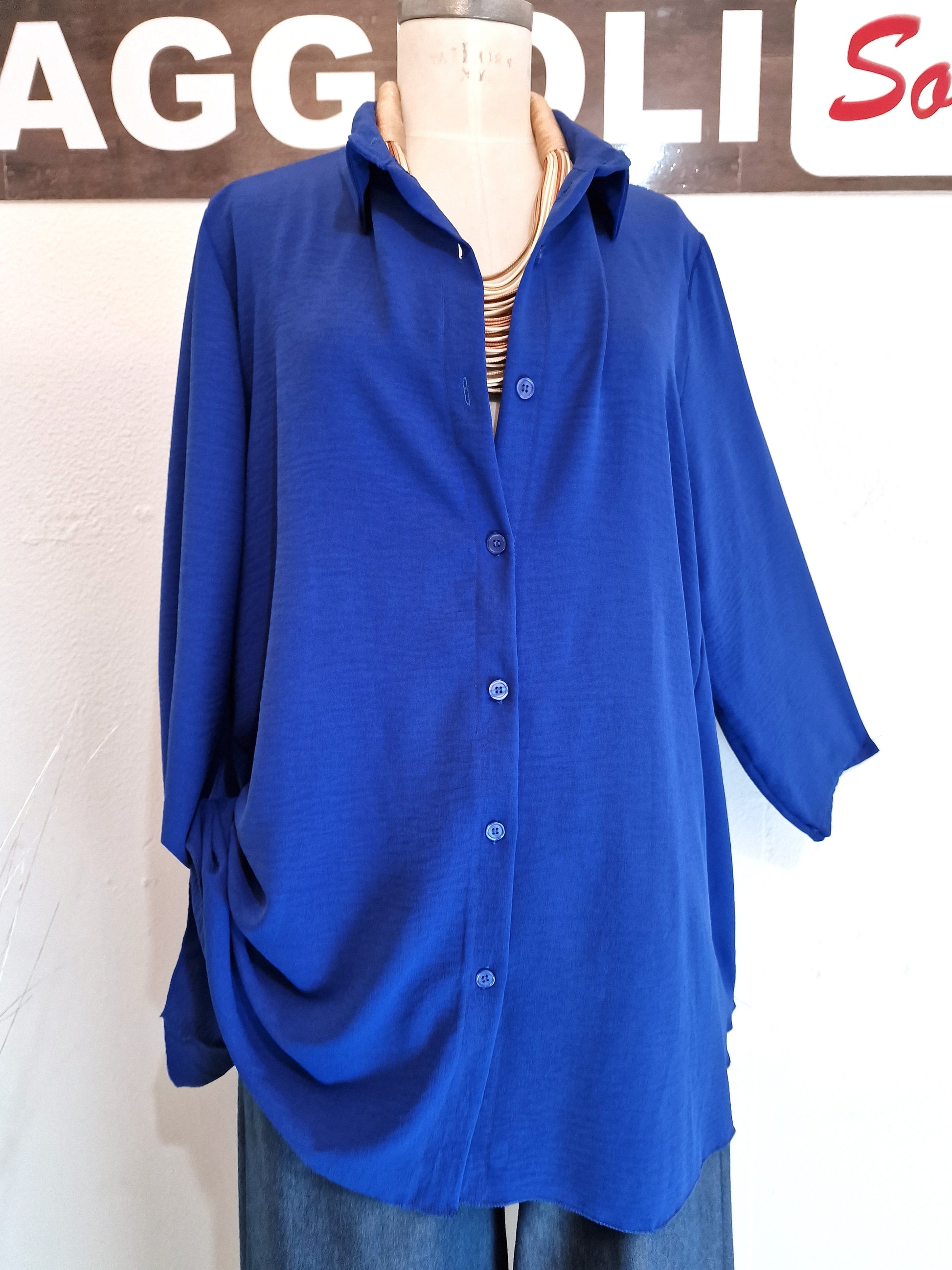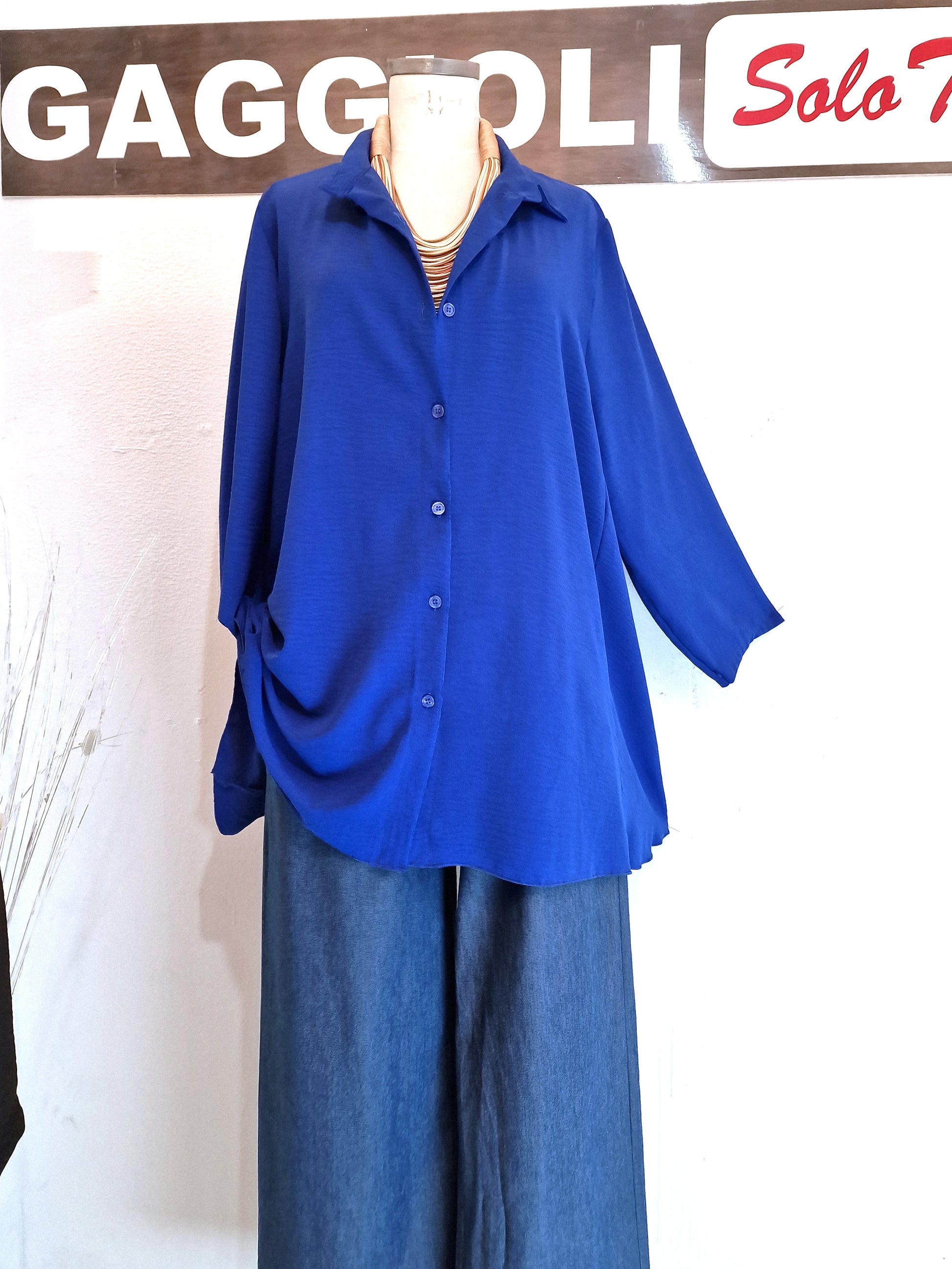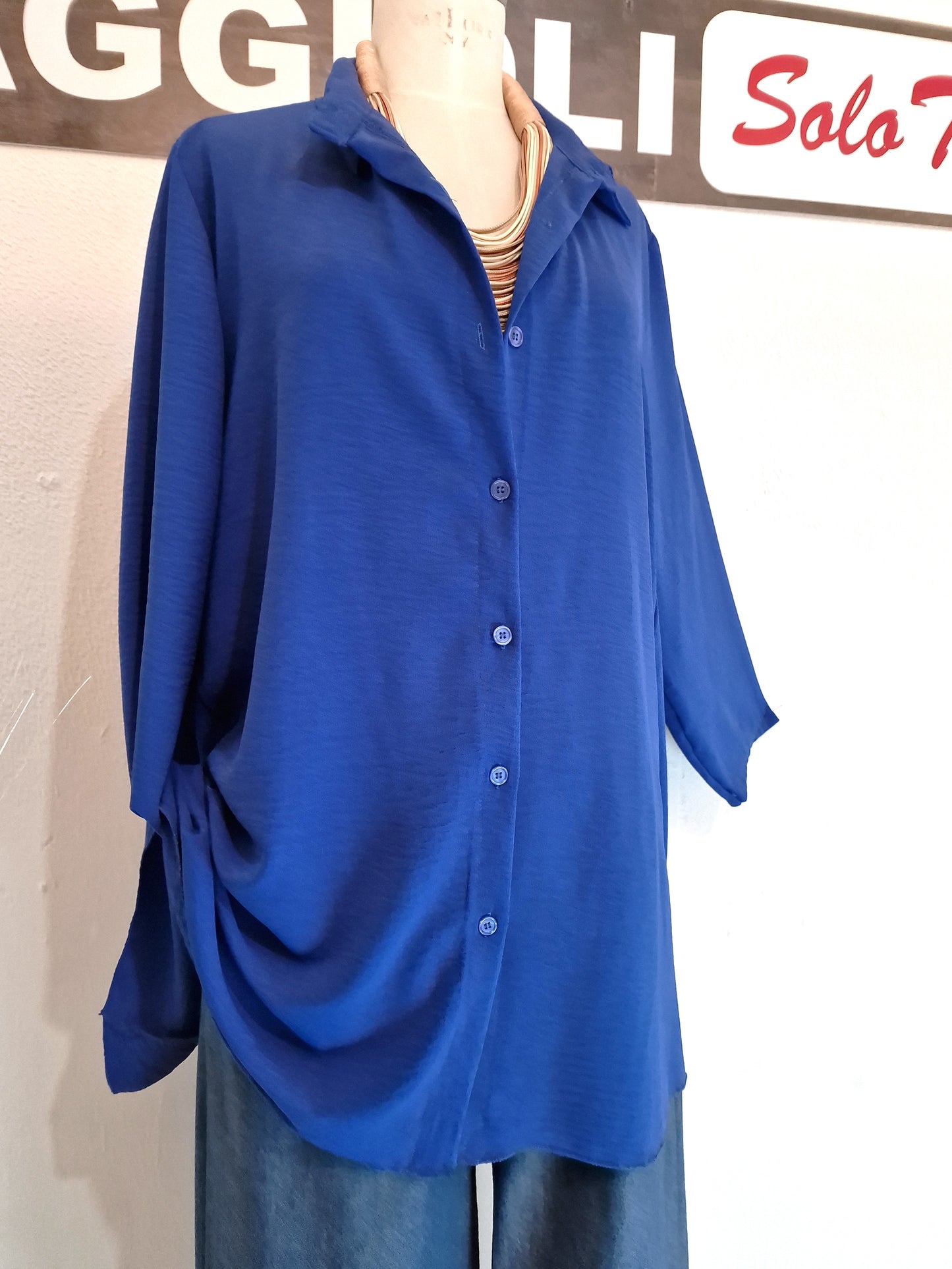 Il modello Esmeralda è una maxi camicia taglia grande in tessuto fermo di misto viscosa. Taglio a Trapezio con fianchi molto ampi. Grandissima vestibilità, Made in Italy, Taglia Unica, Colore Bluette.