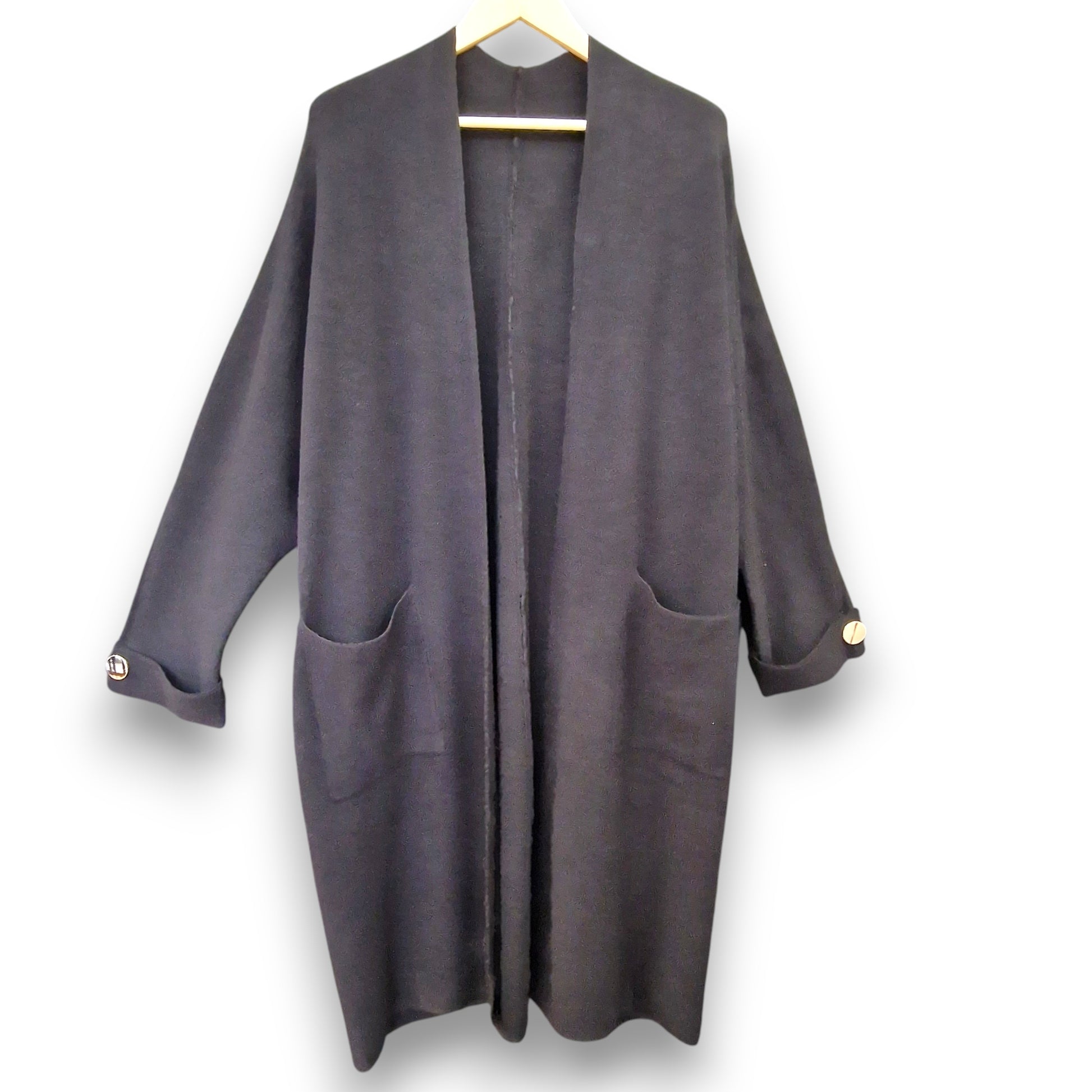 Il modello Melania è un Maxi Cardigan/Cappotto Taglia Grande Manica Pipistrello in tessuto elasticizzato di misto lana, viscosa e modal . Aperto davanti, manica con risvolto e bottone dorato e ampie tasche a toppa . Grandissima vestibilità, Questo modello è perfetto per il tuo look invernale.