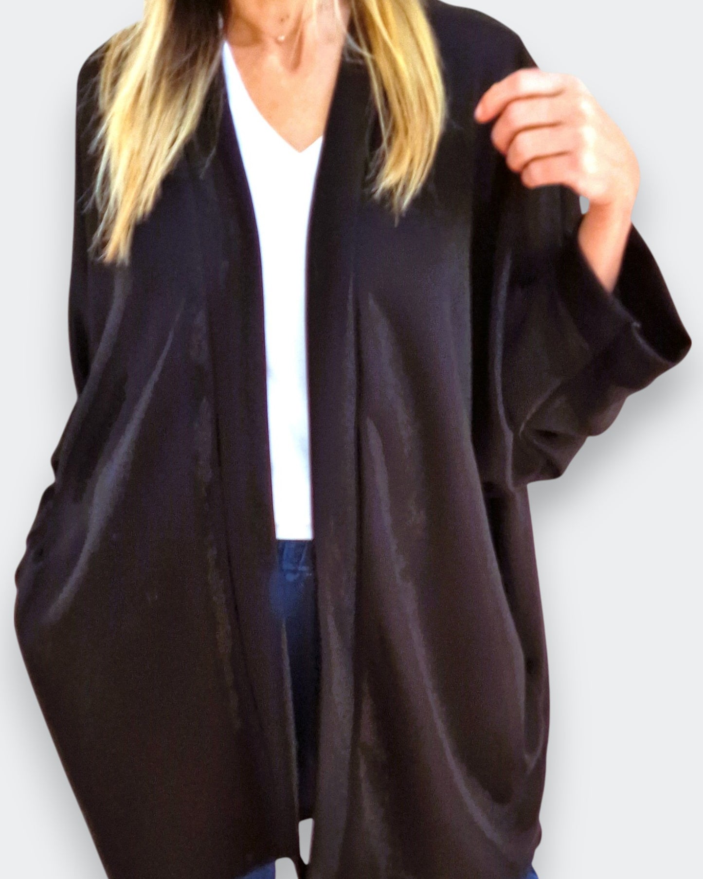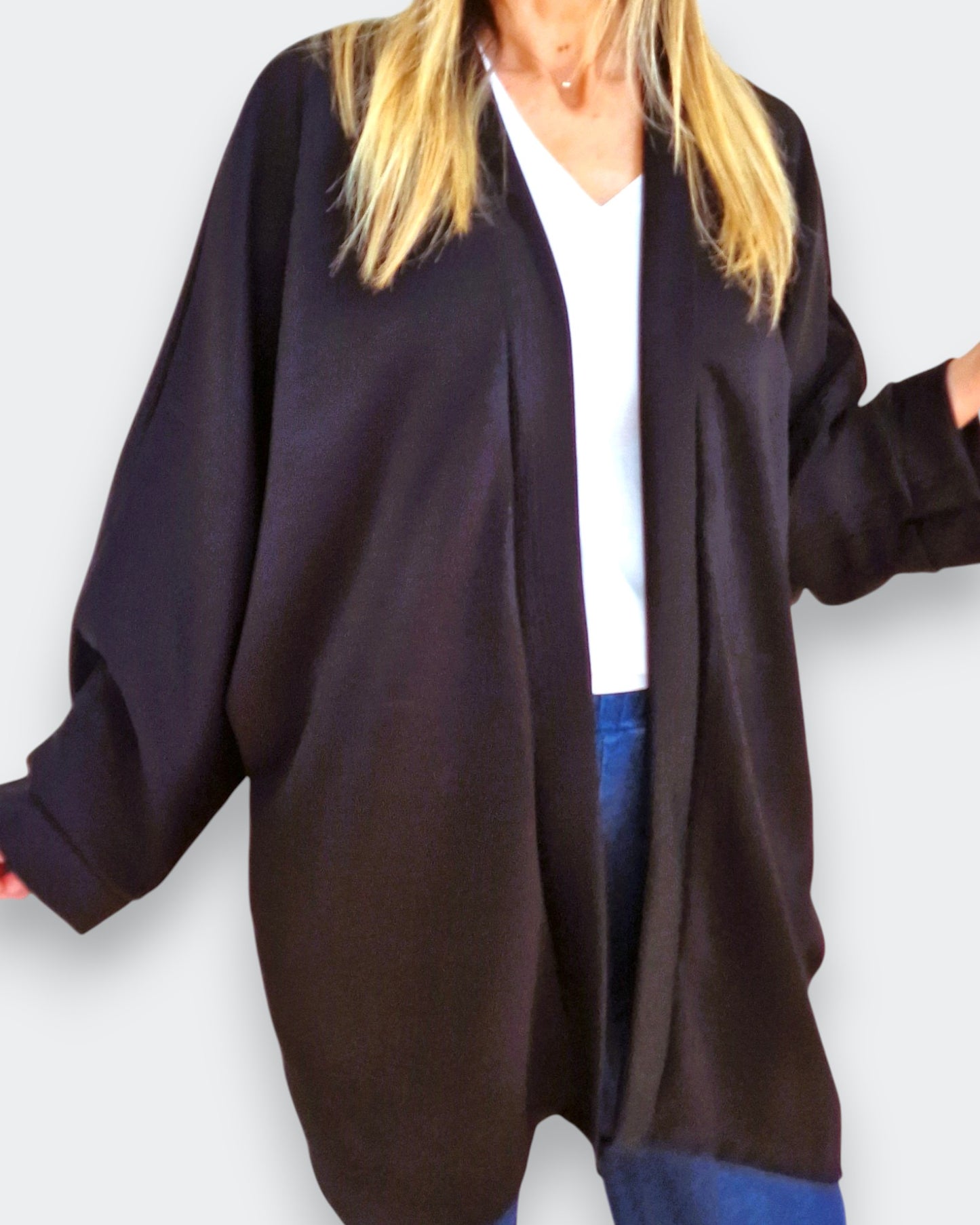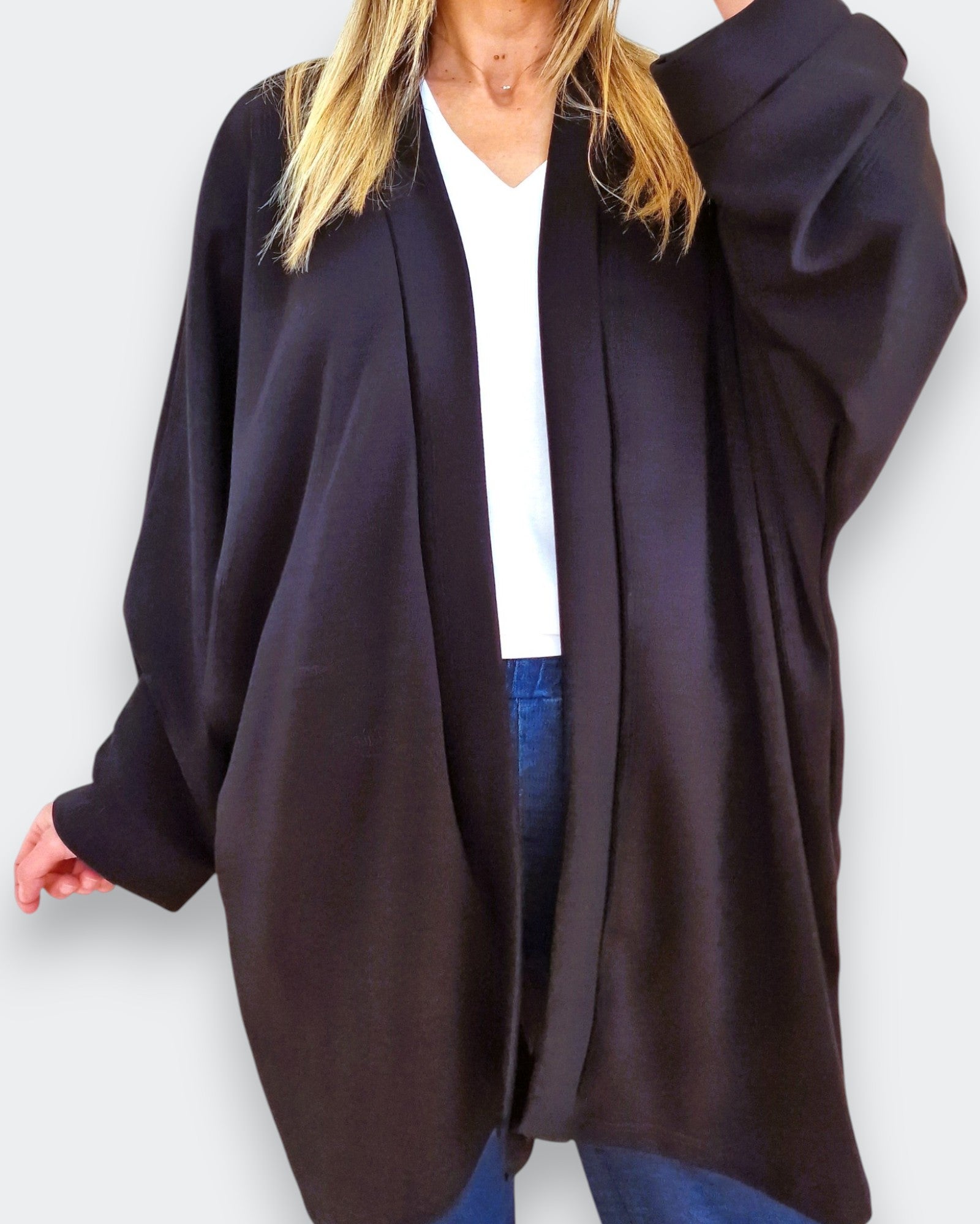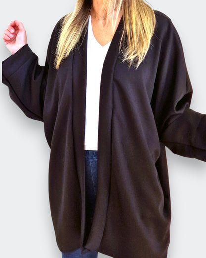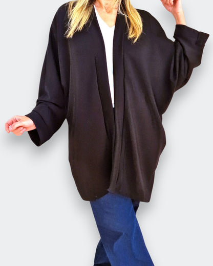 Il modello Wallis è un maxi cardigan / copri spalle in tessuto felpato con tasche e bordatura sul collo .E' realizzato in tessuto 95% viscosa . Il suo Taglio a kimono con manica pipistrello lo rendono un capo elegante e versatile allo stesso tempo ed è disponibile anche a completo con il pantalone dello stesso tessuto , Grandissima vestibilità, taglia unica, Made in Italy, colore Nero