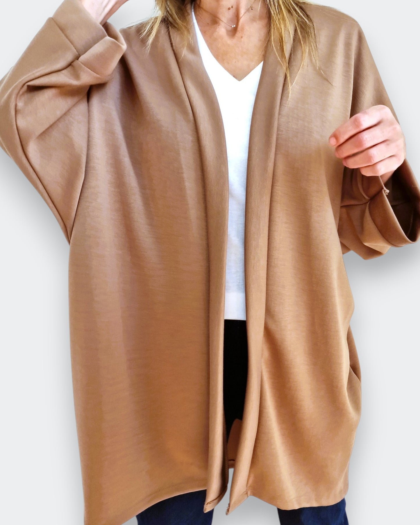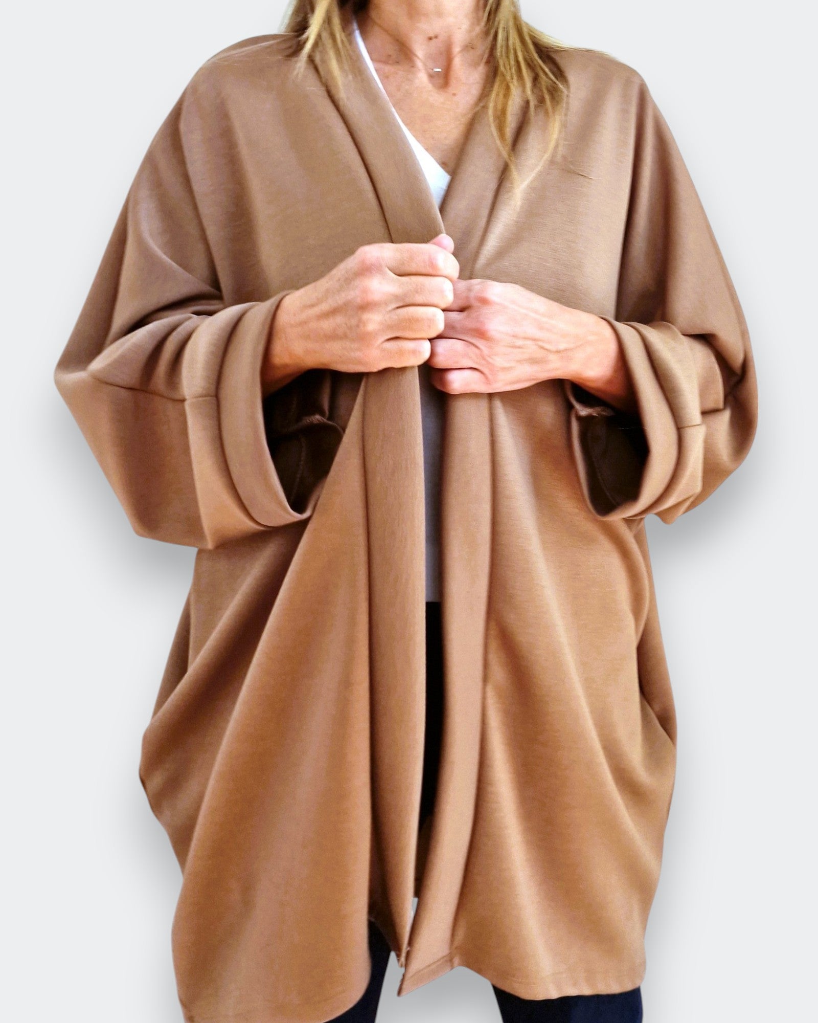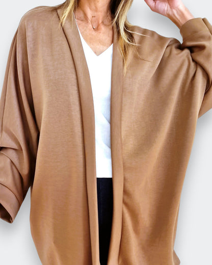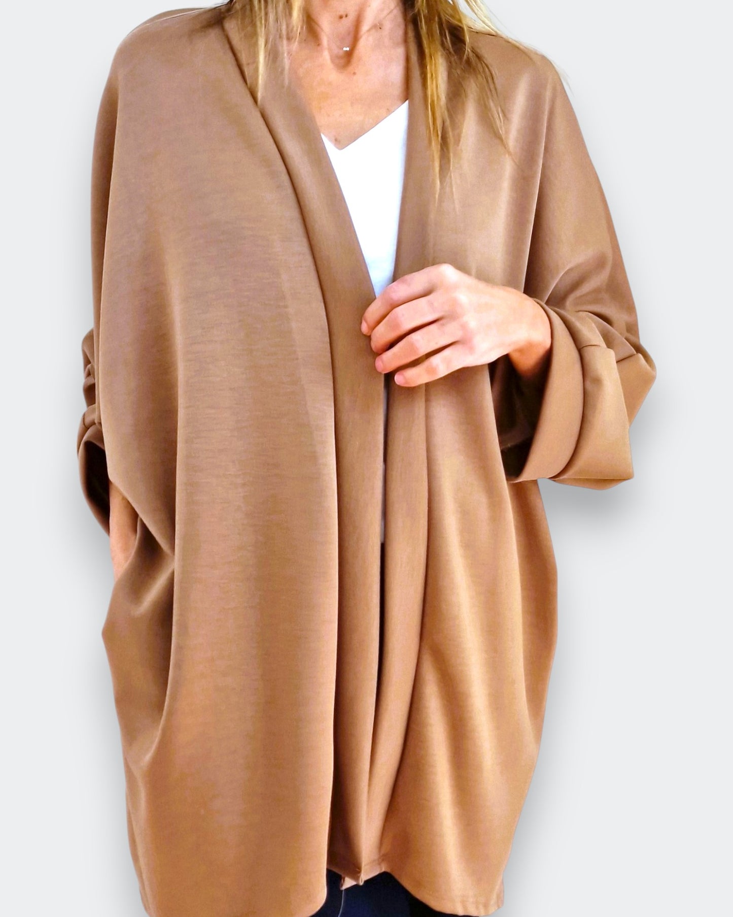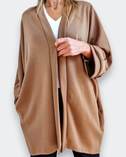 Il modello Wanda è un maxi cardigan / copri spalle in tessuto felpato con tasche e bordatura sul collo. E' realizzato in tessuto 95% viscosa . Il suo Taglio a kimono con manica pipistrello lo rendono un capo elegante e versatile allo stesso tempo ed è disponibile anche a completo con il pantalone dello stesso tessuto , Grandissima vestibilità, taglia unica, Made in Italy, colore Cammello