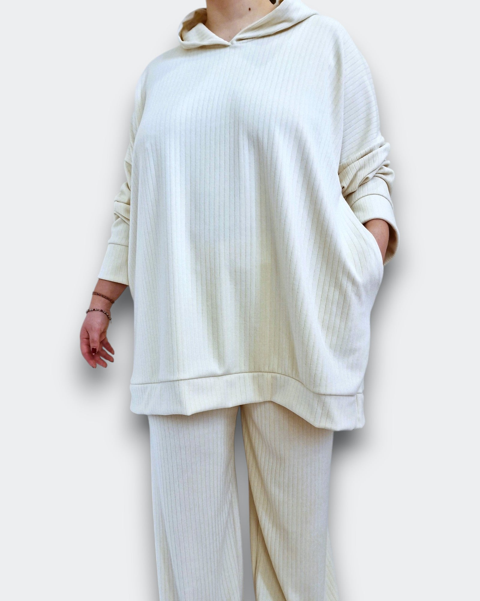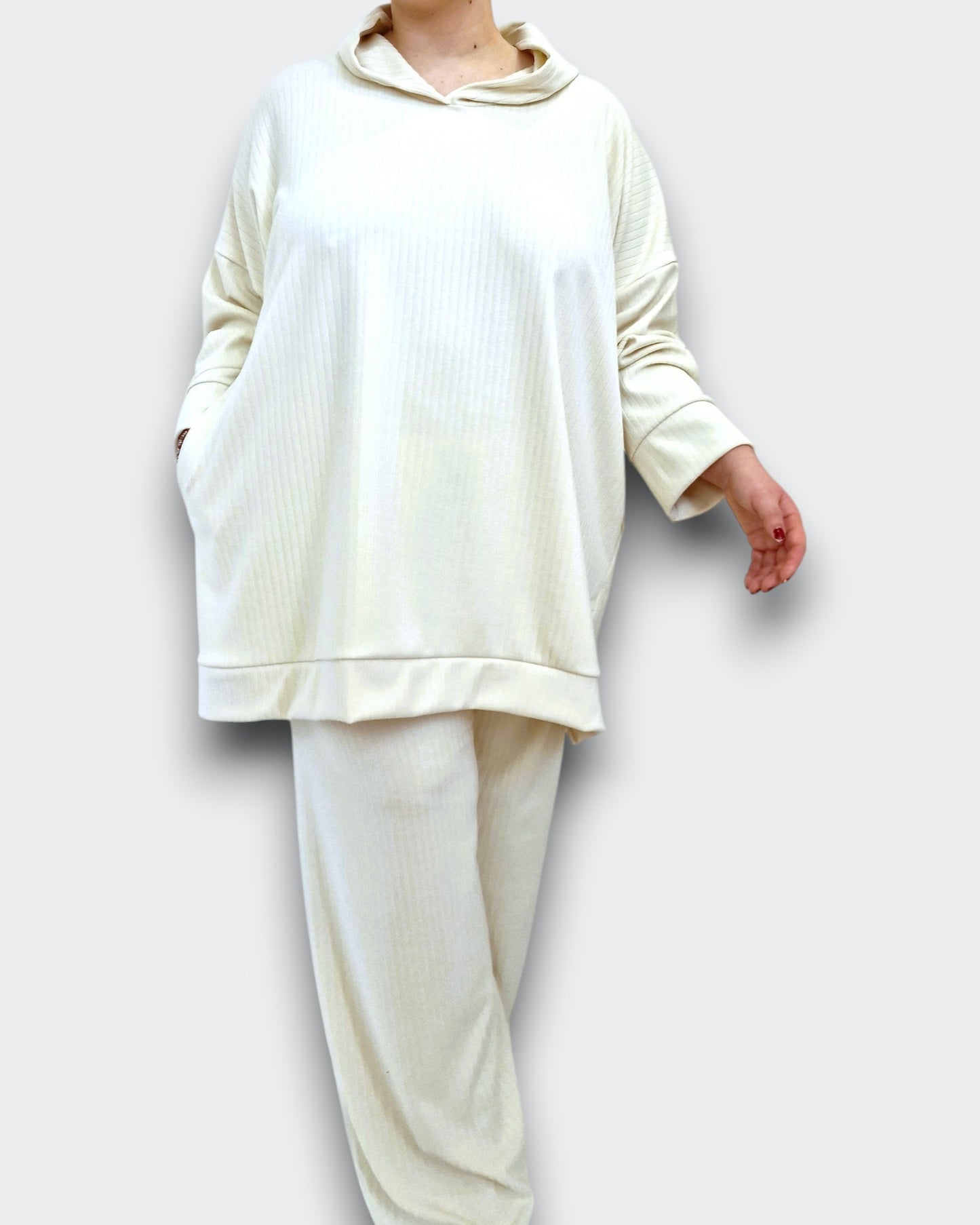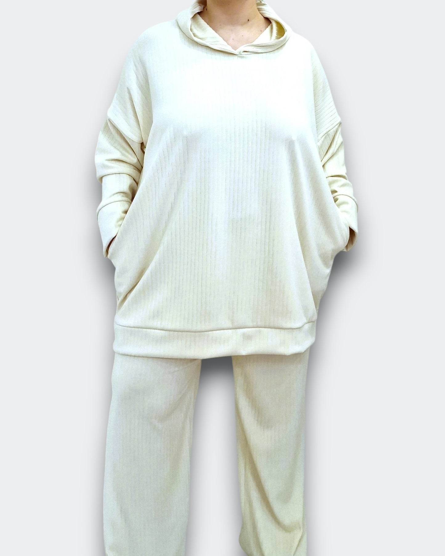 Il completo / tuta Emma è composto da una maxi felpa in tessuto elasticizzato di ciniglia cannttè con tasche e cappuccio e dal pantalone dello stesso tessuto e colore . E' realizzato in tessuto di felpa elasticizzata 50% viscosa . Il suo Taglio ampio ed il pantalone a palazzo lo rendono un capo chic e versatile allo stesso tempo