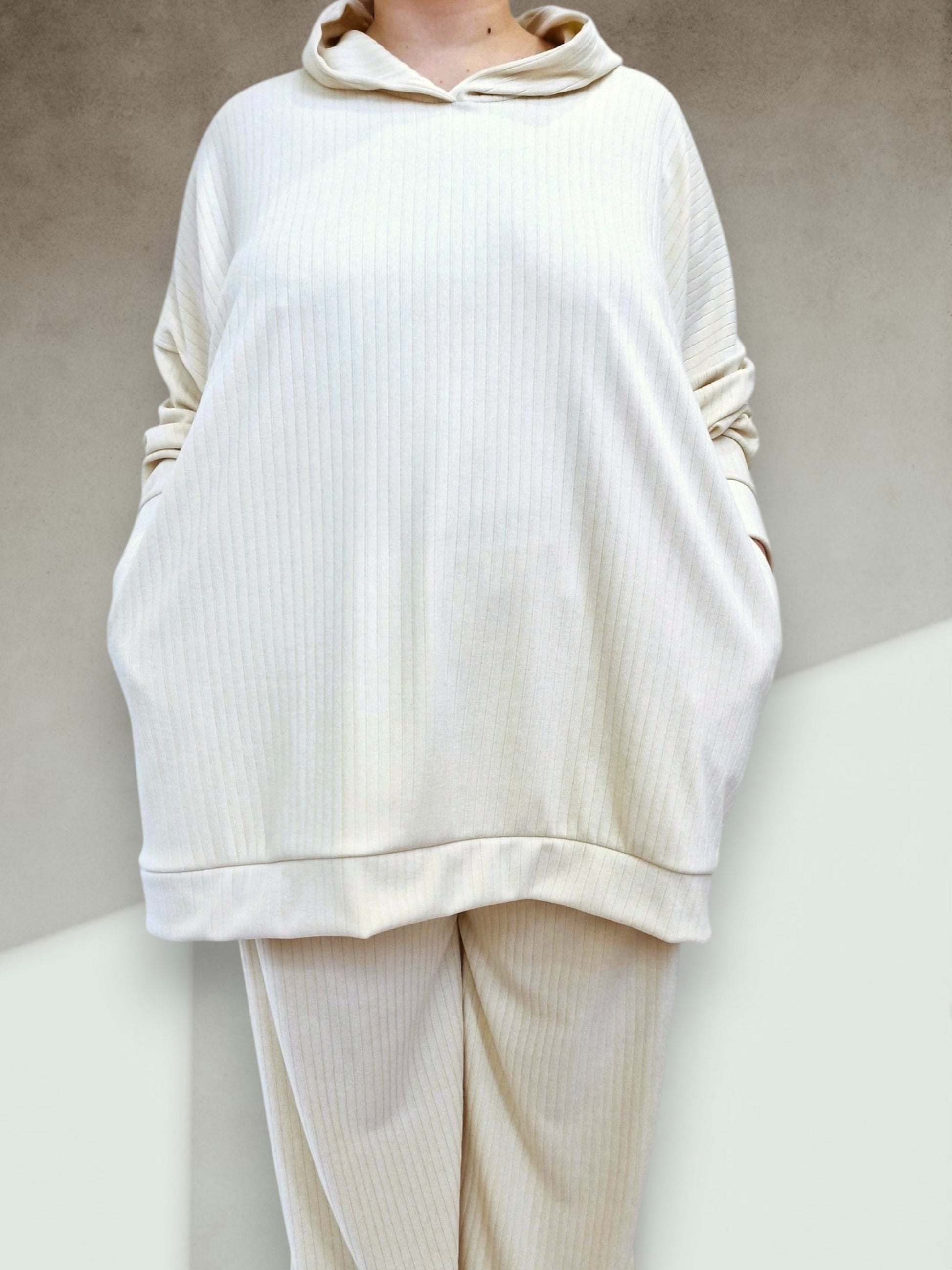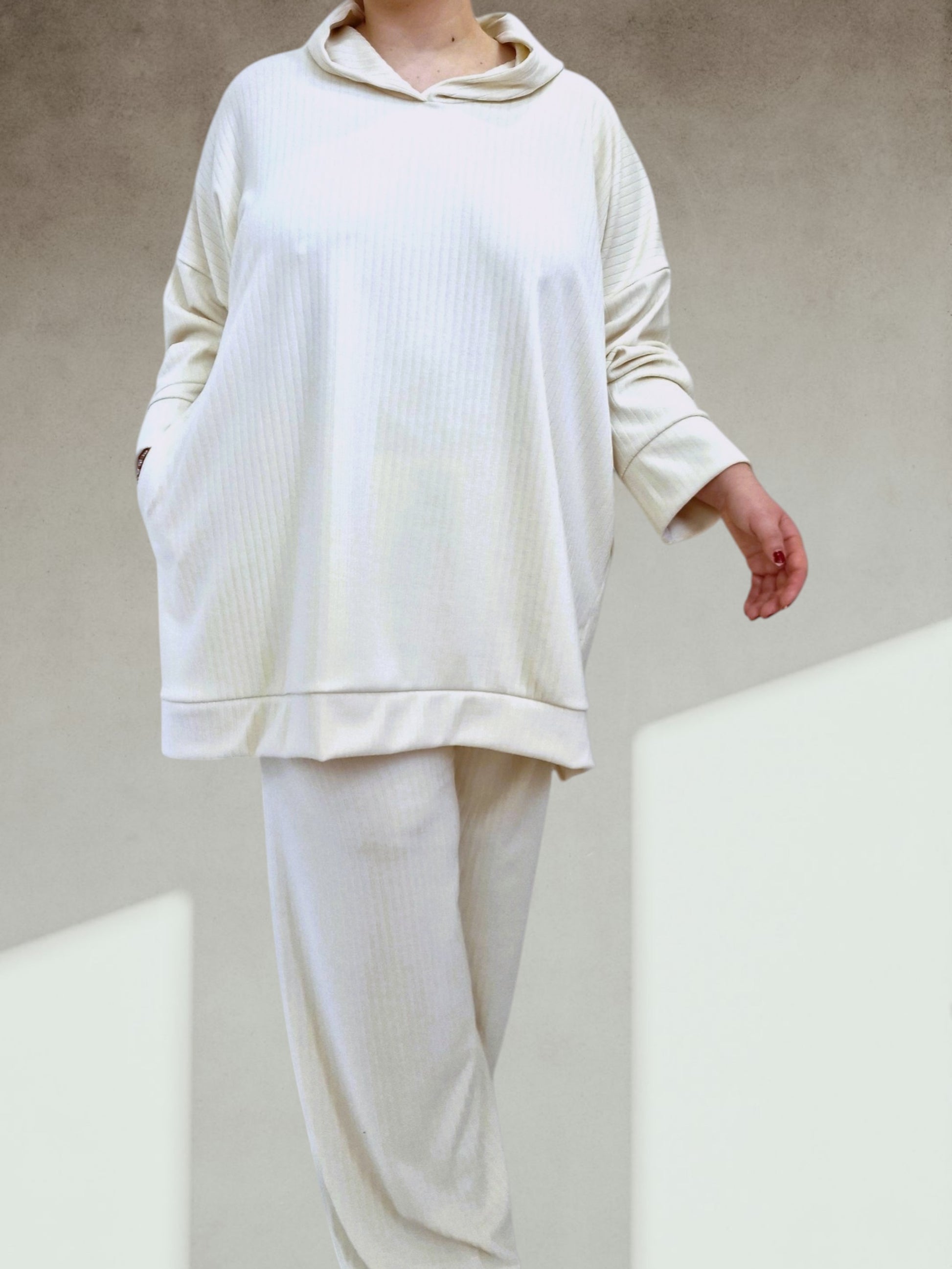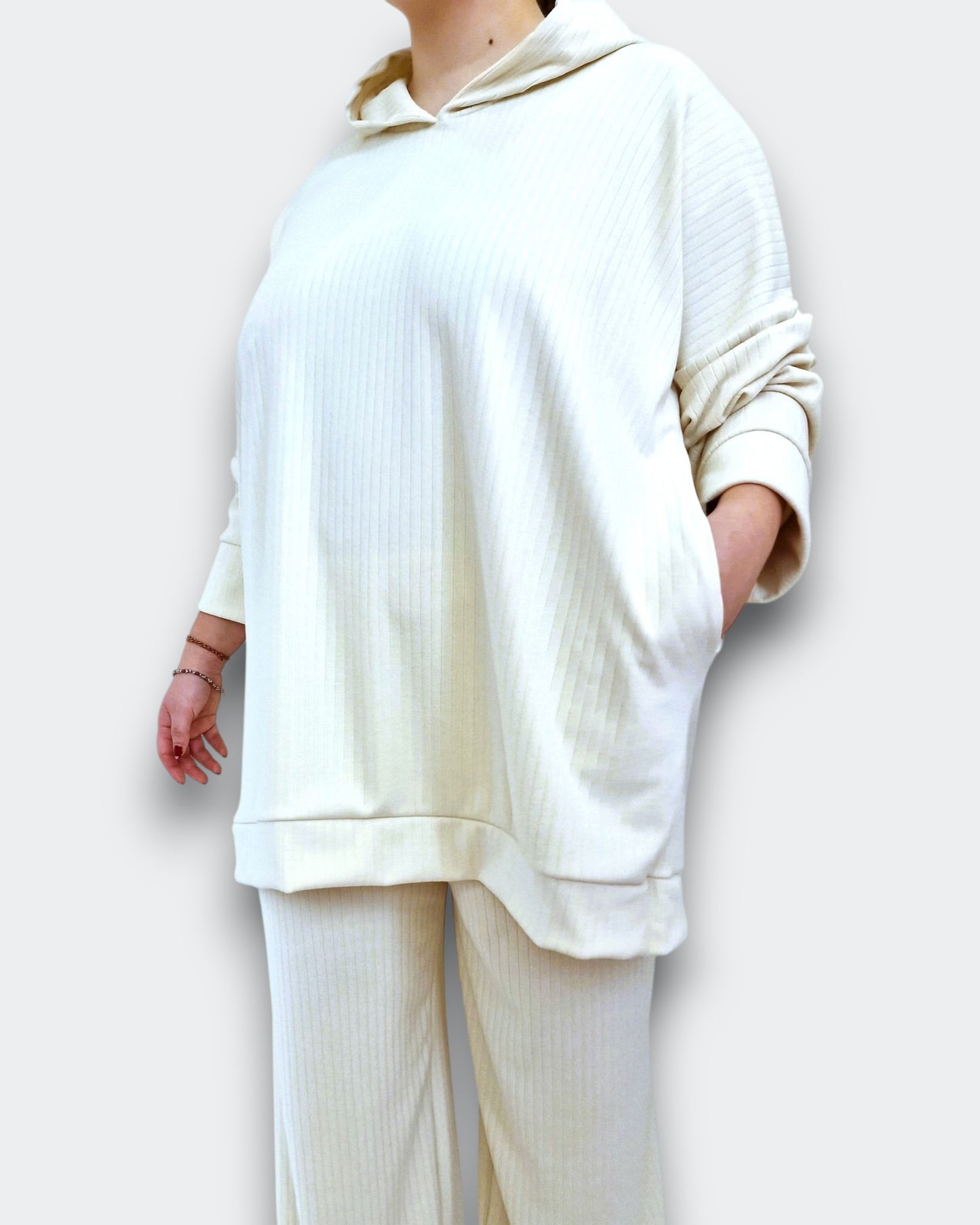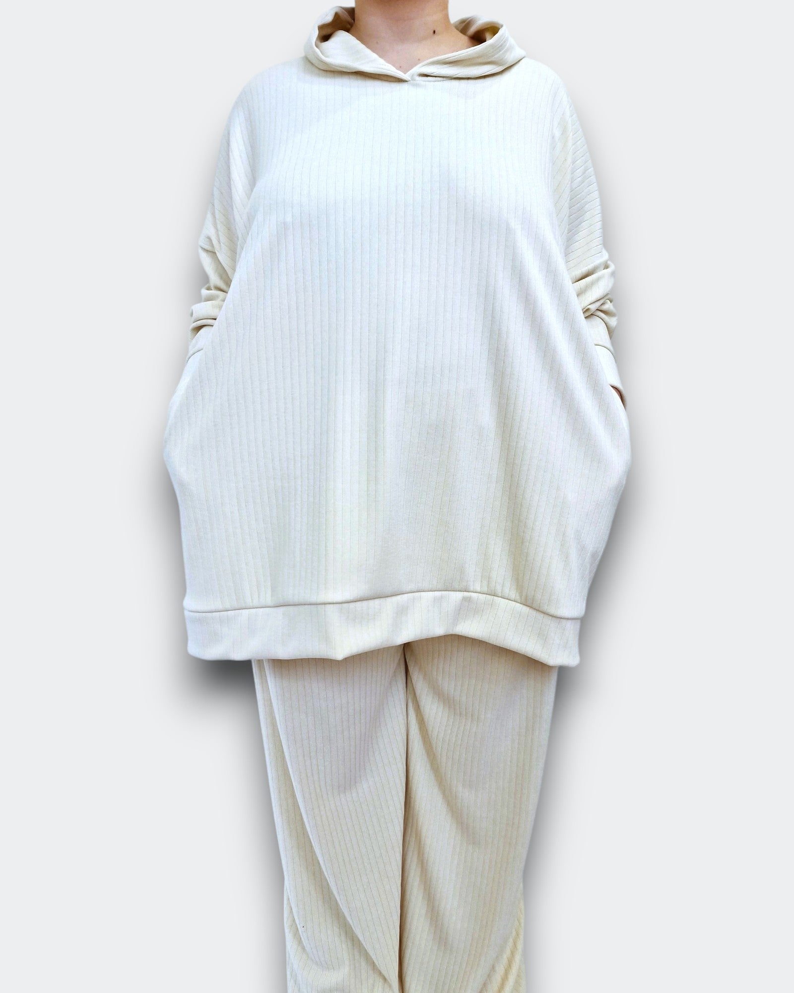 Il completo / tuta Emma è composto da una maxi felpa in tessuto elasticizzato di ciniglia cannttè con tasche e cappuccio e dal pantalone dello stesso tessuto e colore . E' realizzato in tessuto di felpa elasticizzata 50% viscosa . Il suo Taglio ampio ed il pantalone a palazzo lo rendono un capo chic e versatile allo stesso tempo