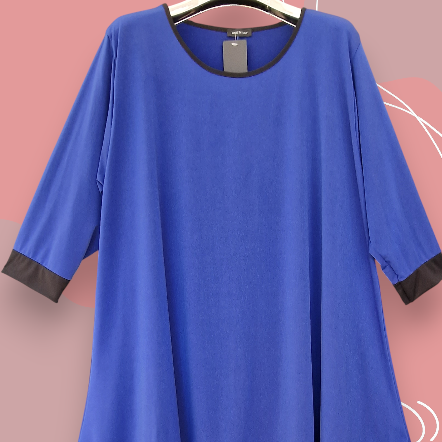 Il completo Nora è composto dalla maglia in crepe di misto viscosa elasticizzata manica 3/4 con bordature a contrasto e il pantalone con elastico in vita dello stesso tessuto . La maglia bordata ed il pantalone a palazzo lo rendono elegante e versatile allo stesso tempo