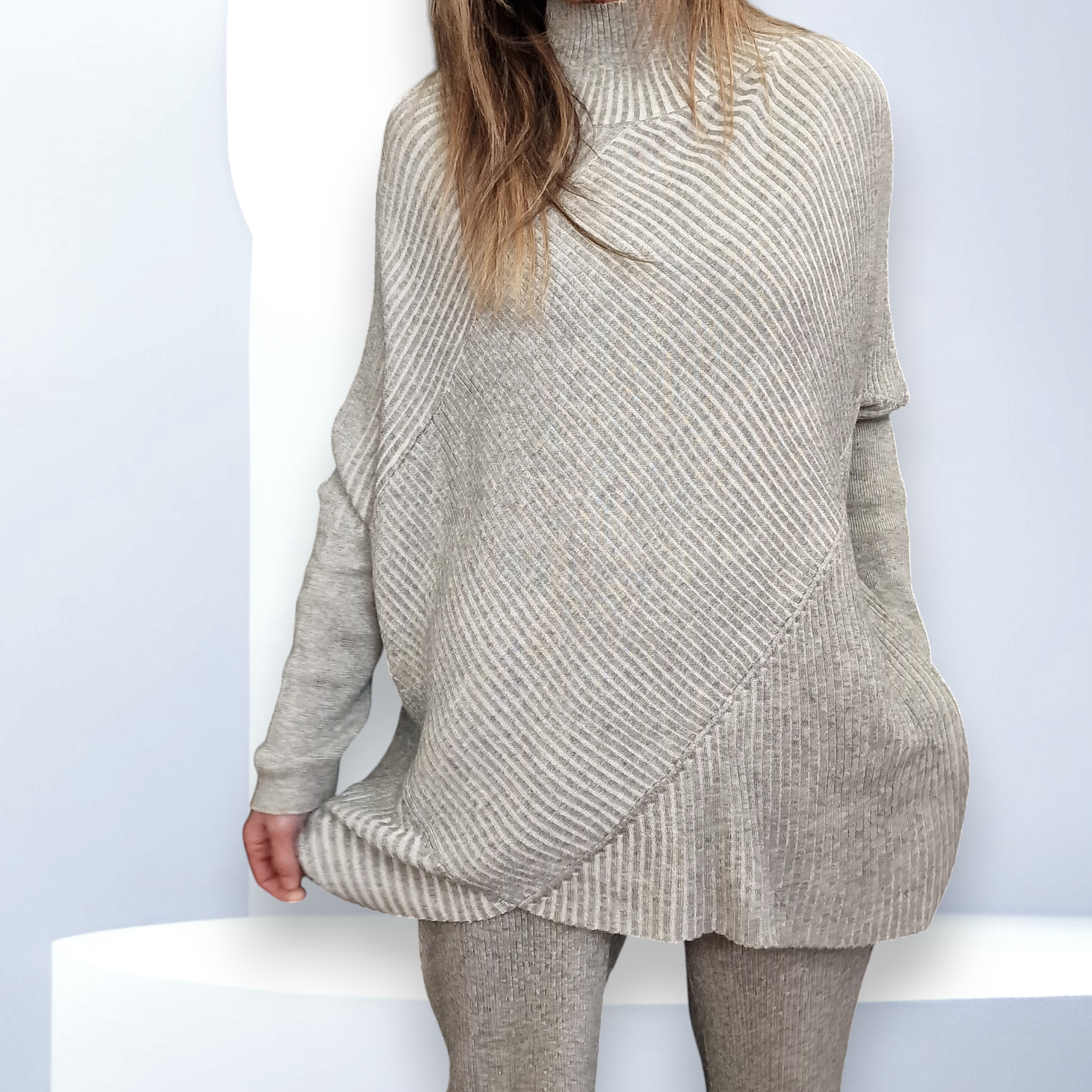 Il completo / tuta Edmond è composto da una Maxi Maglia in tessuto elasticizzato effetto lana cannttè con con tagli trasversali e orlo asimmetrico e dal pantalone a palazzo dello stesso tessuto e colore . Il suo Taglio ampio ed il pantalone a palazzo lo rendono un capo chic e versatile allo stesso tempo