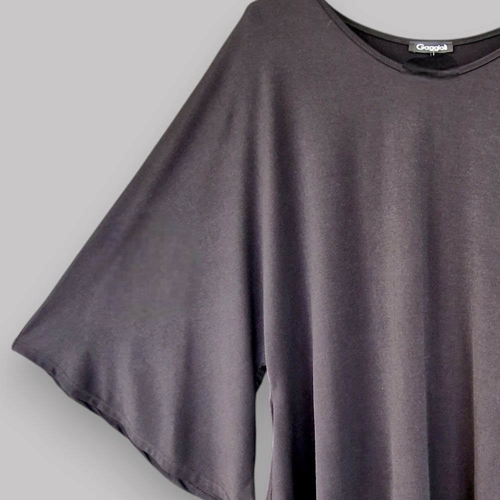 Il completo Gloria è composto dalla maglia in crepe di misto viscosa elasticizzata manica a Kimono e orlo stondato e il pantalone palazzo con elastico in vita dello stesso tessuto e colore . La maglia molto ampia ed il pantalone a palazzo lo rendono elegante e versatile con una grandissima vestibilità