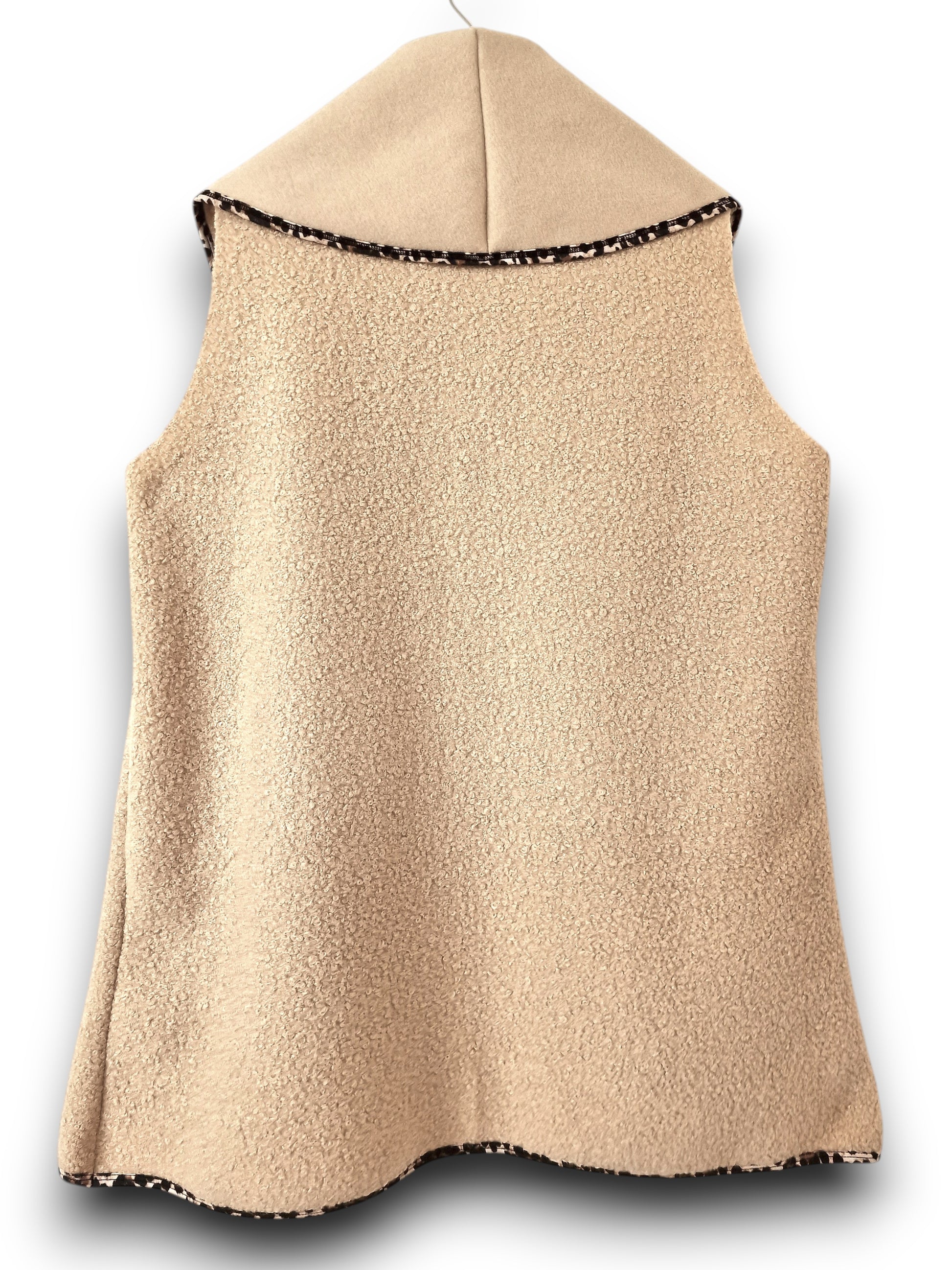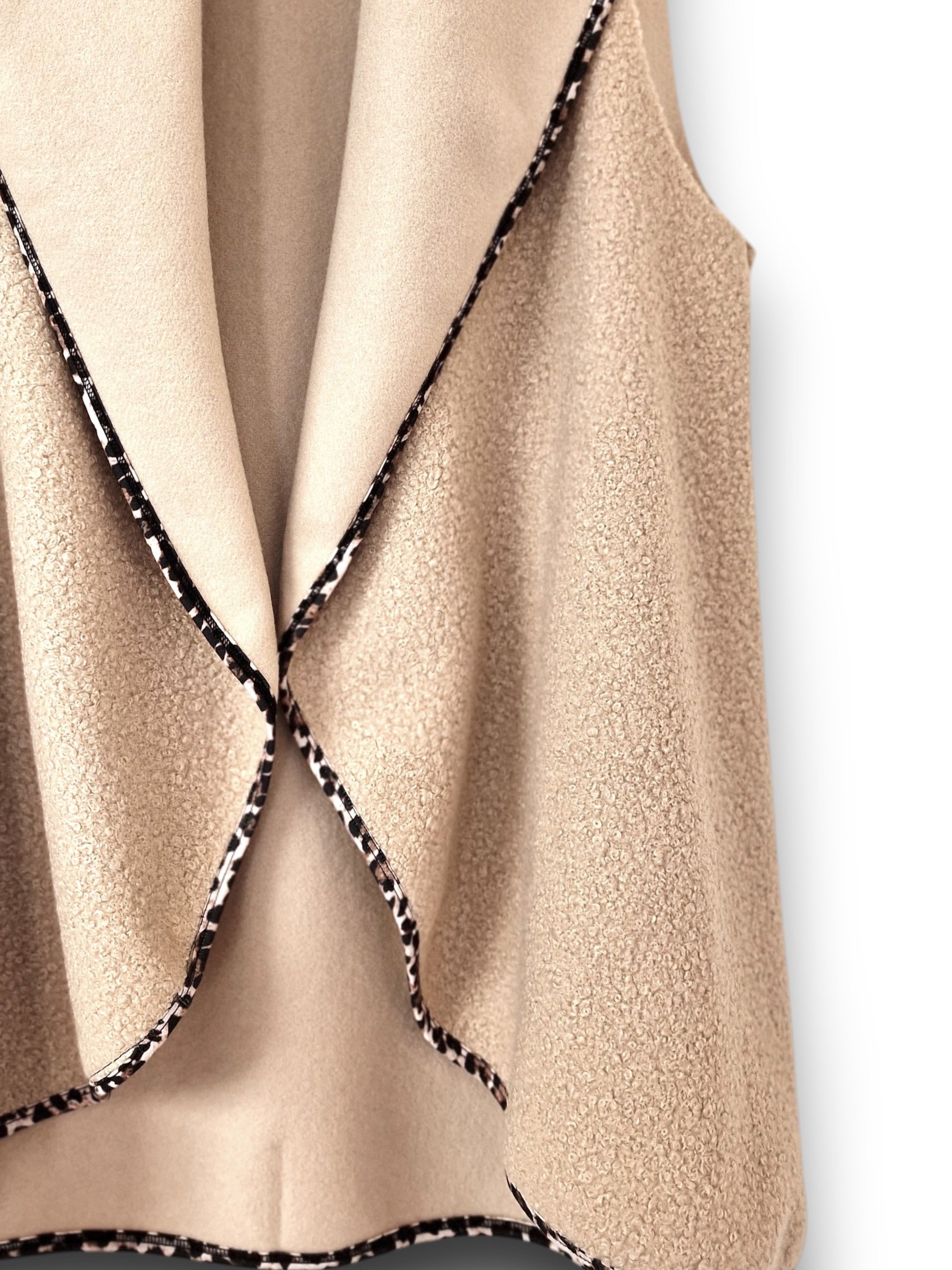 Scopri il nostro Maxi Gilet Taglie Forti Leda, un capo versatile e confortevole, perfetto per questa stagione. Realizzato in tessuto di lana cotta con un grande collo sciallato a contrasto e bordatura in tessuto maculato. Questo gilet offre grande vestibilità e stile. La bordatura e la particolarità del taglio aggiungono un tocco raffinato e casual al tuo look quotidiano.