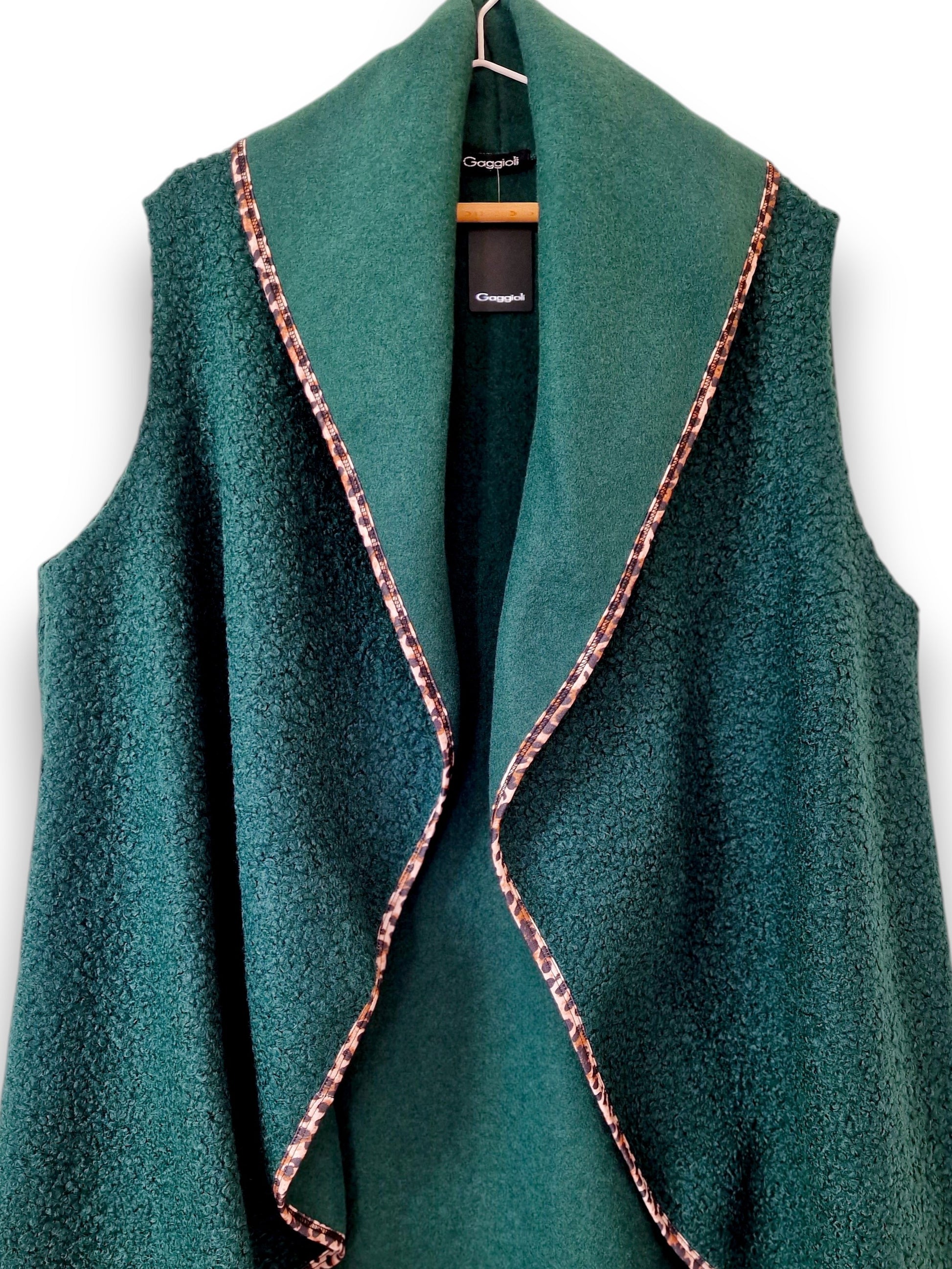 Scopri il nostro Maxi Gilet Taglie Forti Licia, un capo versatile e confortevole, perfetto per questa stagione. Realizzato in tessuto di lana cotta con un grande collo sciallato a contrasto e bordatura in tessuto maculato. Questo gilet offre grande vestibilità e stile. La bordatura e la particolarità del taglio aggiungono un tocco raffinato e casual al tuo look quotidiano.