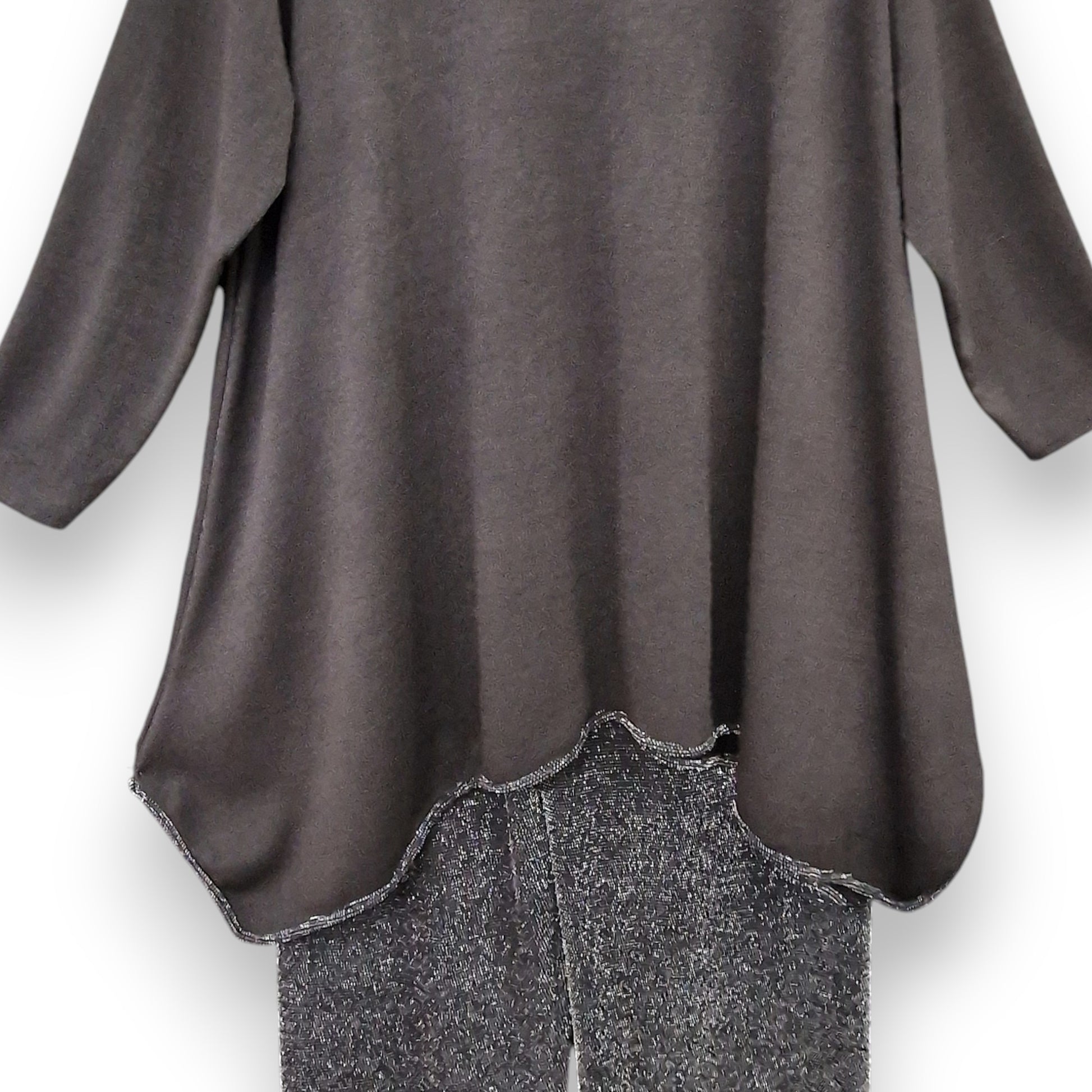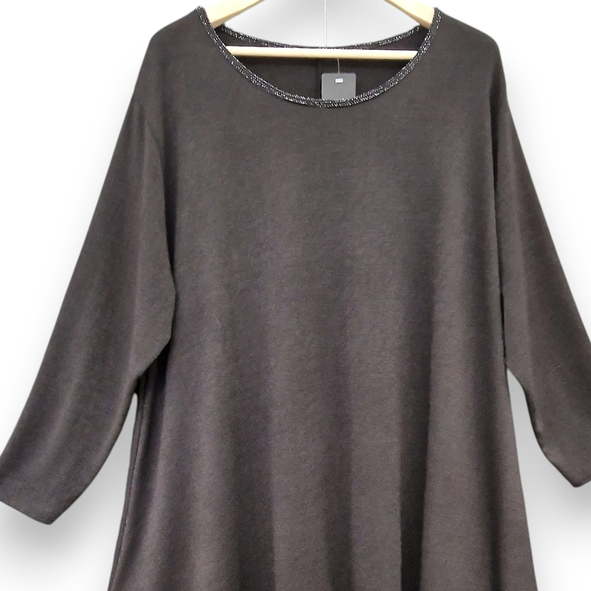 Scopri la Maxi Maglia Taglie Forti Gioele in misto viscosa elasticizzata invernale tinta unita con Bordature in lurex Argentato Girocollo con taglio a trapezio per una grandissima vestibilità, Questa maglia è abbinabile con il pantalone palazzo in lurex Silver
