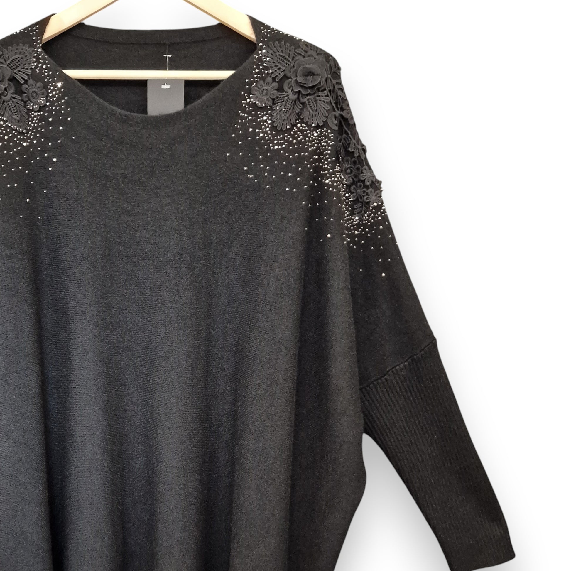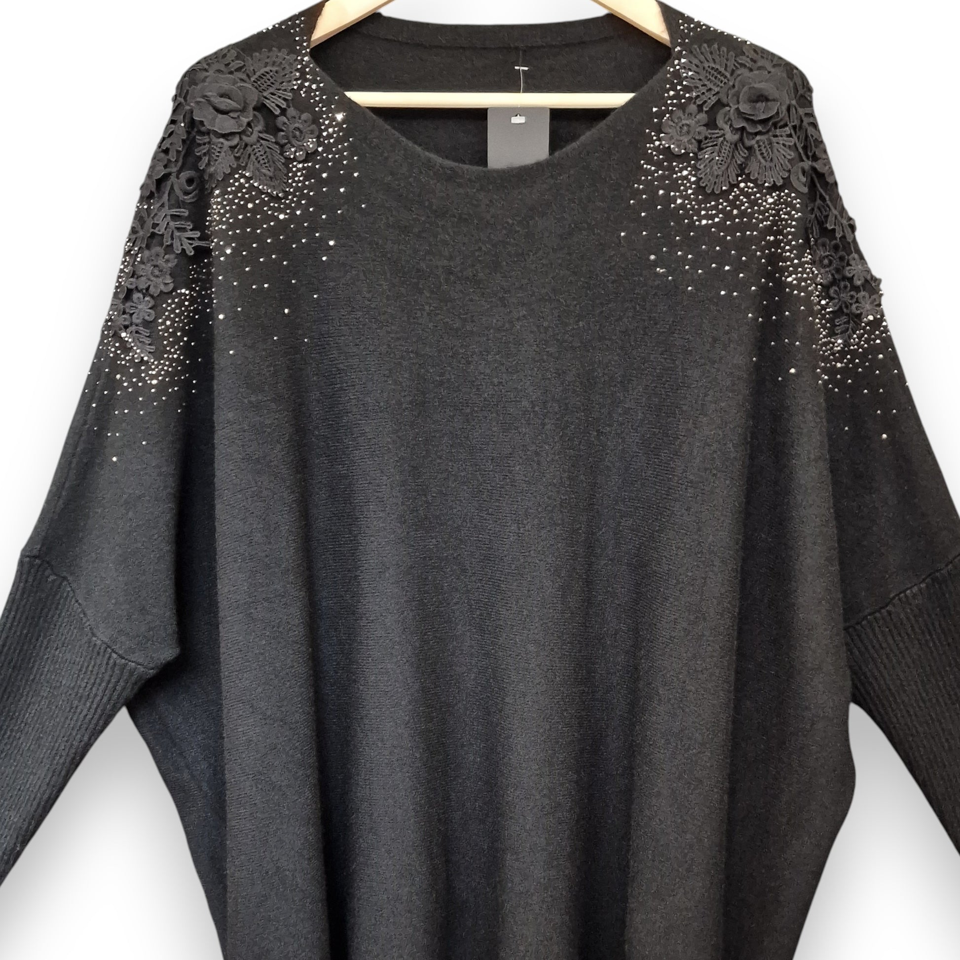 Il modello Olly è una Maxi Maglia Taglia Grande Manica lunga in tessuto elasticizzato di misto viscosa e modal effetto lana. Girocollo con applicazione di fiori e Strass sulle spalle. Manica Pipistrello e frange sull'orlo .Grandissima vestibilità, Questo modello è perfetto per chi cerca una maglia più elegante , ma con una grandissima vestibilità. Ottima per le serate più eleganti