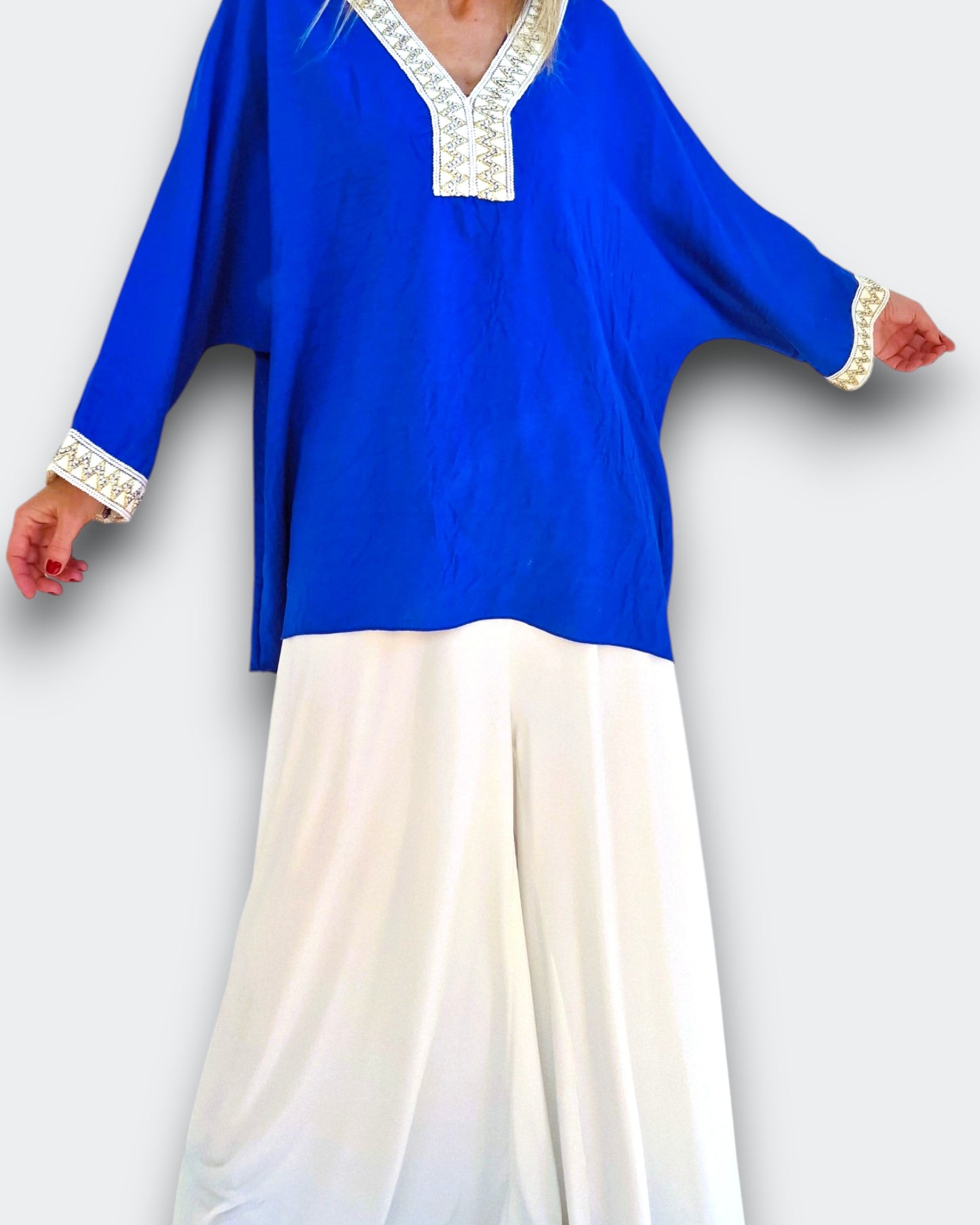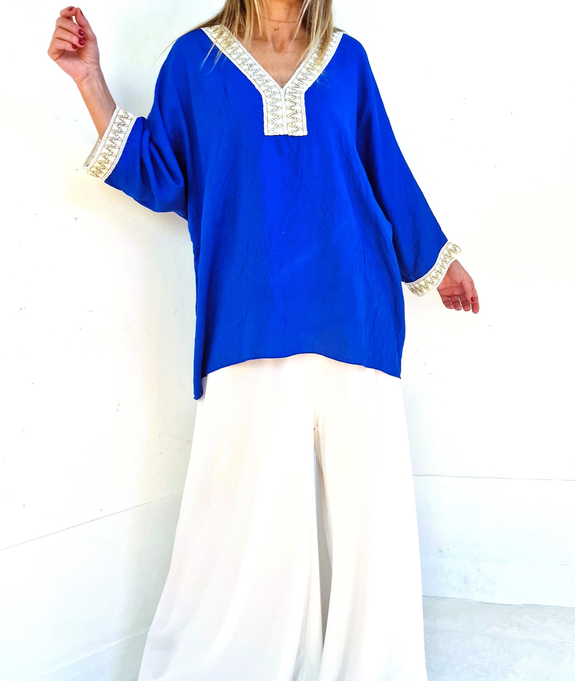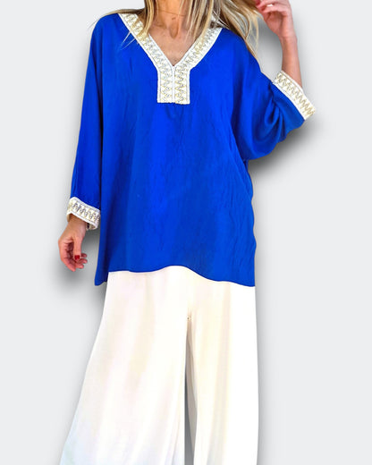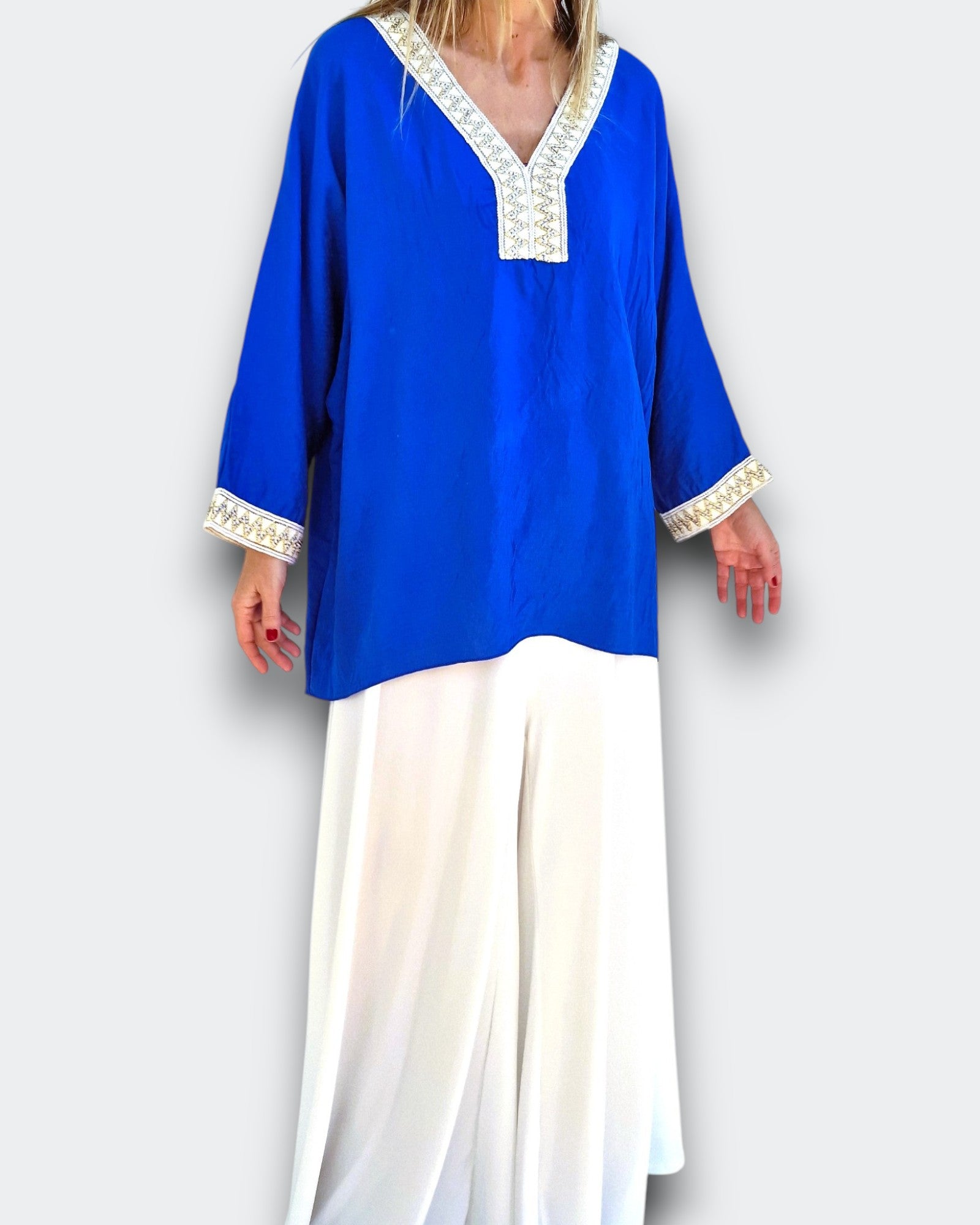 Scopri la Maxi Maglia Taglie Forti Iaia in viscosa tinta unita con applicazione di passamaneria sul collo e sulle maniche . Collo a v con manica 3/4 , Ottima vestibilità ,Questo Maglia offre un ottima vestibilità e stile e le applicazioni donano un tocco esotico al tuo look quotidiano .