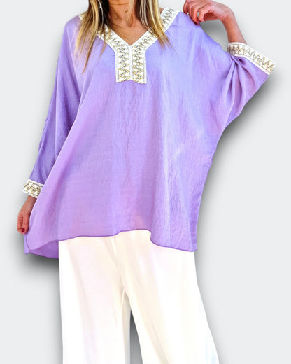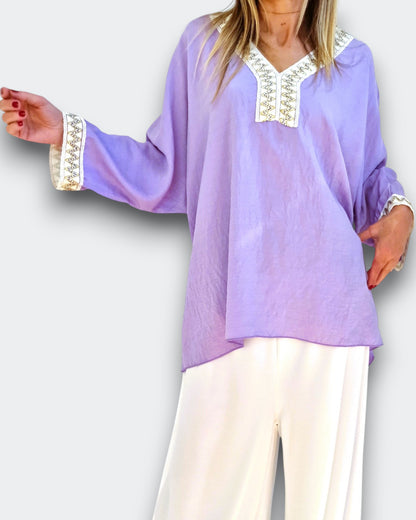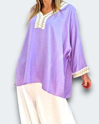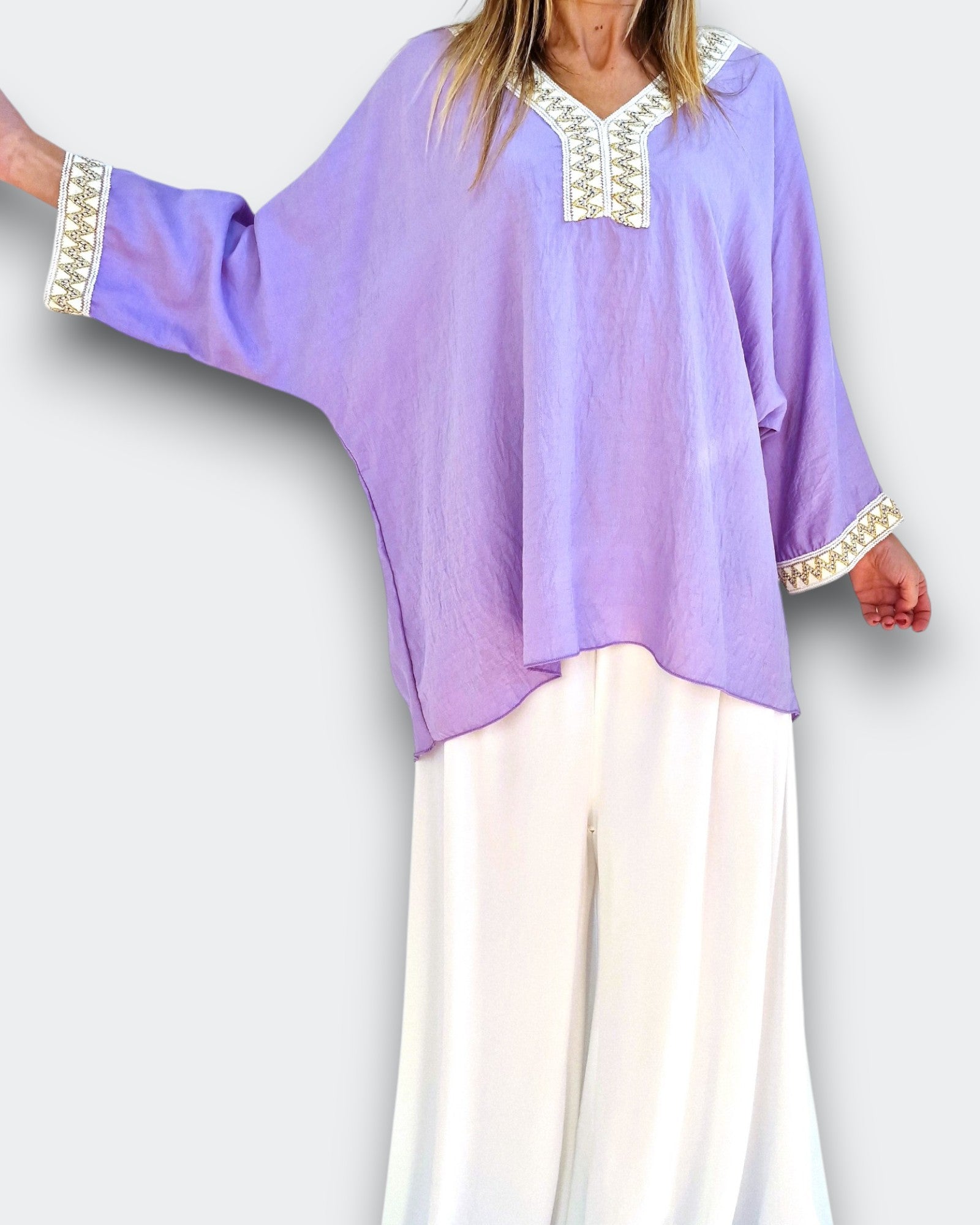 Scopri la Maxi Maglia Taglie Forti Ingrid in viscosa tinta unita con applicazione di passamaneria sul collo e sulle maniche . Collo a v con manica 3/4 , Ottima vestibilità ,Questo Maglia offre un ottima vestibilità e stile e le applicazioni donano un tocco esotico al tuo look quotidiano .