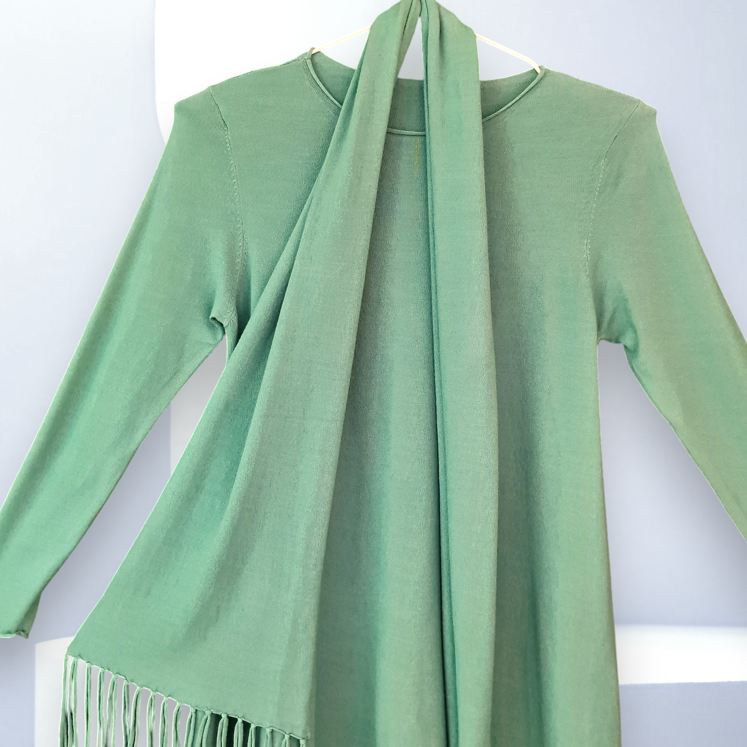 Scopri la Maxi Maglia più Sciarpa Taglie Forti Travis, in misto viscosa elasticizzata invernale effetto lana Girocollo con taglio a trapezio e una splendida Sciarpa con frange abbinata dello stesso colore e tessuto. Ottima vestibilità,