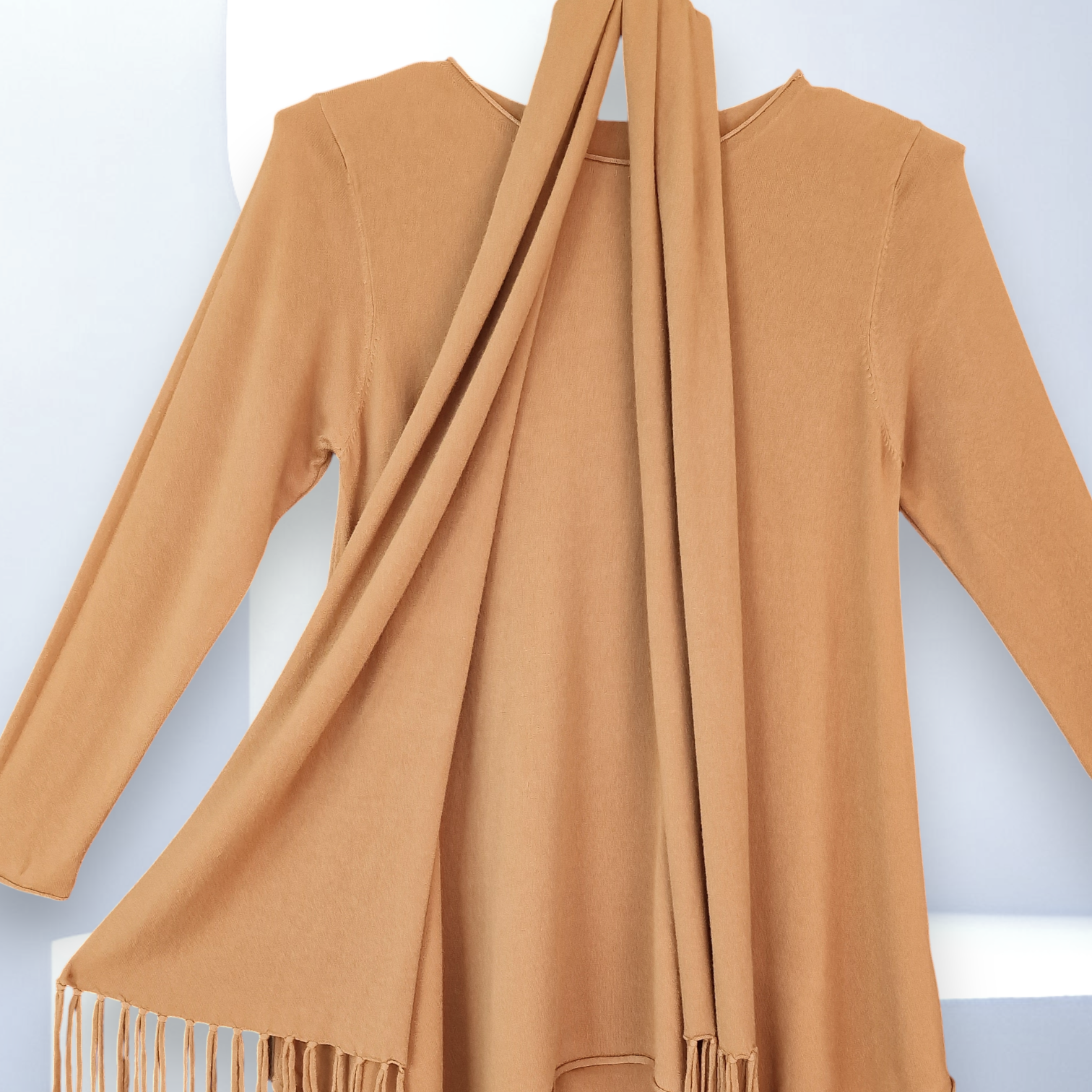 Scopri la Maxi Maglia più Sciarpa Taglie Forti Trintiy, in misto viscosa elasticizzata invernale effetto lana Girocollo con taglio a trapezio e una splendida Sciarpa con frange abbinata dello stesso colore e tessuto. Ottima vestibilità,