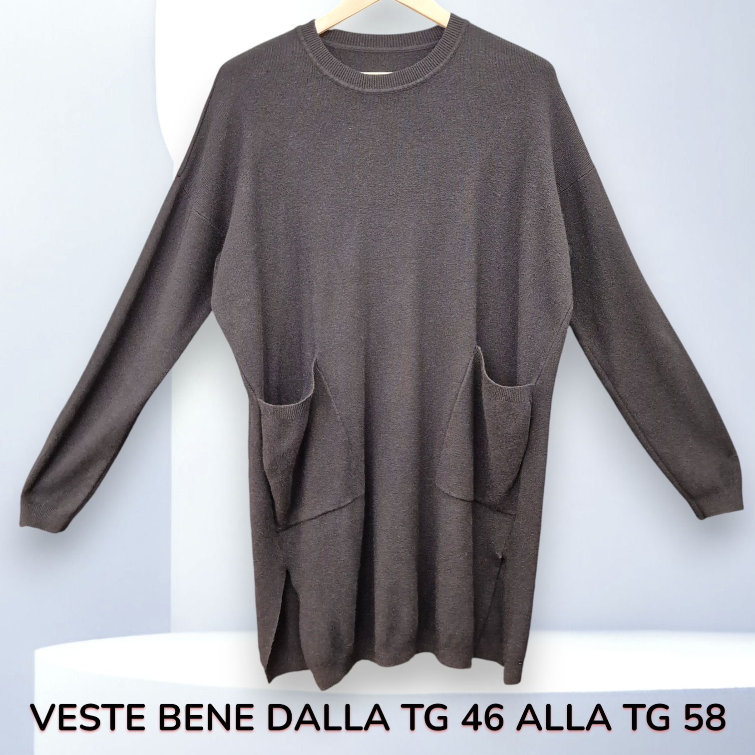 Il modello Soraia è una Maxi Maglia Taglia Grande Manica Lunga in tessuto elasticizzato di misto viscosa e modal effetto lana. Girocollo con Grandi Spacchi Laterali e Tasche a Toppa davanti . Grande vestibilità, questo modello veste tipo abito a tubino ed è perfetto per le giornate di lavoro o serate informali con le amiche