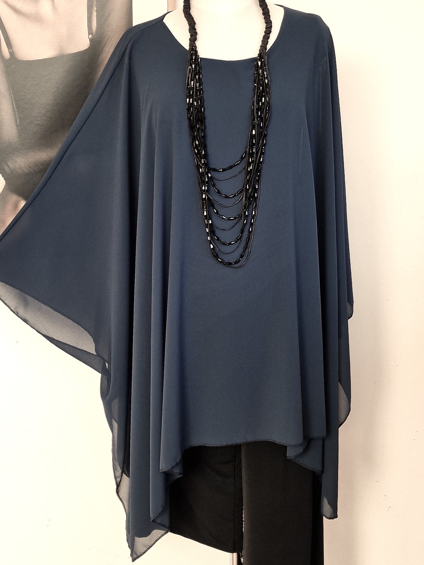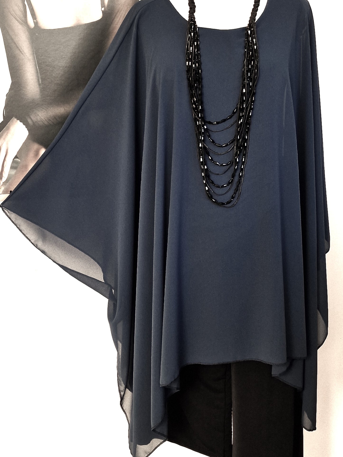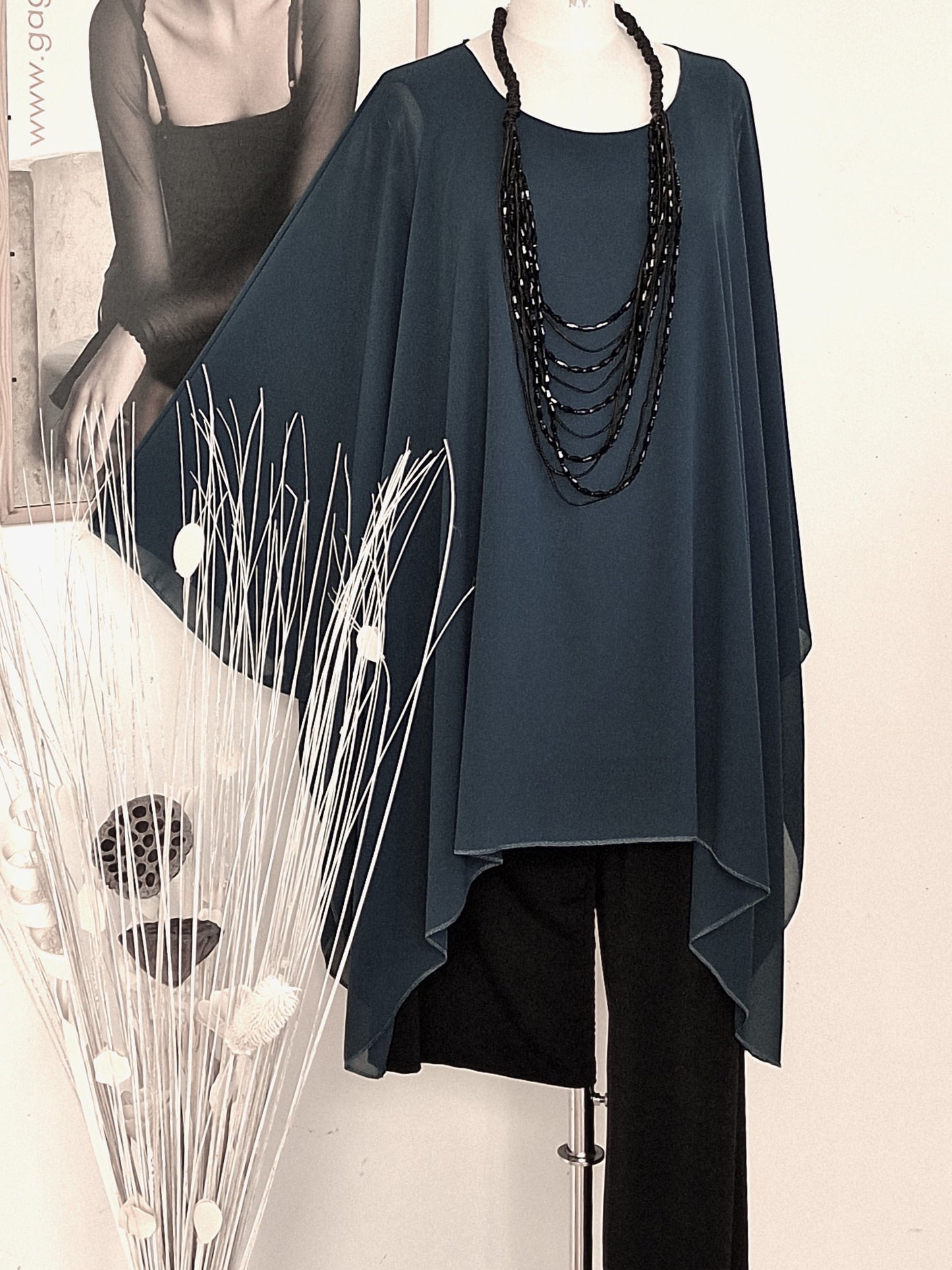 Il modello Anita è una maxi maglia doppia in georgette sopra con top in viscosa elasticizzato sotto. Modello a Poncho con punto di chiusura sotto il braccio . Questa maglia ti offre una grandissima vestibilità ed eleganza