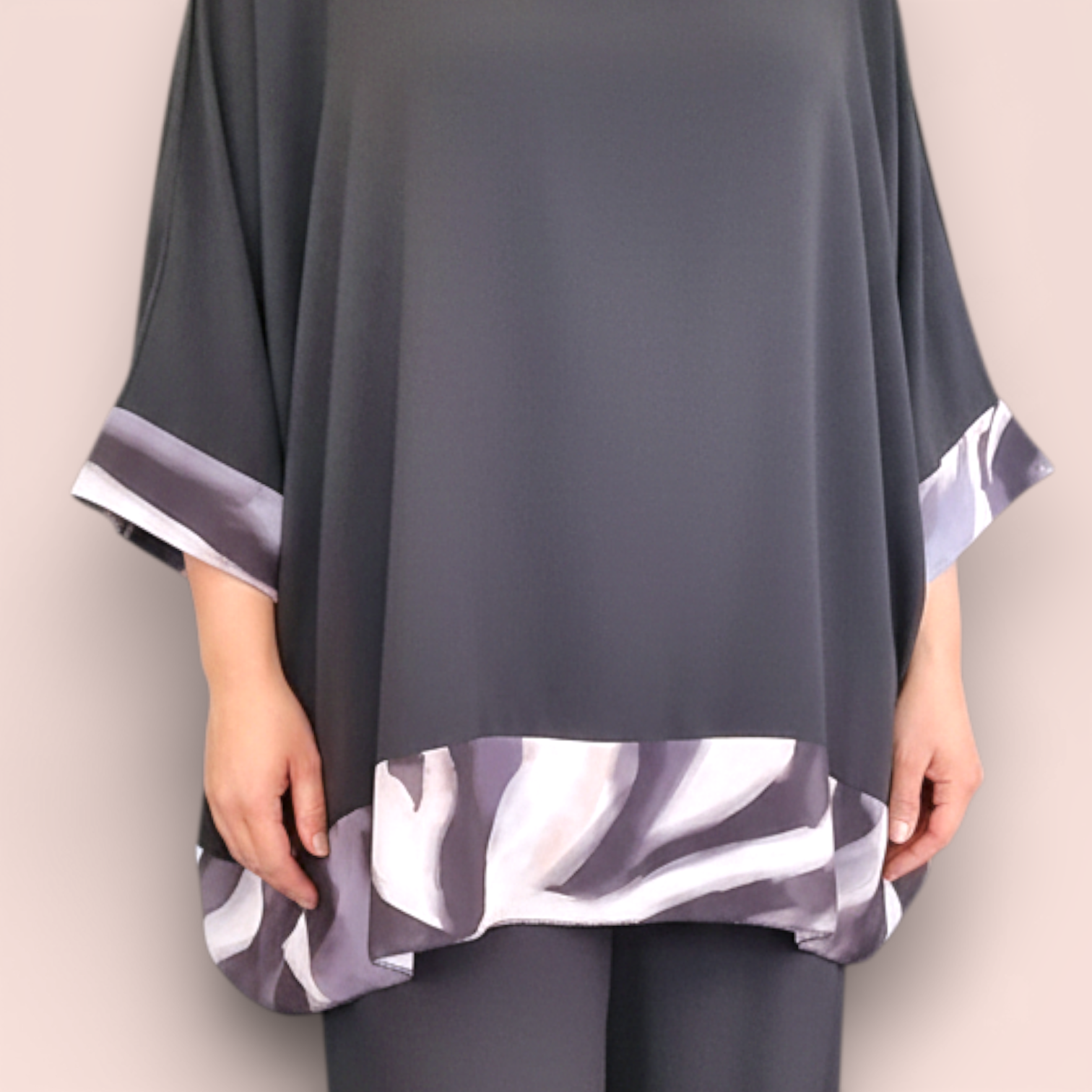 Il modello Concetta è una maxi maglia doppia in georgette sopra con top in viscosa elasticizzato sotto. Modello a Poncho con bordature di georgette fantasia a contrasto , questa maglia ti offre una grandissima vestibilità ed eleganza