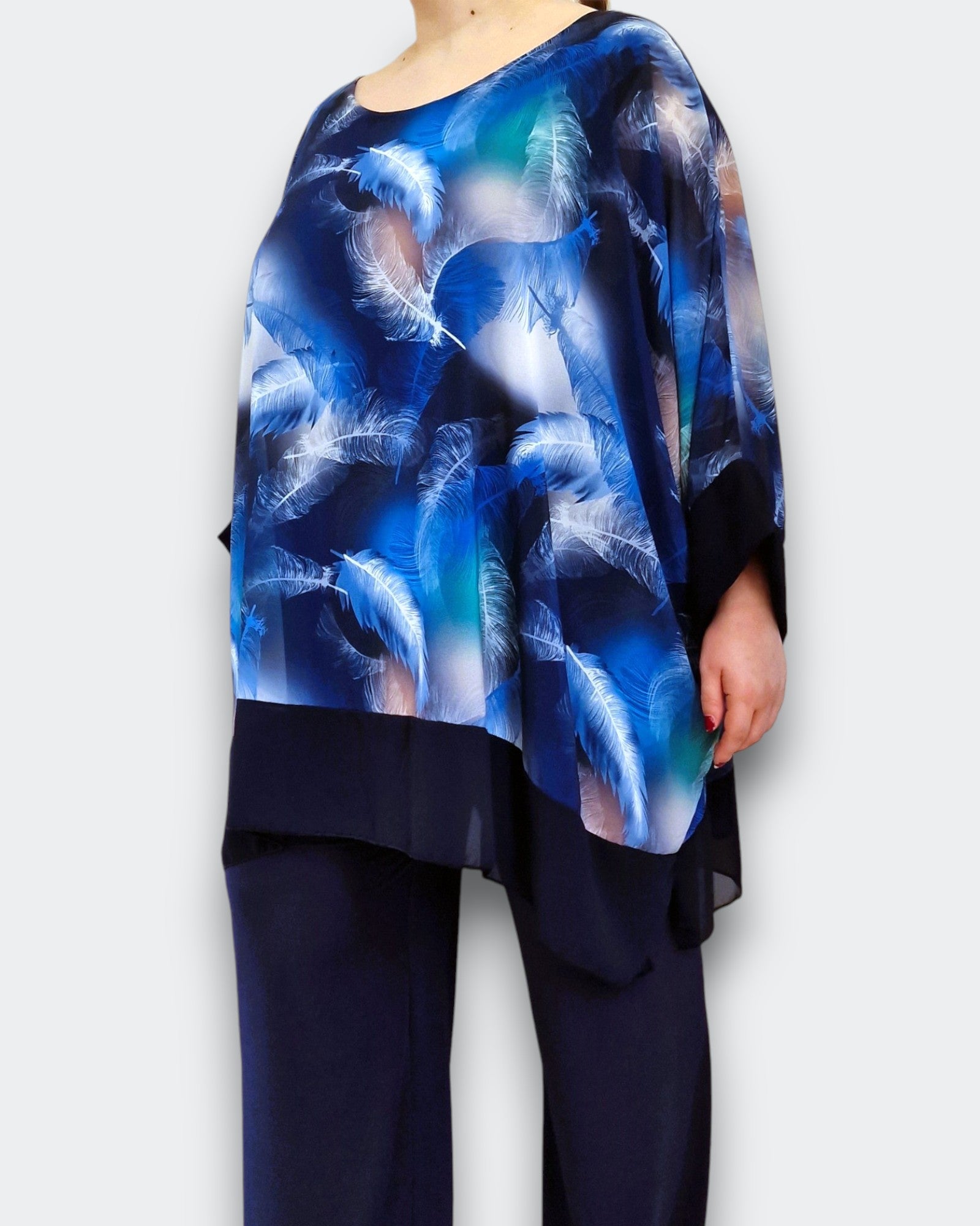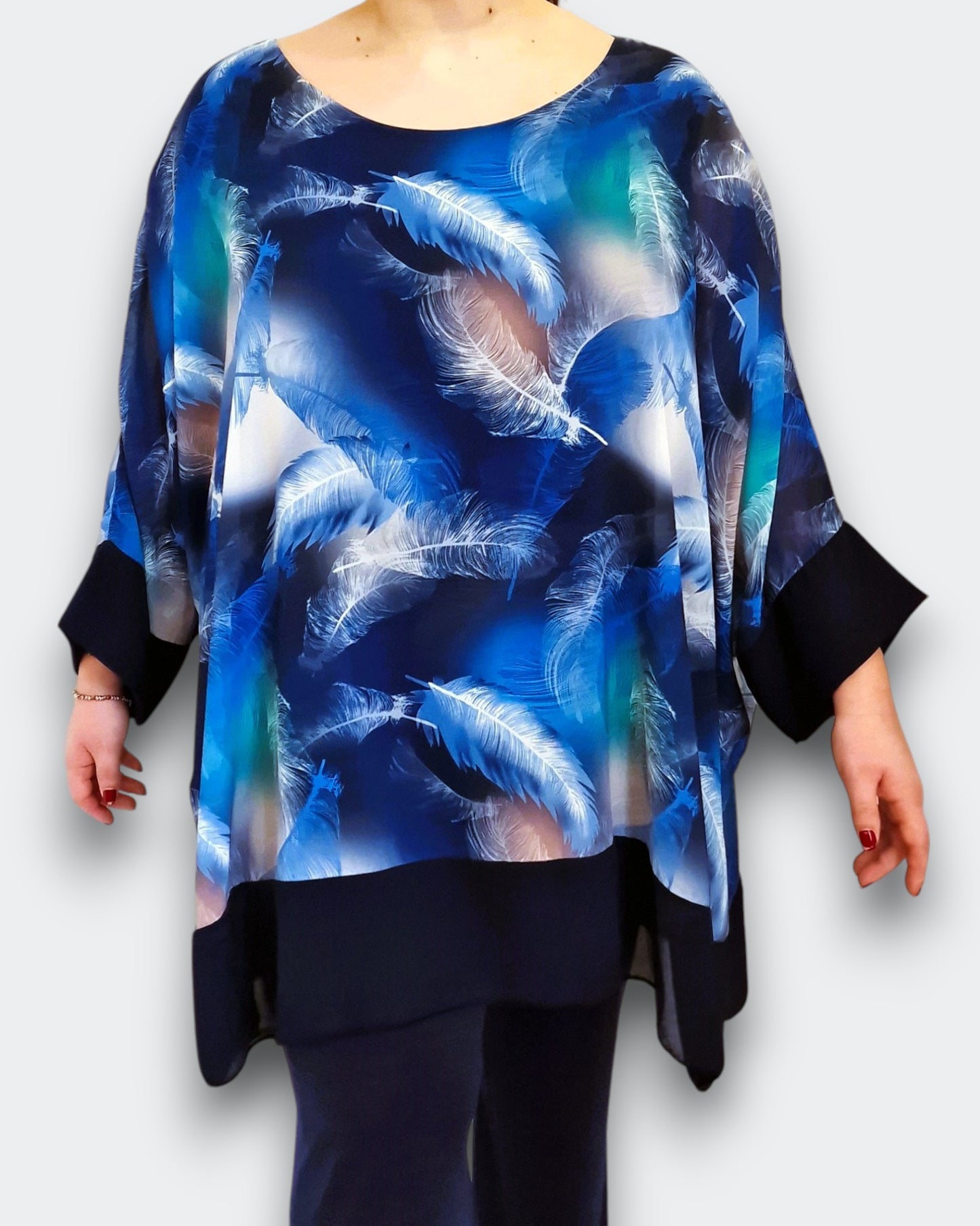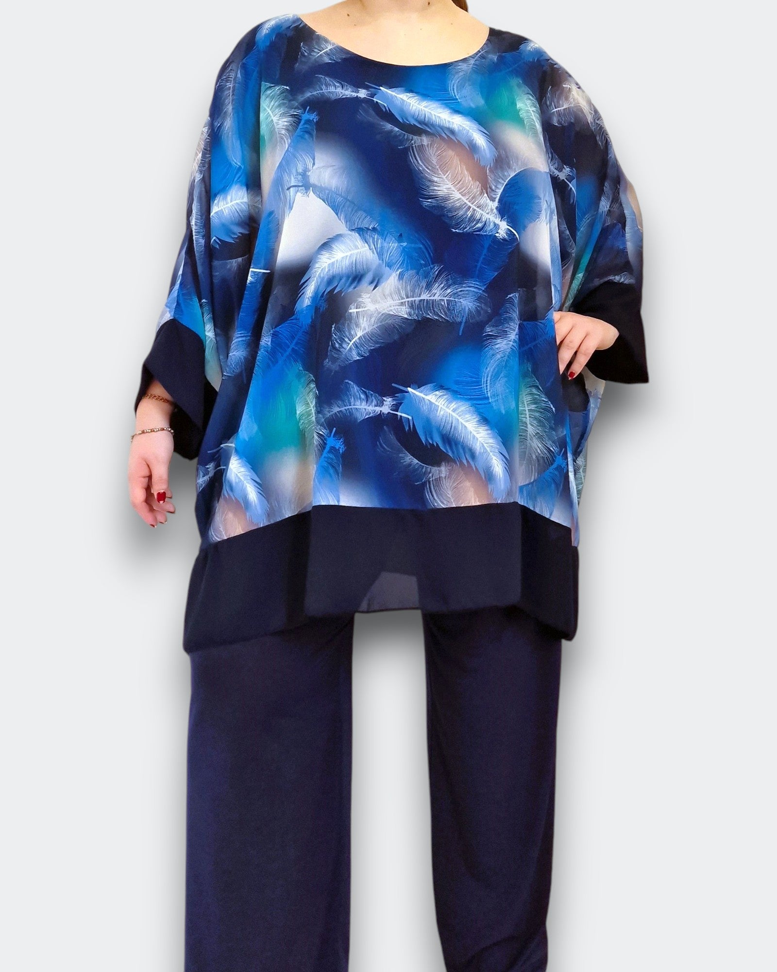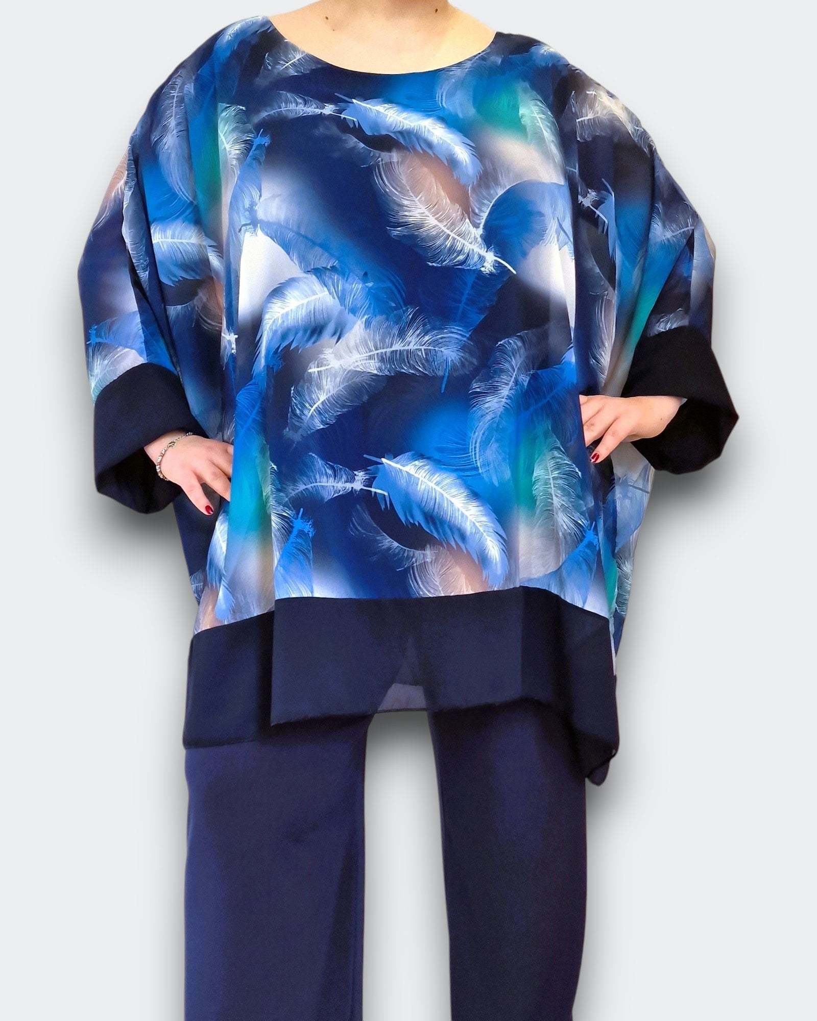 Il modello Domizia è una maxi maglia doppia in georgette fantasia sopra con top in viscosa elasticizzato sotto. Modello a Poncho con bordature di georgette a contrasto , questa maglia ti offre una grandissima vestibilità ed eleganza
