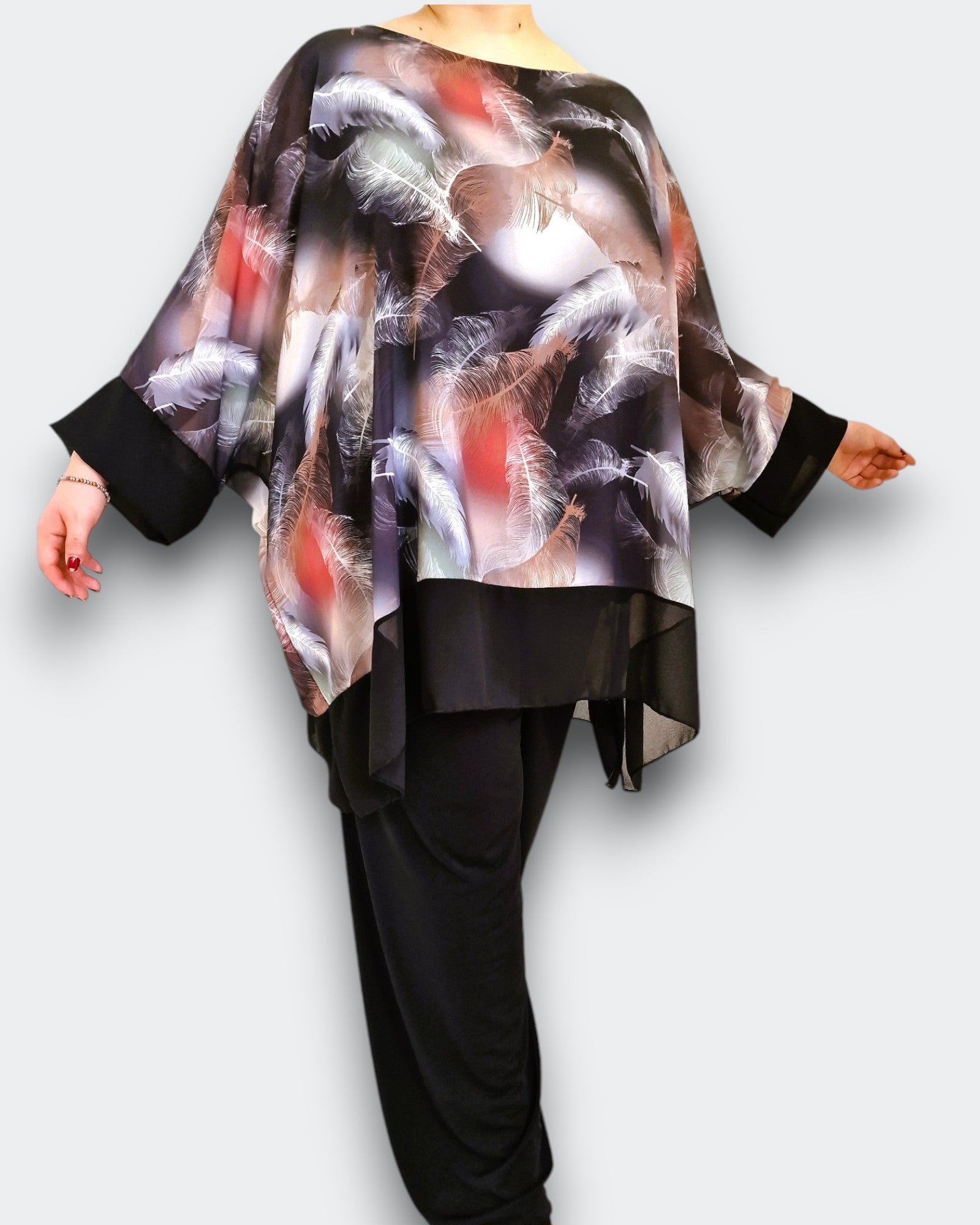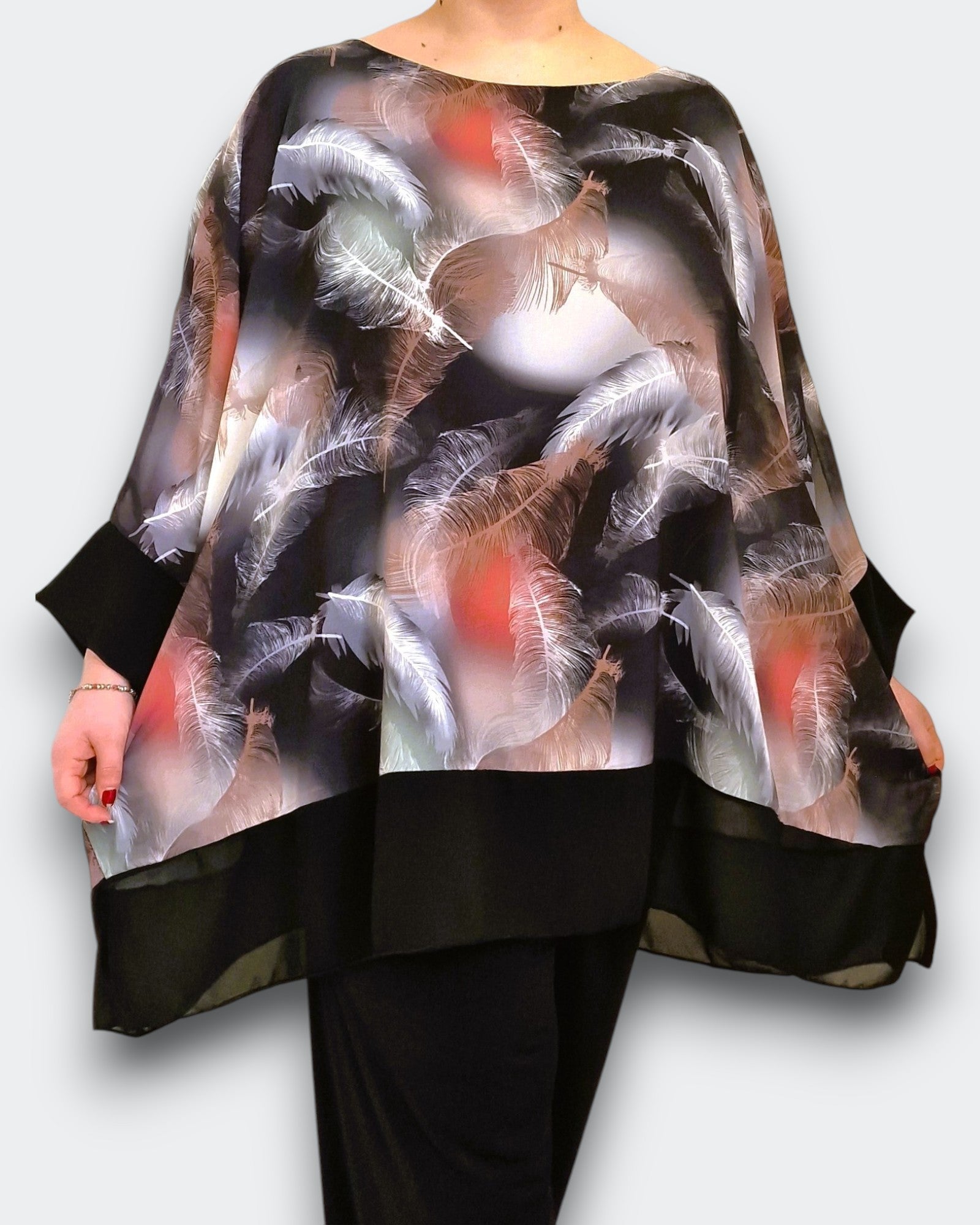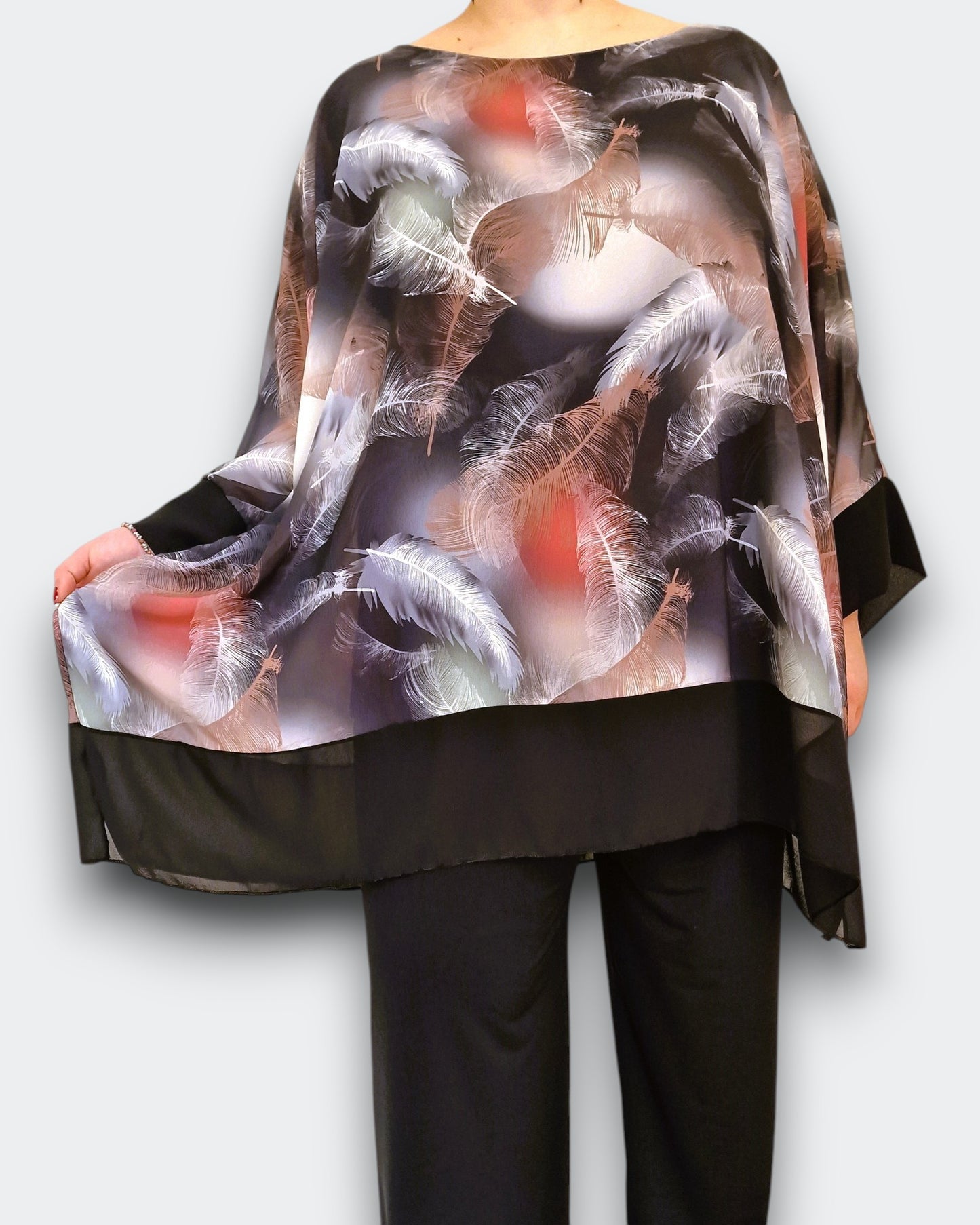 Il modello Dorella è una maxi maglia doppia in georgette fantasia sopra con top in viscosa elasticizzato sotto. Modello a Poncho con bordature di georgette a contrasto , questa maglia ti offre una grandissima vestibilità ed eleganza