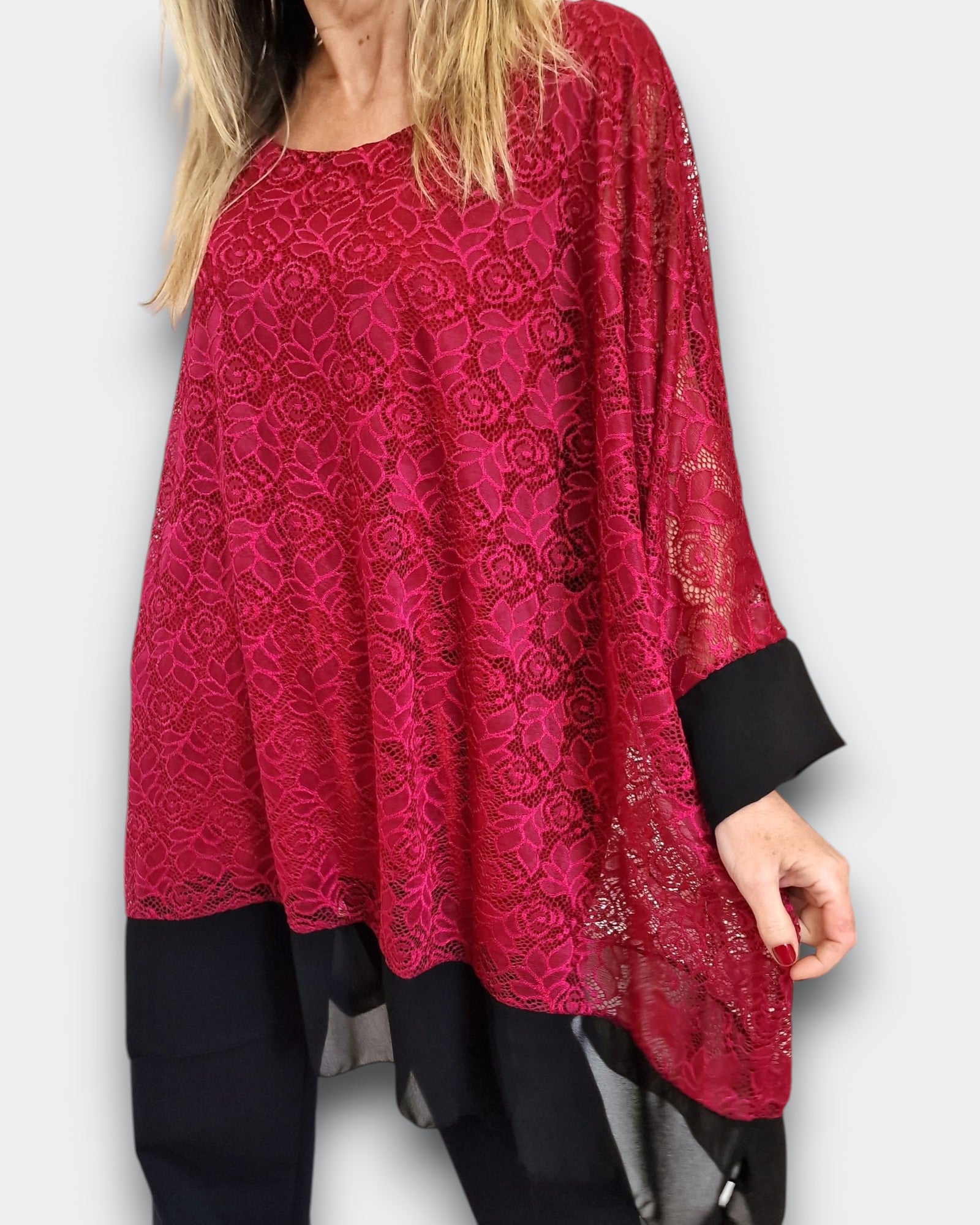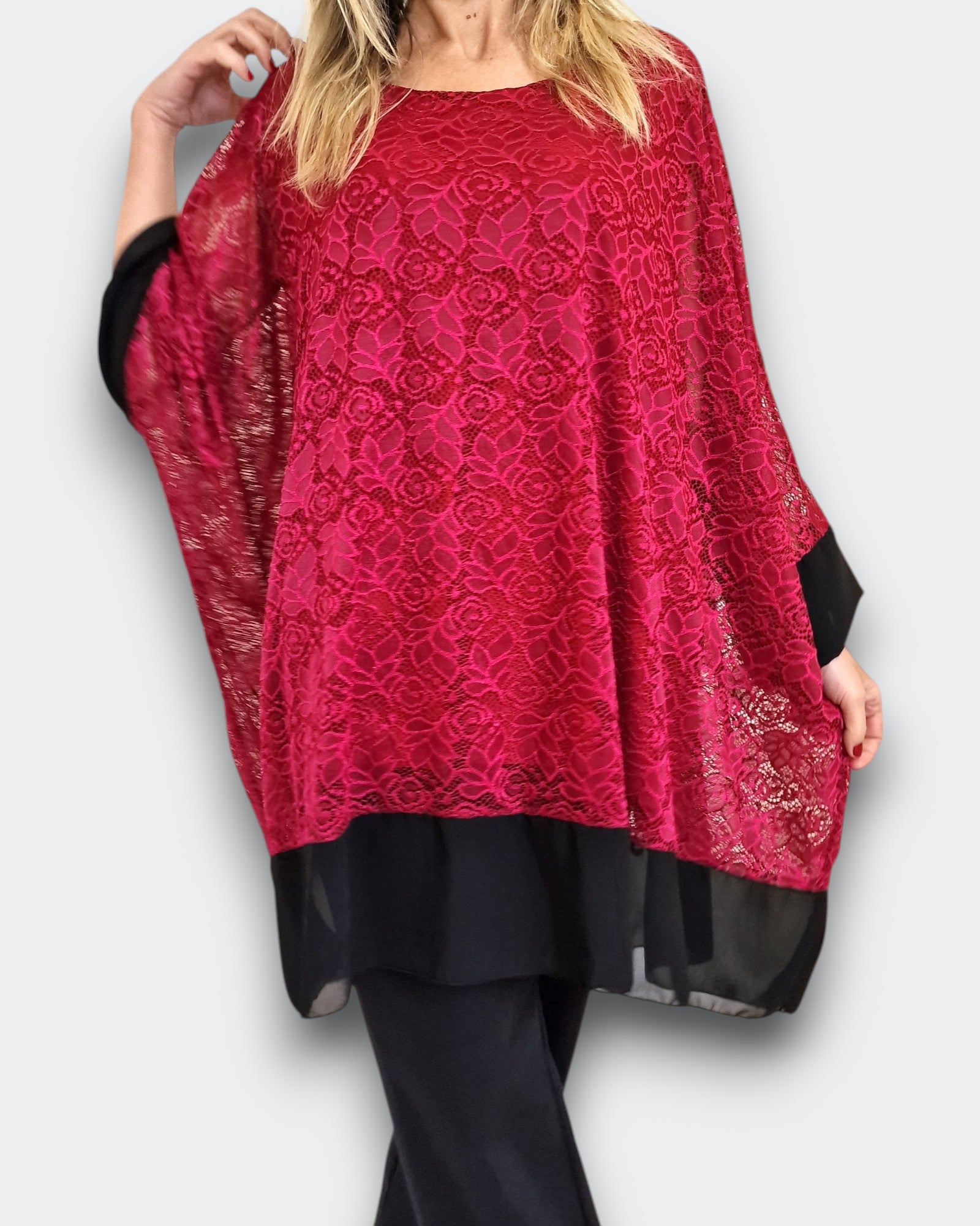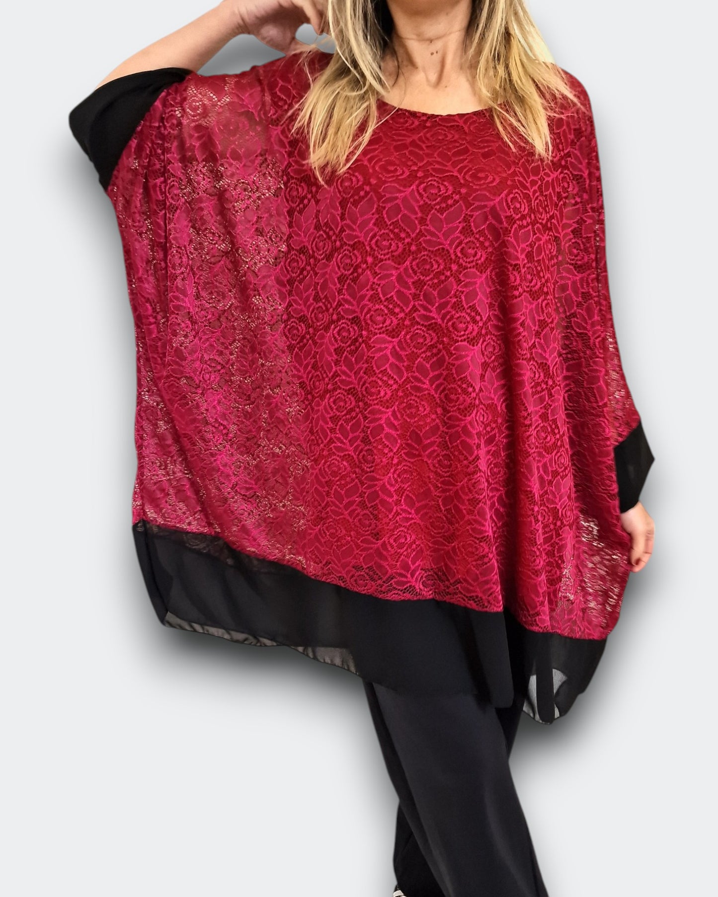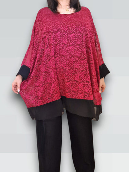 Il modello Alessia è una maxi maglia doppia in pizzo elasticizzato sopra  con top in viscosa elasticizzato sotto. Modello a Poncho con bordature di georgette a contrasto , questa maglia ti offre una grandissima vestibilità ed eleganza