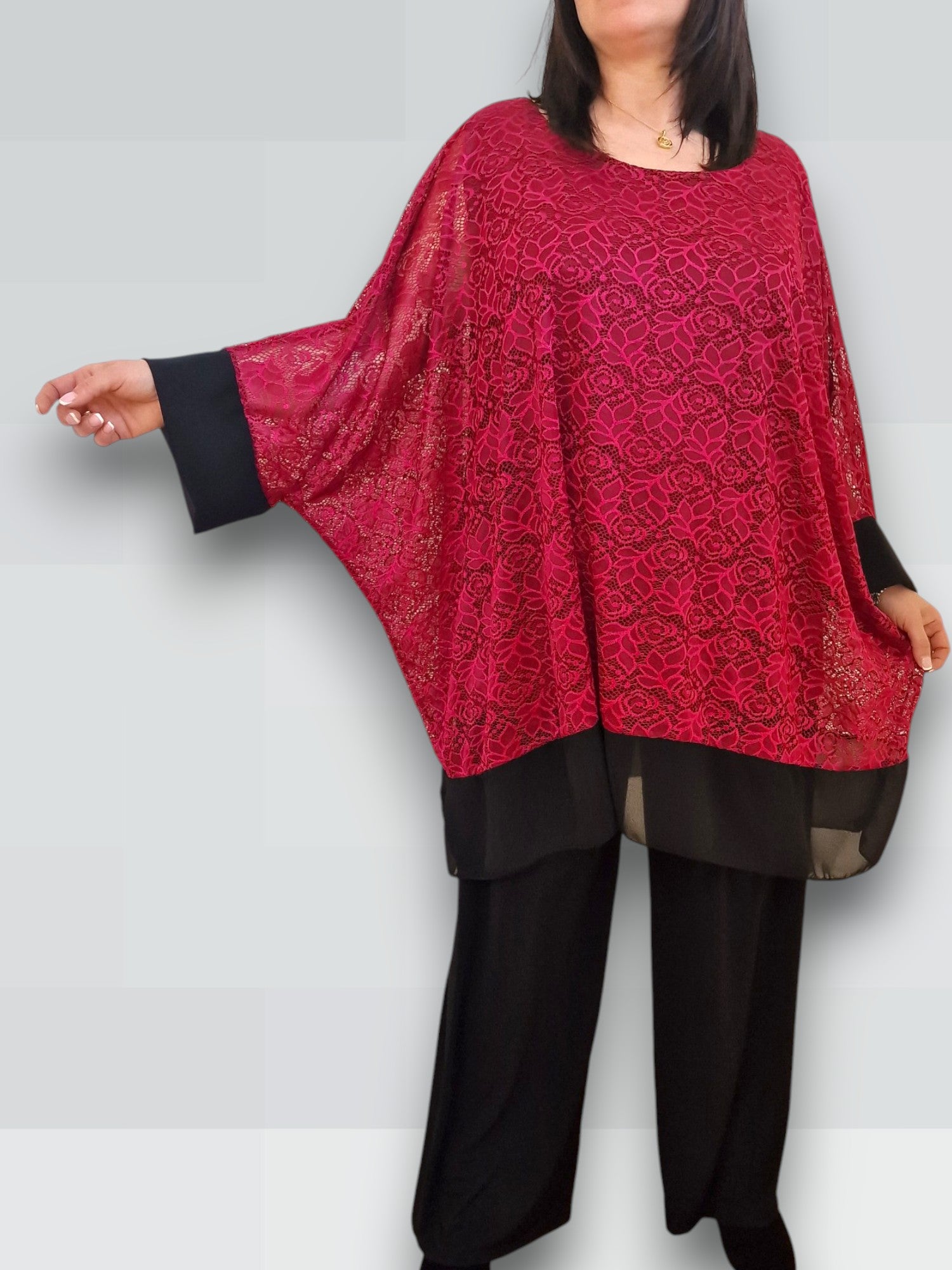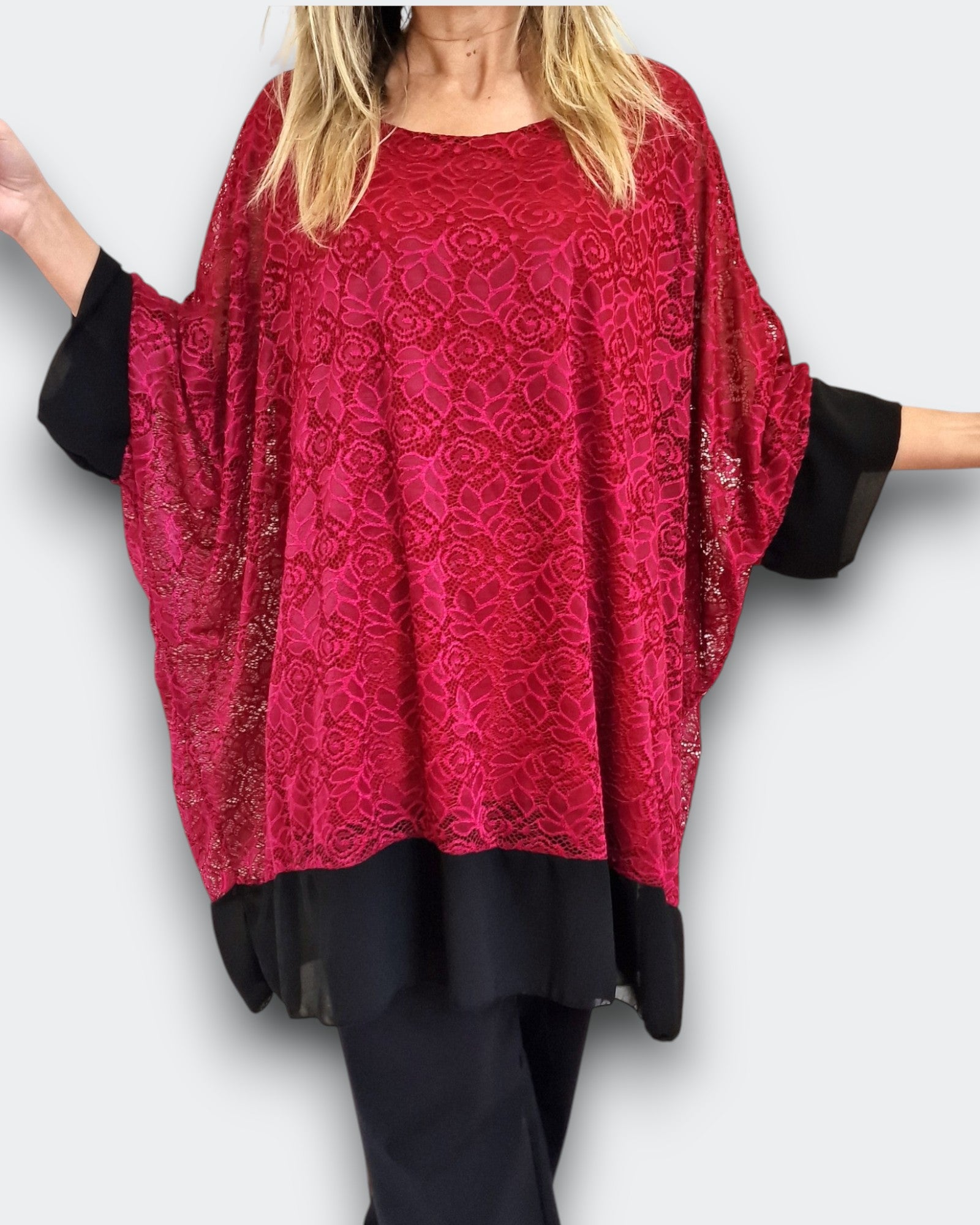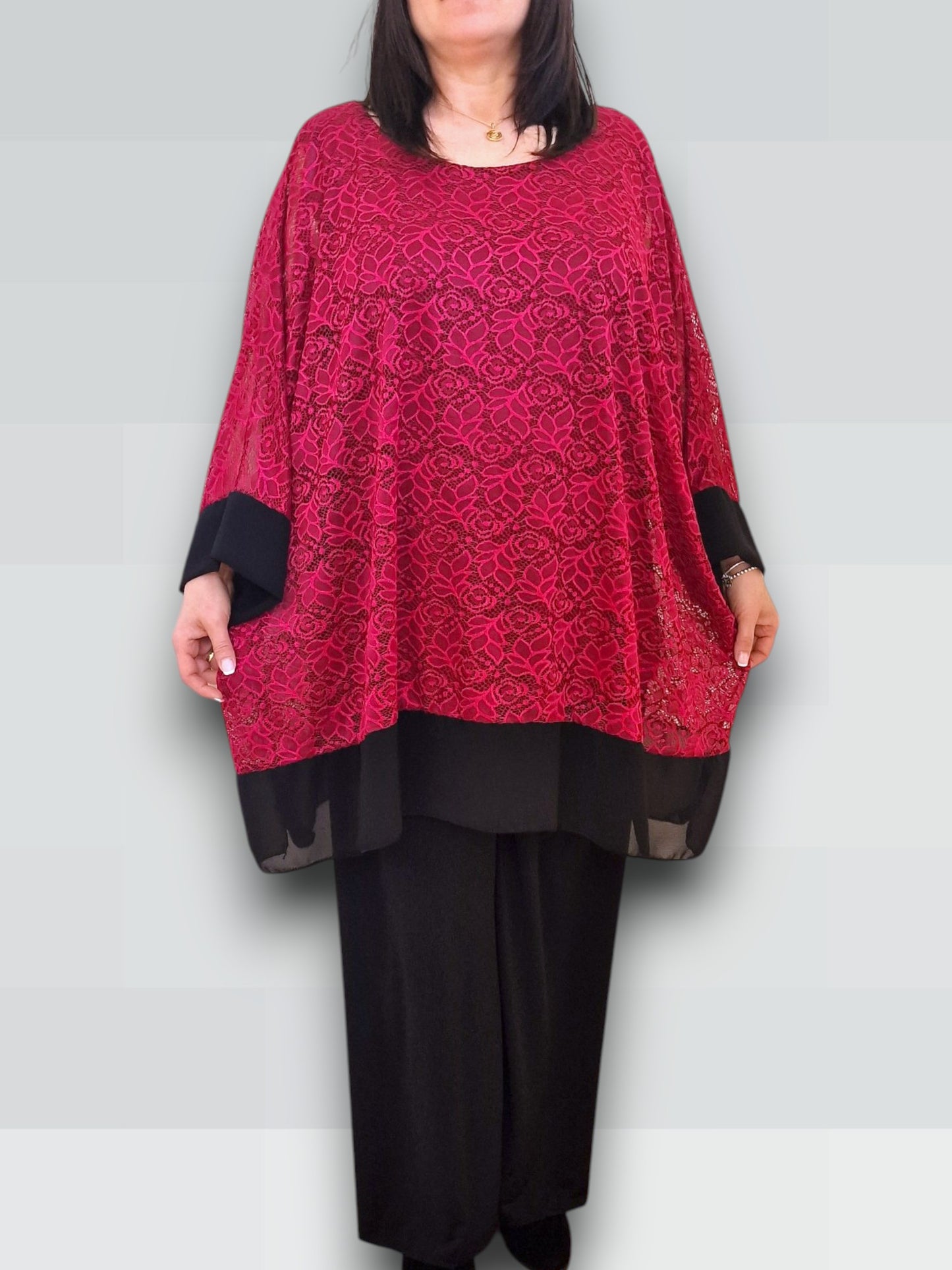 Il modello Alessia è una maxi maglia doppia in pizzo elasticizzato sopra  con top in viscosa elasticizzato sotto. Modello a Poncho con bordature di georgette a contrasto , questa maglia ti offre una grandissima vestibilità ed eleganza