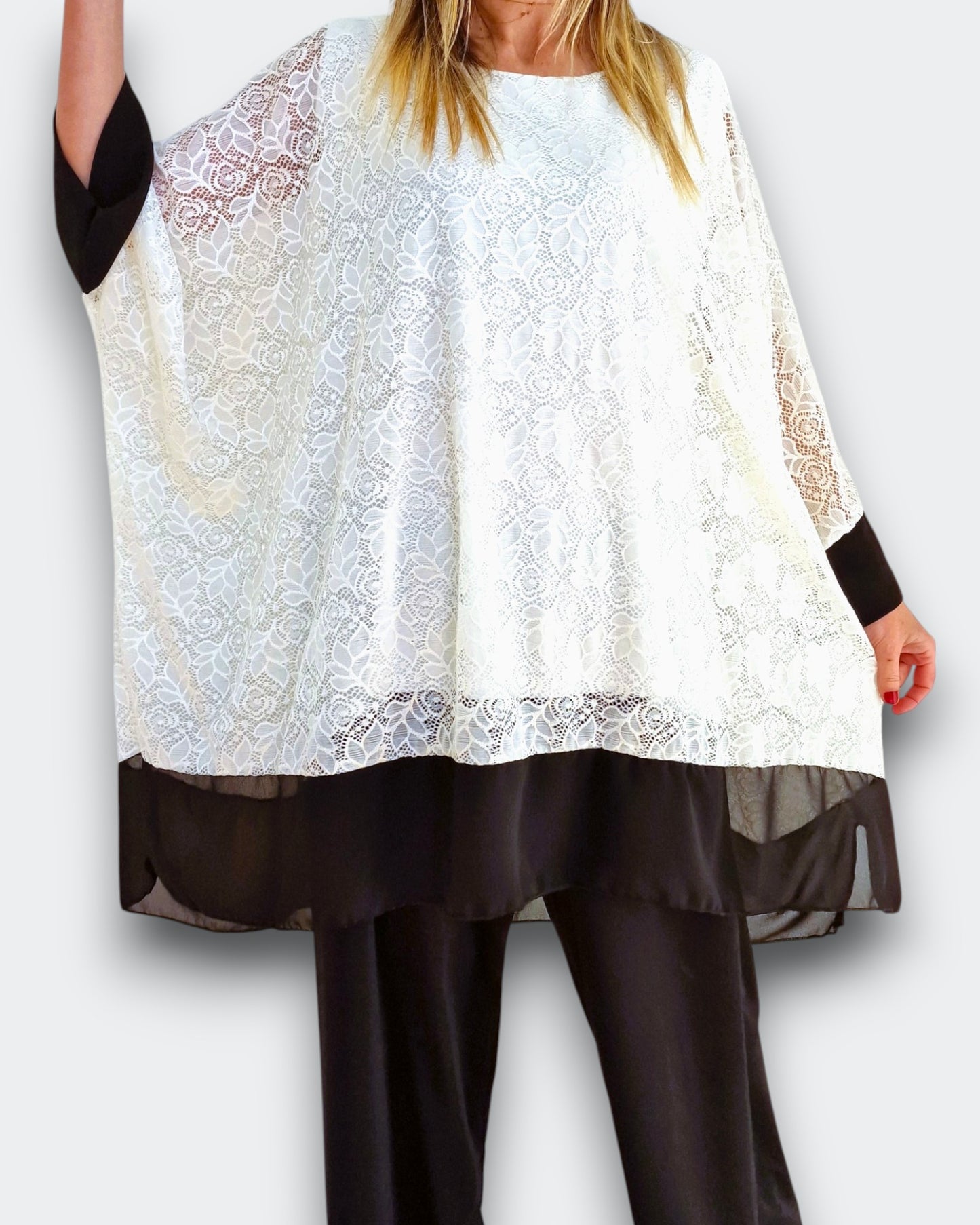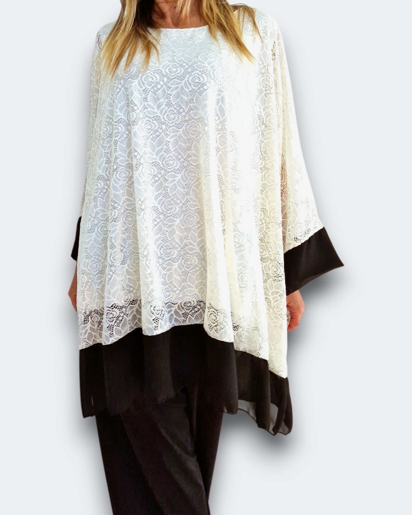 Il modello Amanda è una maxi maglia doppia in pizzo elasticizzato sopra con top in viscosa elasticizzato sotto. Modello a Poncho con bordature di georgette a contrasto , questa maglia ti offre una grandissima vestibilità ed eleganza