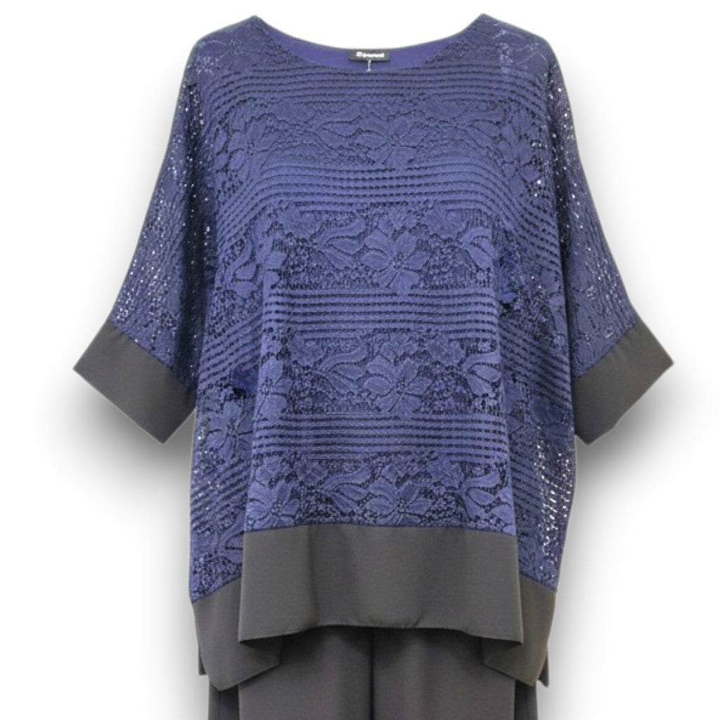 Il modello Assia è una maxi maglia doppia in pizzo elasticizzato sopra con top in viscosa elasticizzato sotto. Modello a Poncho con bordature di georgette a contrasto , questa maglia ti offre una grandissima vestibilità ed eleganza