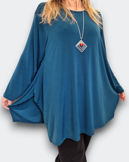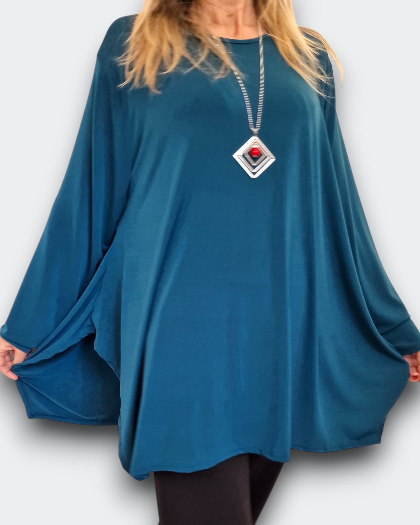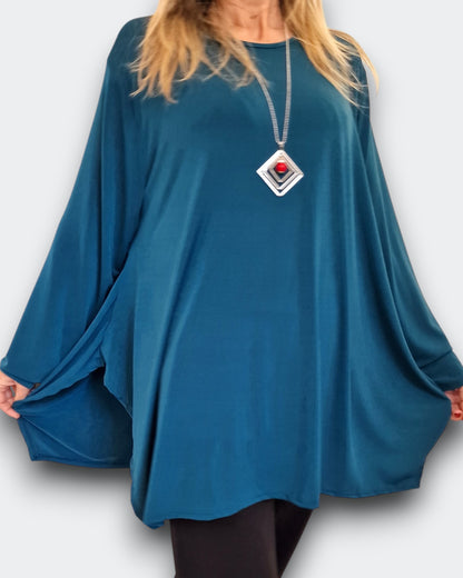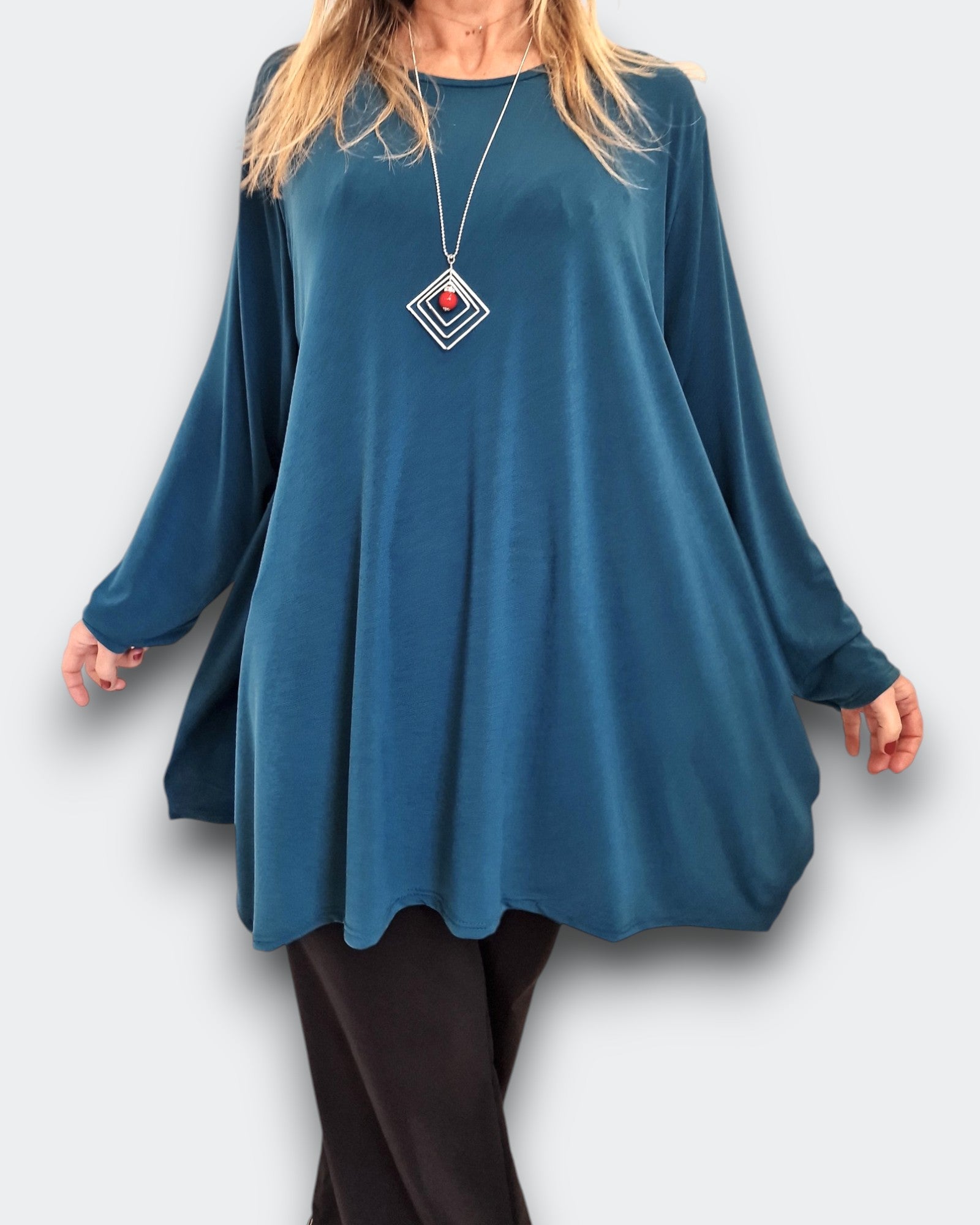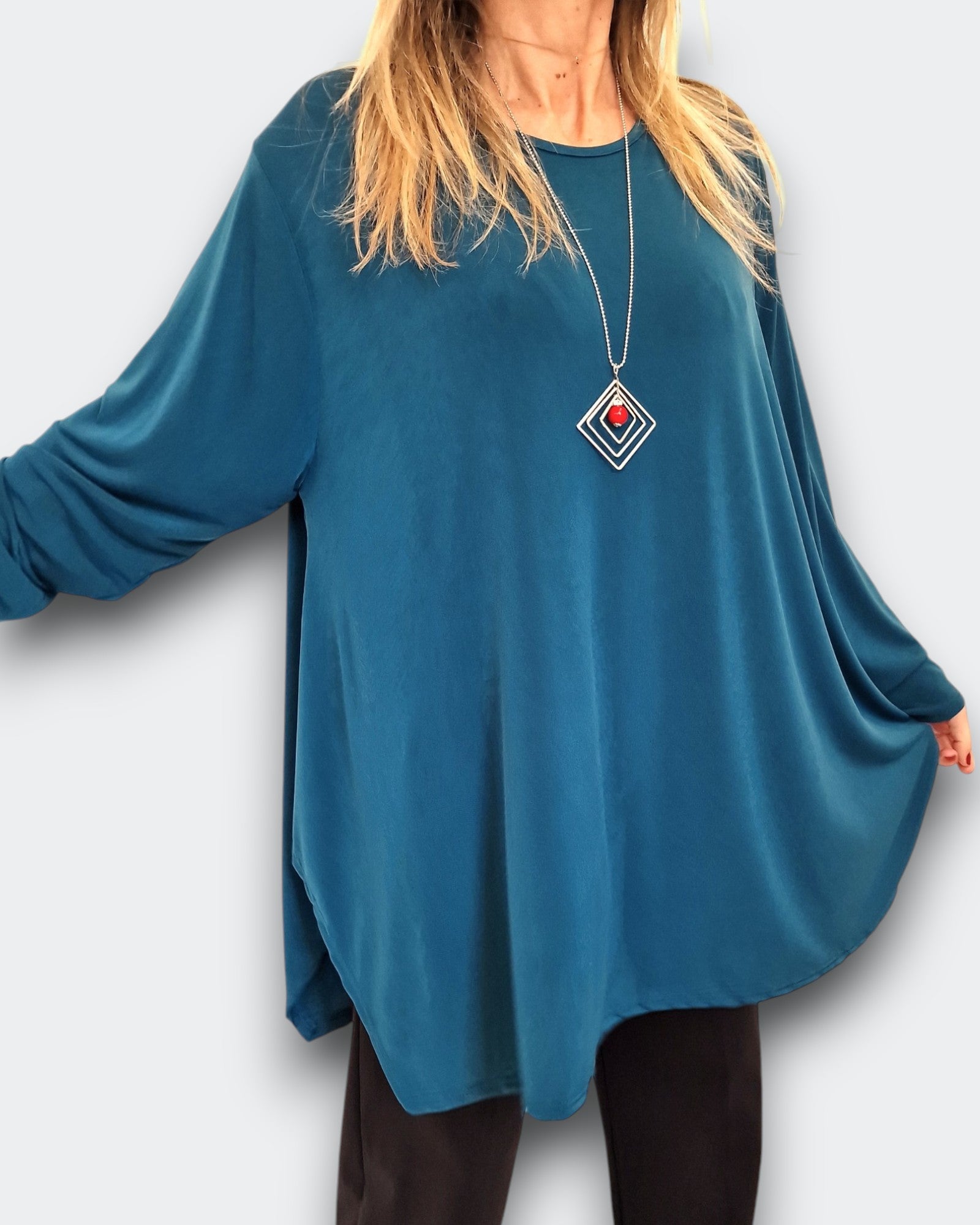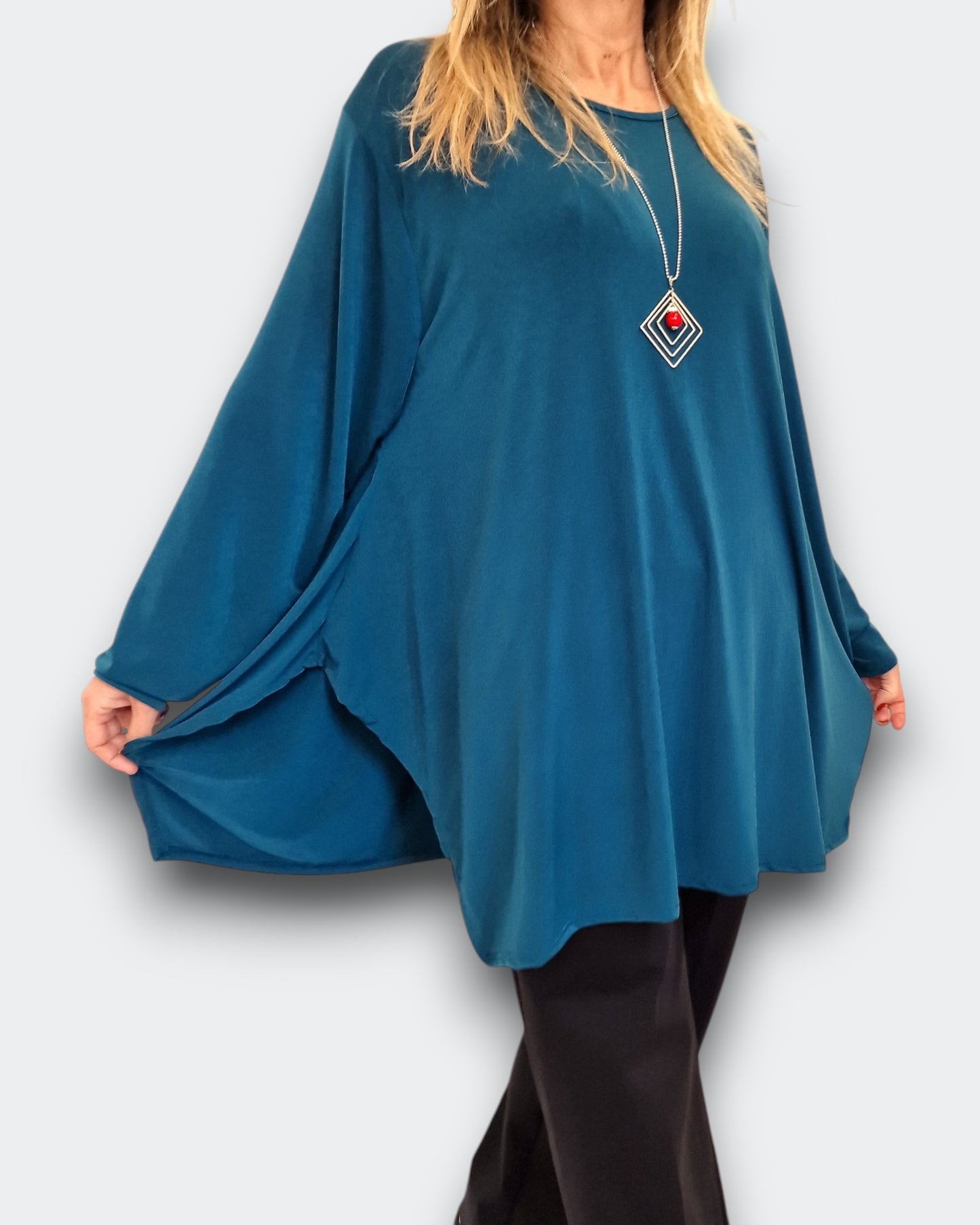 Scopri la Maxi Maglia Taglie Forti Milena in crepe di misto viscosa elasticizzata tinta unita . Girocollo con grandi spacchi e taglio a trapezio per una grandissima vestibilità, La collana dona un tocco raffinato al tuo look quotidiano .