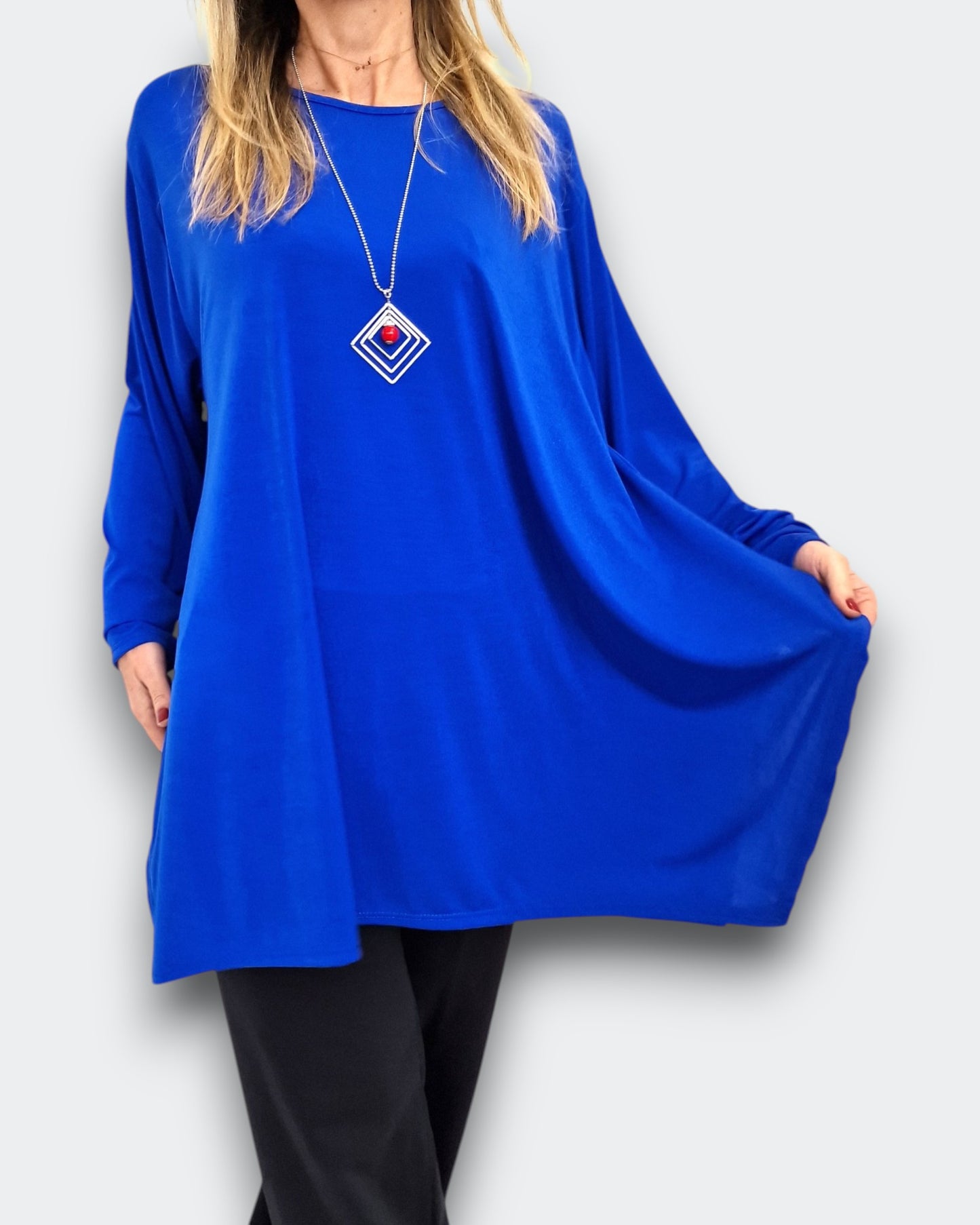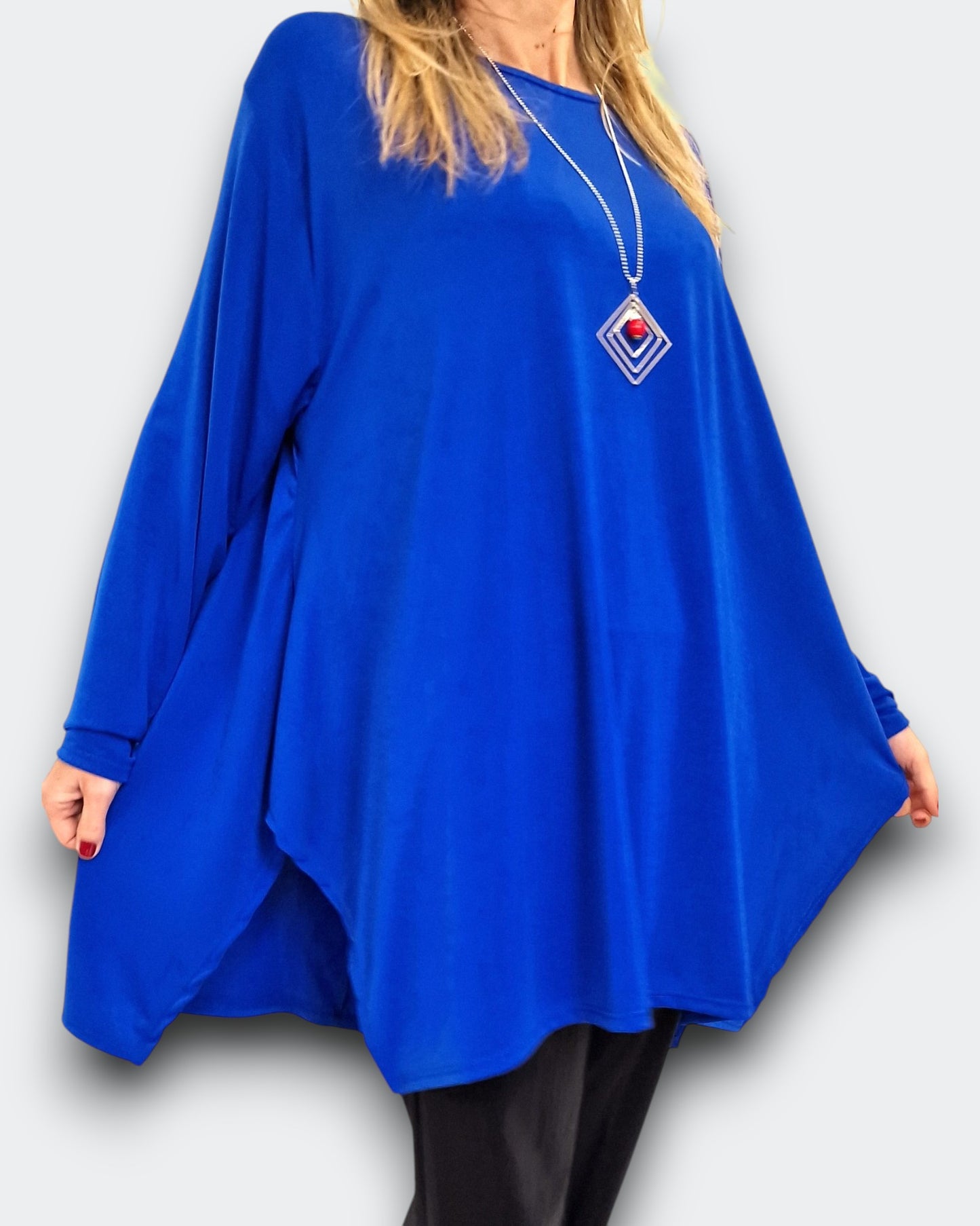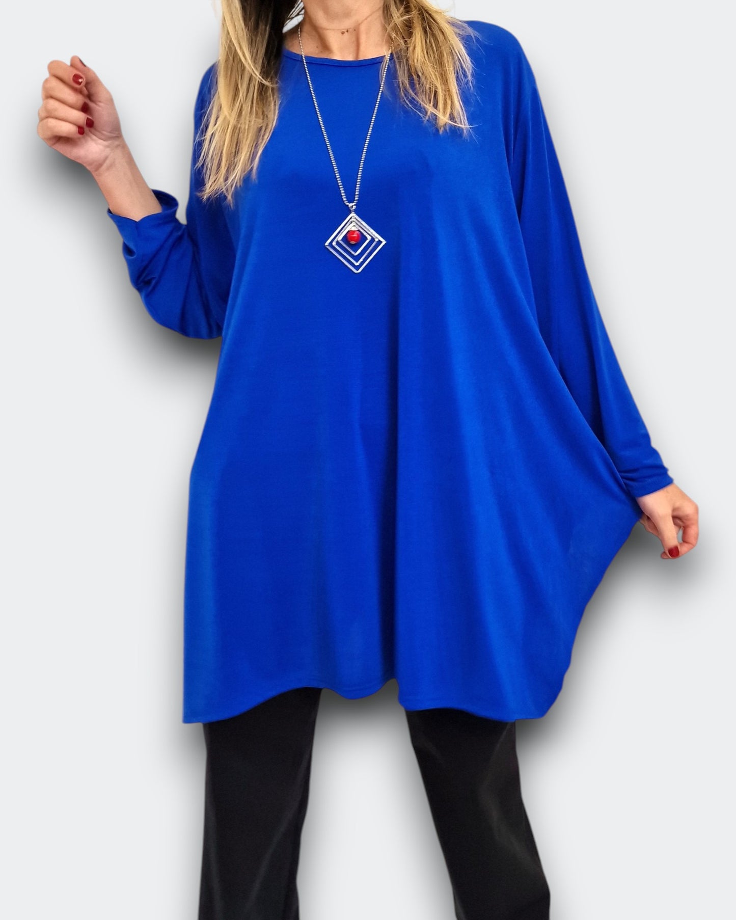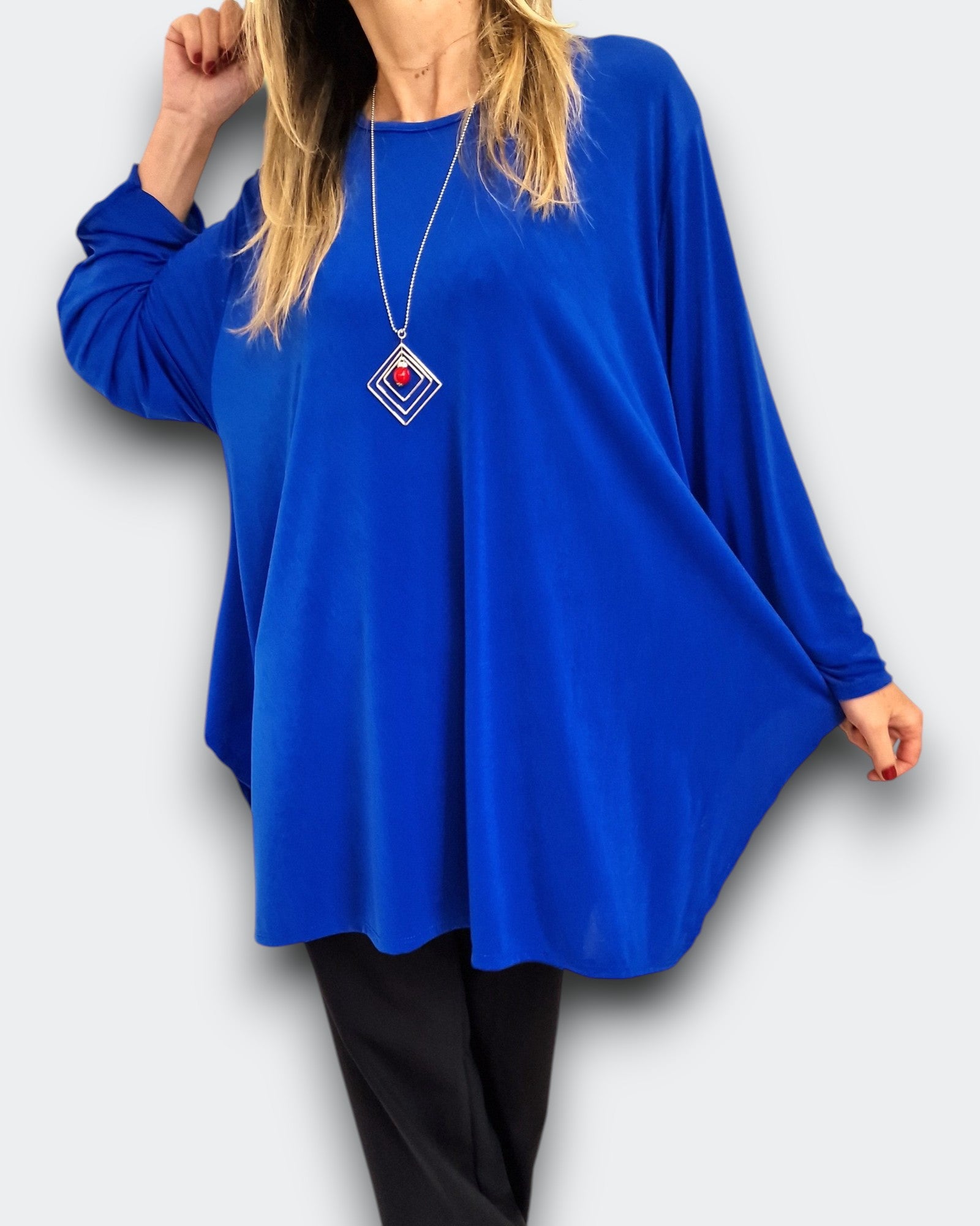 Scopri la Maxi Maglia Taglie Forti Milva in crepe di misto viscosa elasticizzata tinta unita . Girocollo con grandi spacchi e taglio a trapezio per una grandissima vestibilità, La collana dona un tocco raffinato al tuo look quotidiano .