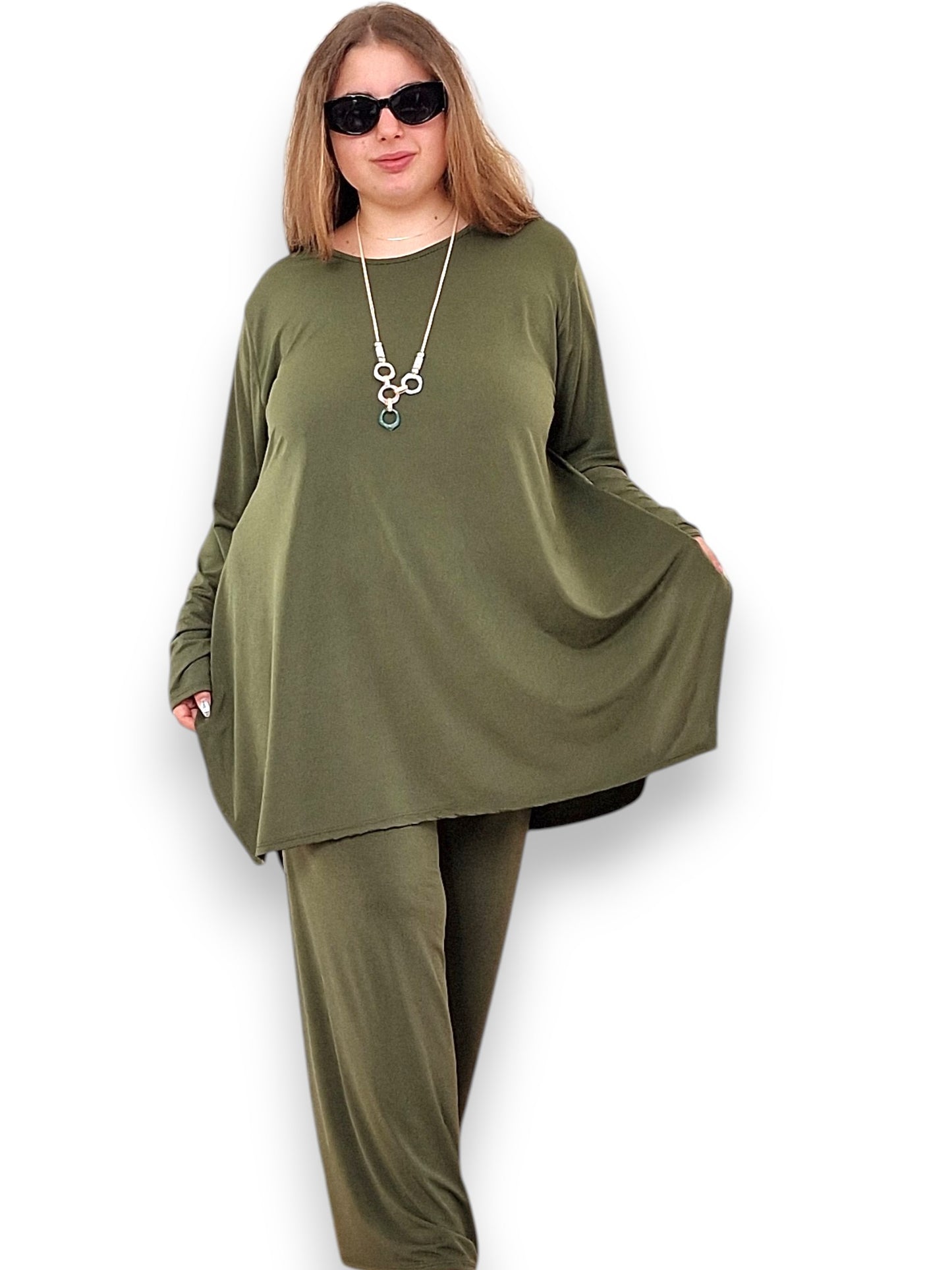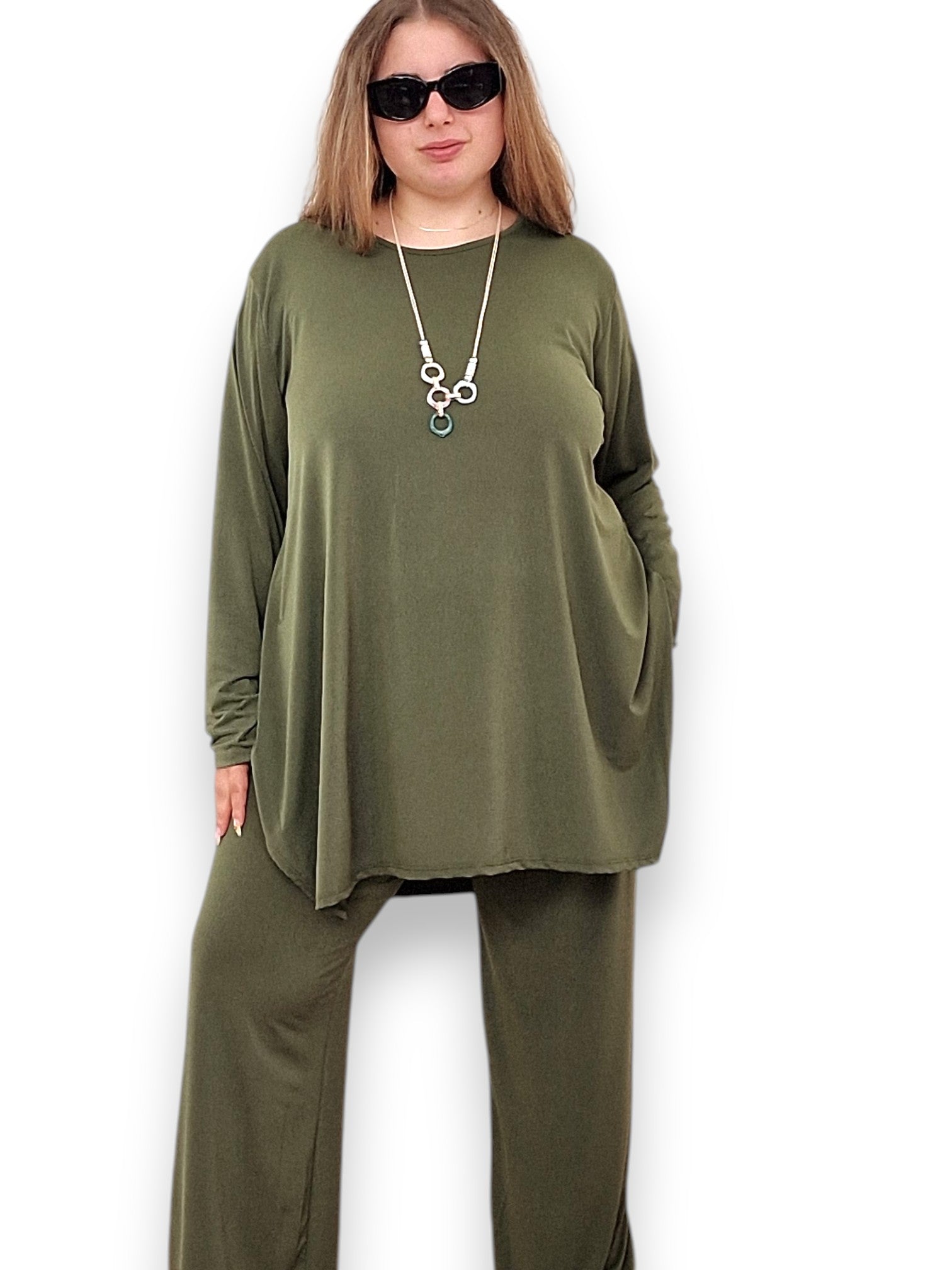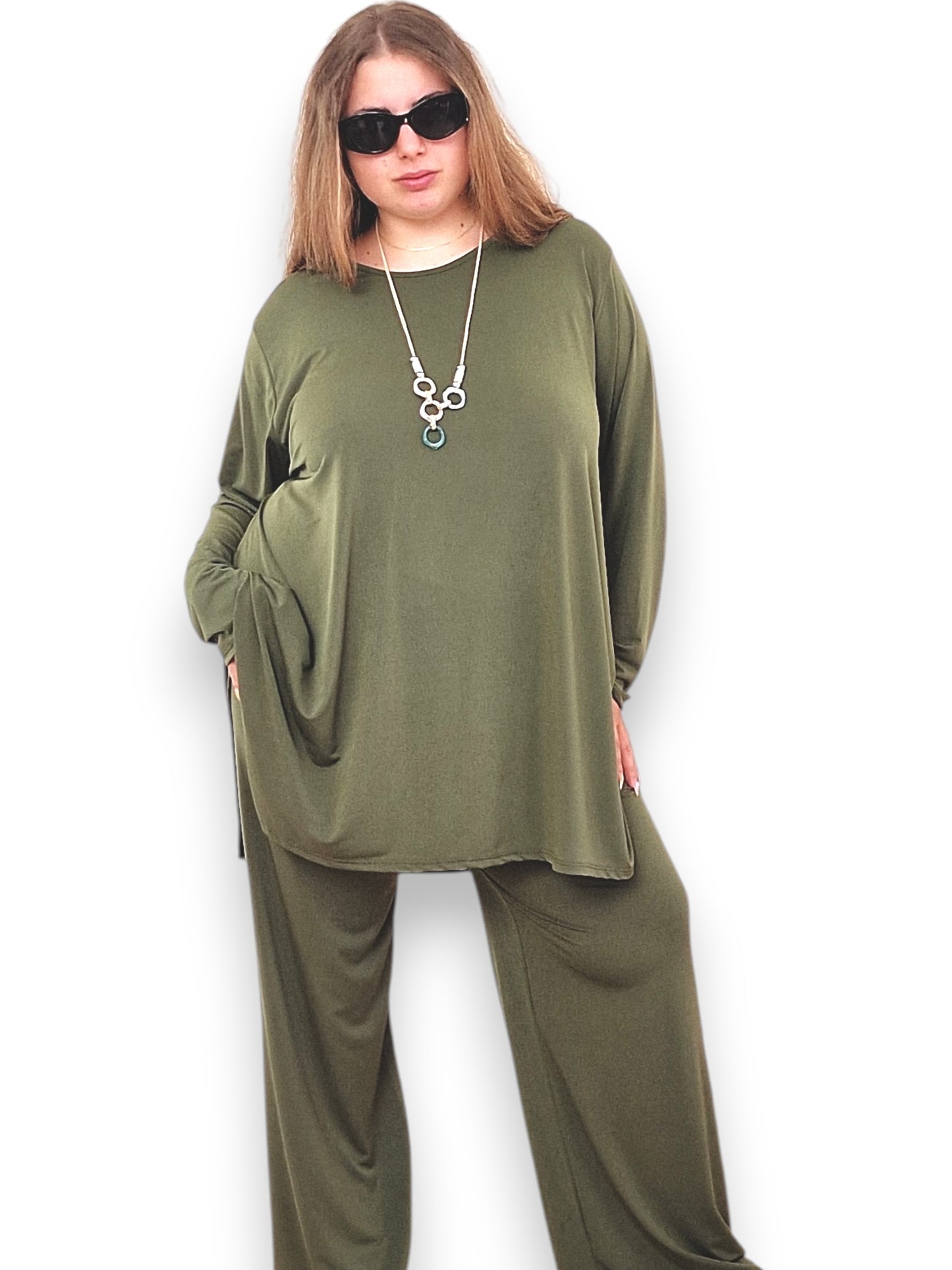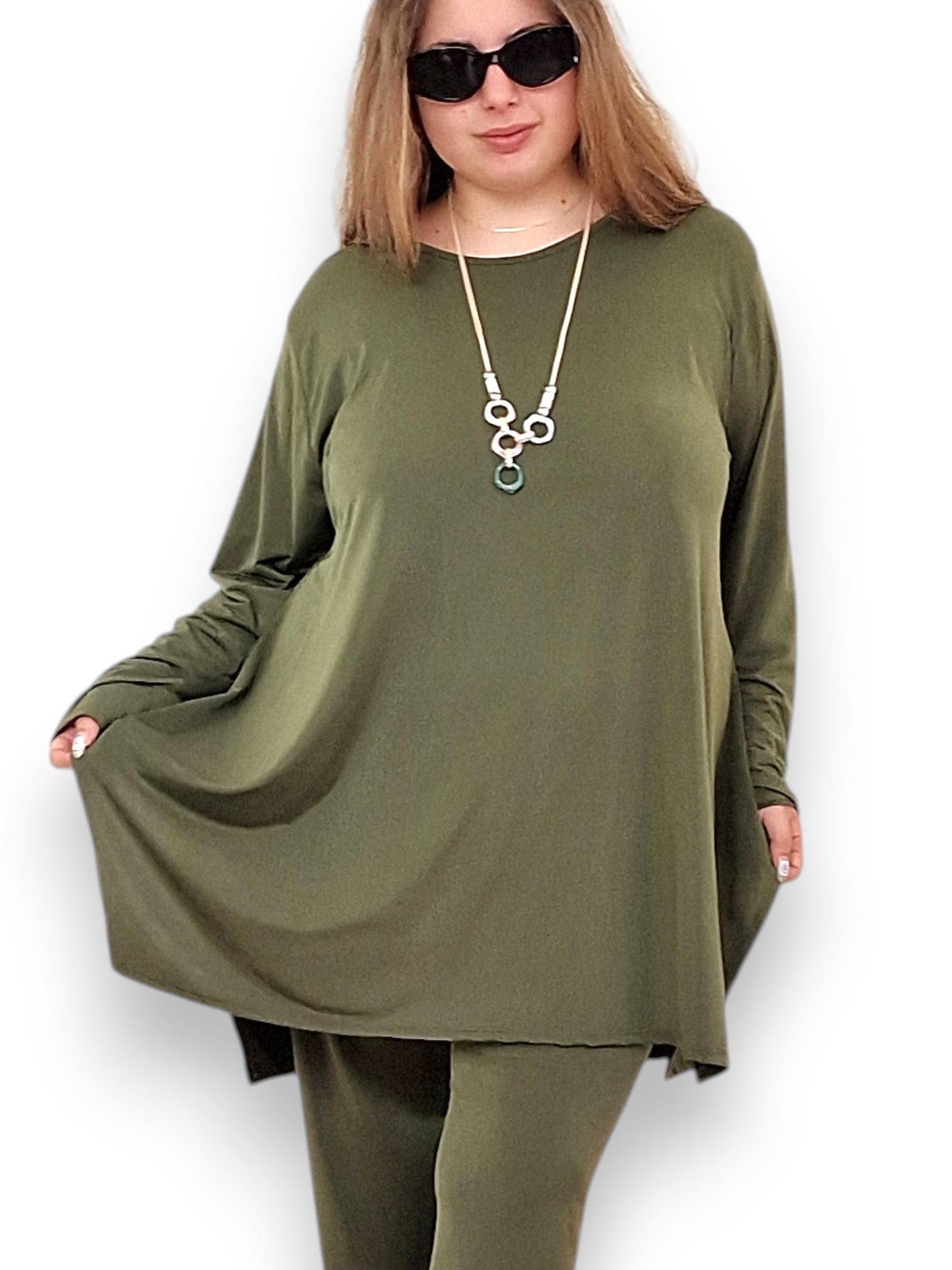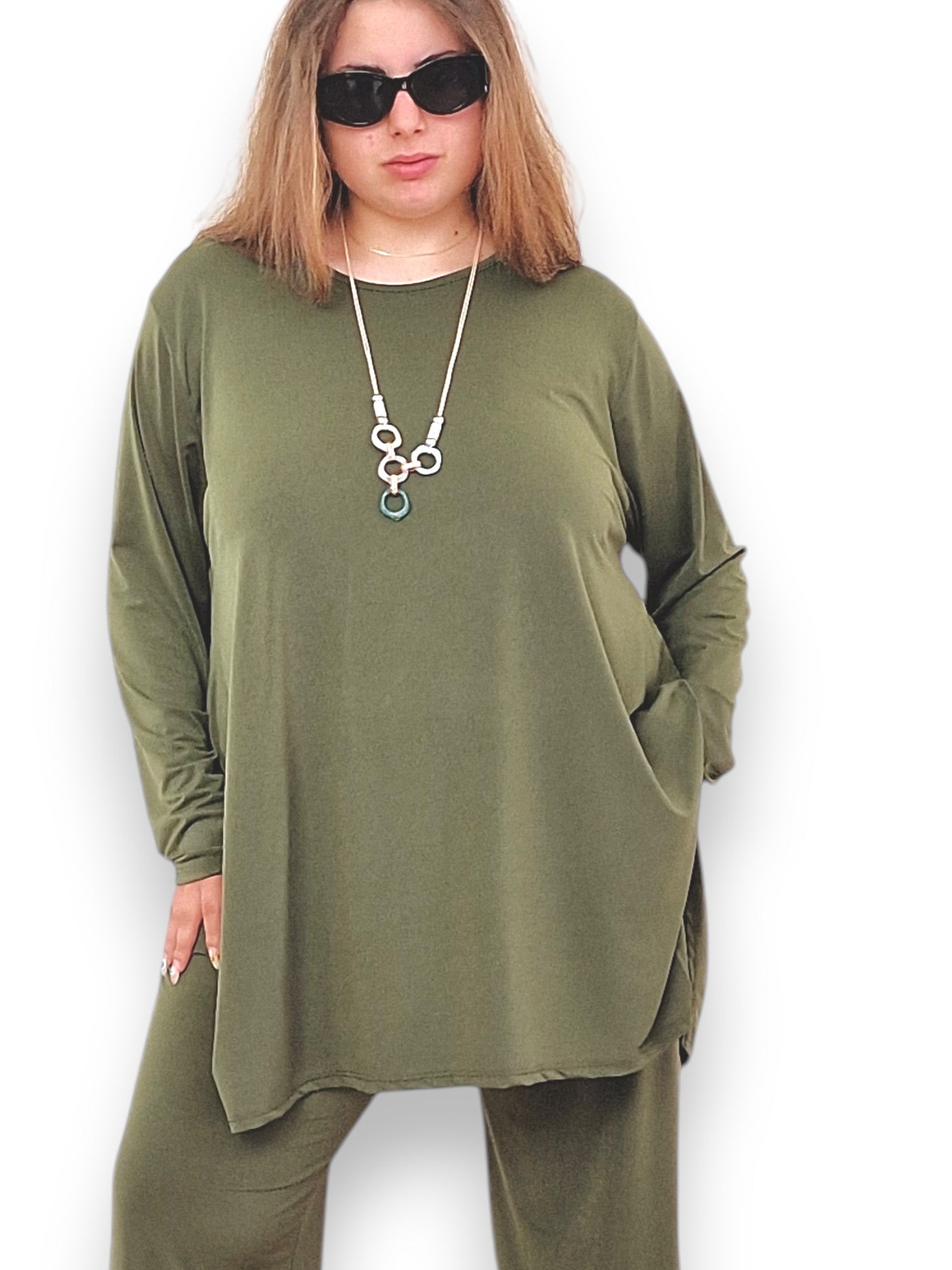 Scopri la Maxi Maglia Taglie Forti Mirna in crepe di misto viscosa elasticizzata tinta unita . Girocollo con grandi spacchi e taglio a trapezio per una grandissima vestibilità, La collana dona un tocco raffinato al tuo look quotidiano .