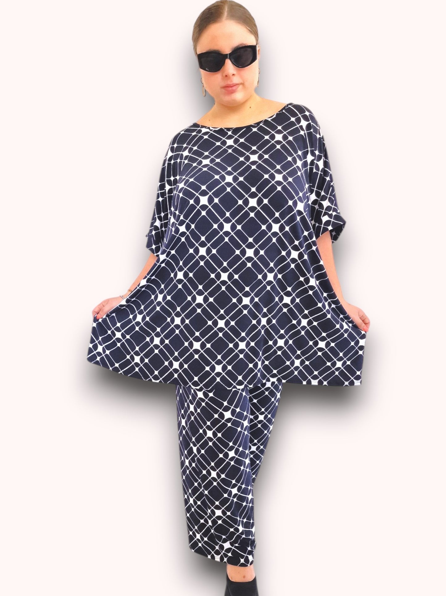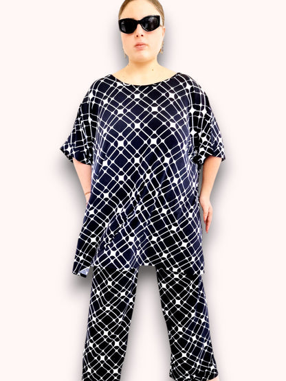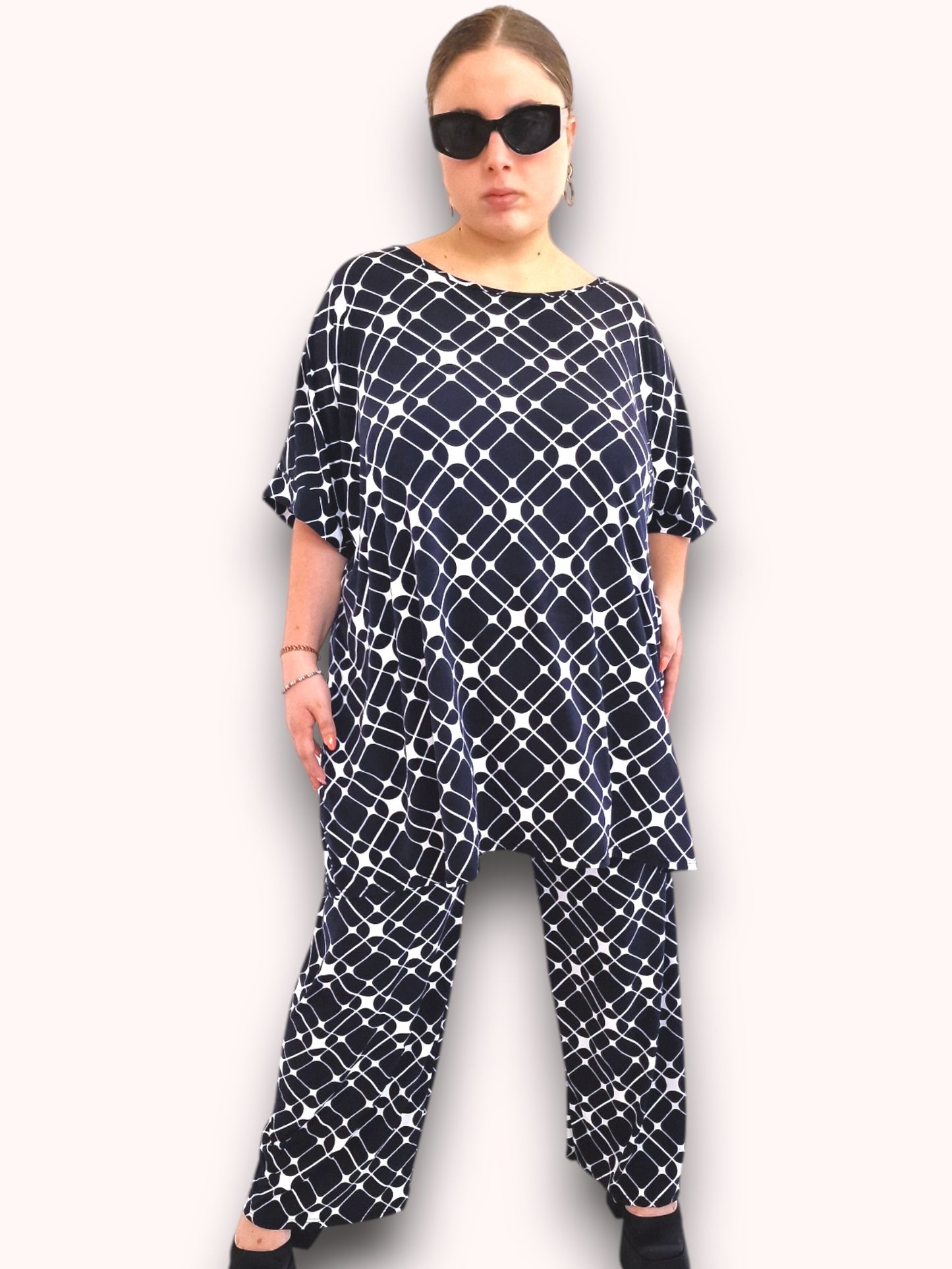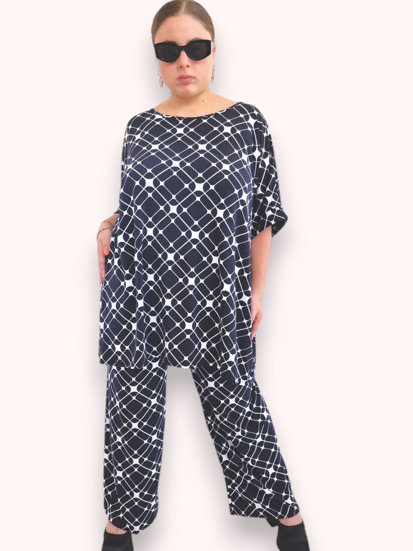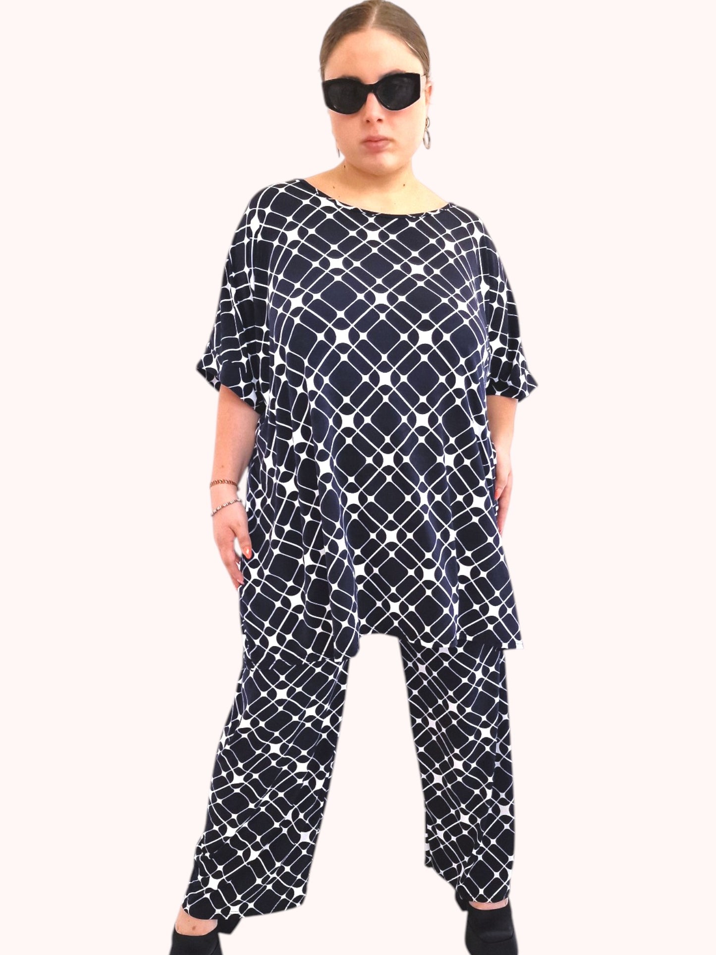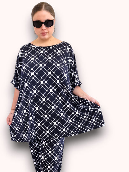 Il modello Fiamma è una maxi maglia in crepe di misto viscosa elasticizzato fantasia. Girocollo con bordatura sulla manica .Grandissima vestibilità