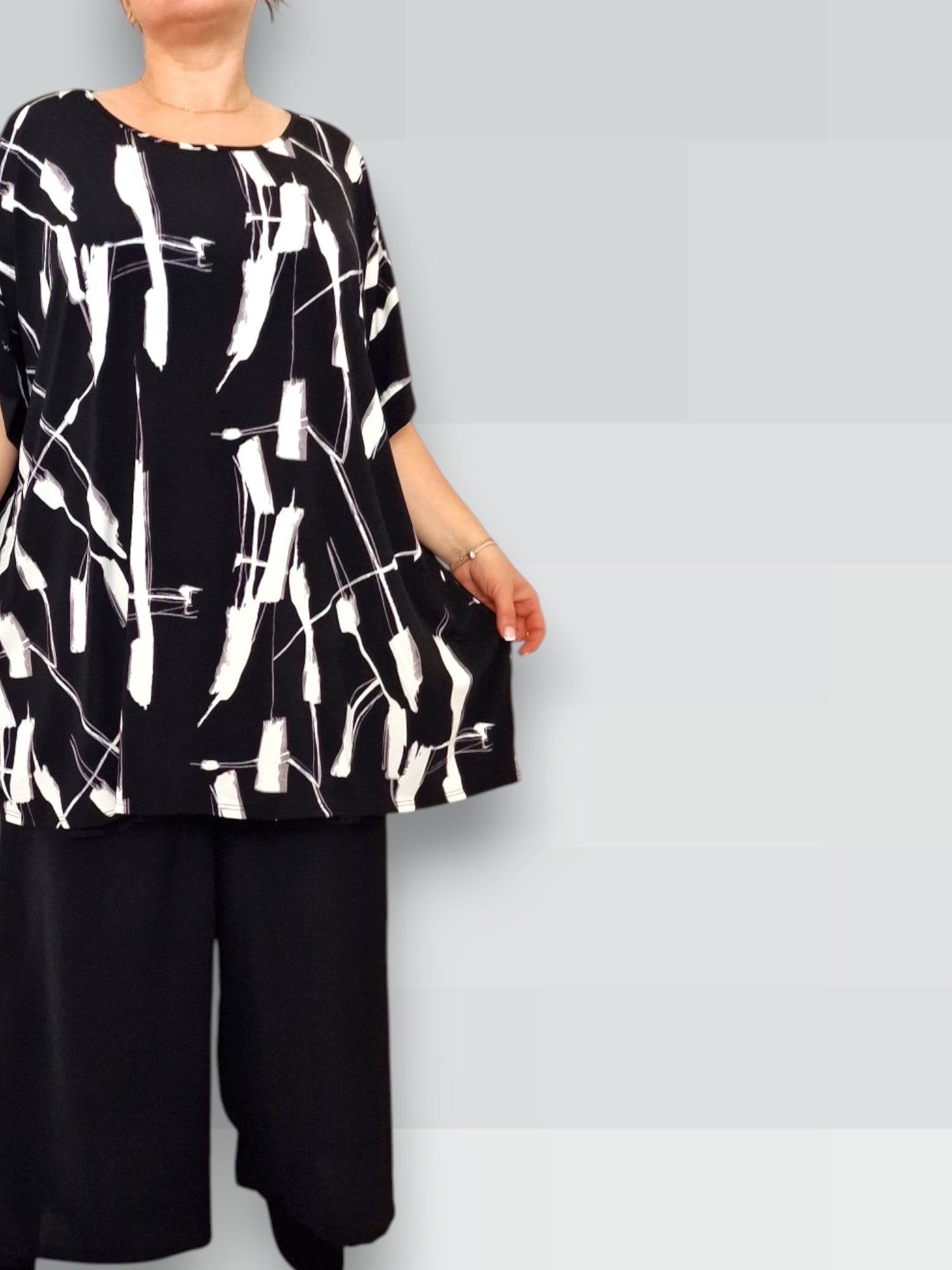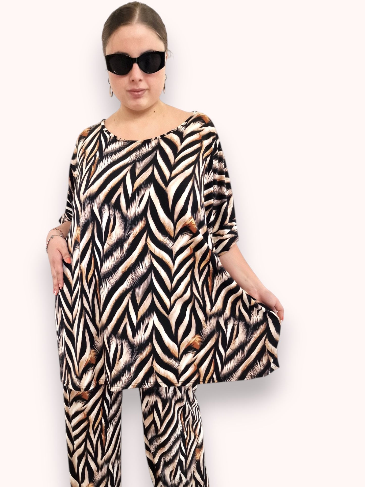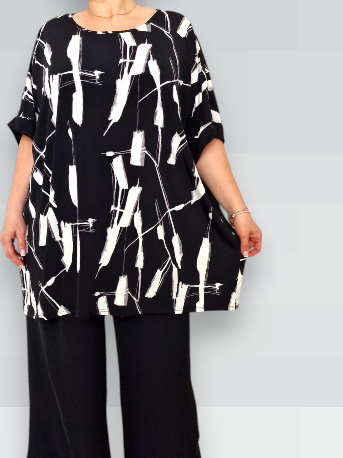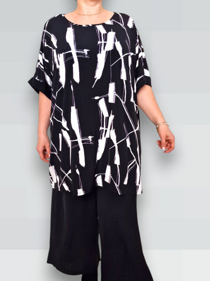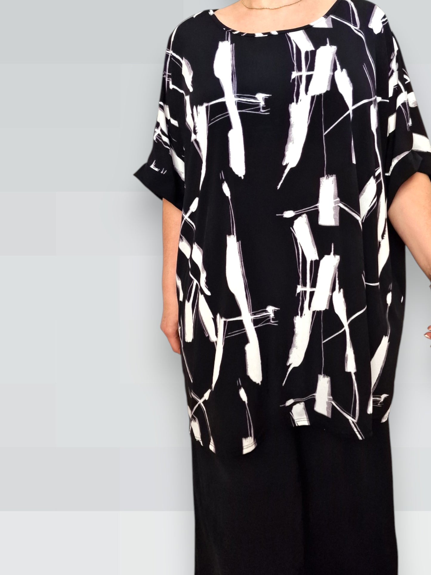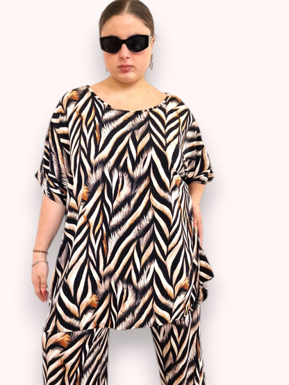 Il modello Fiona è una maxi maglia in crepe di misto viscosa elasticizzato fantasia. Girocollo con bordatura sulla manica .Grandissima vestibilità