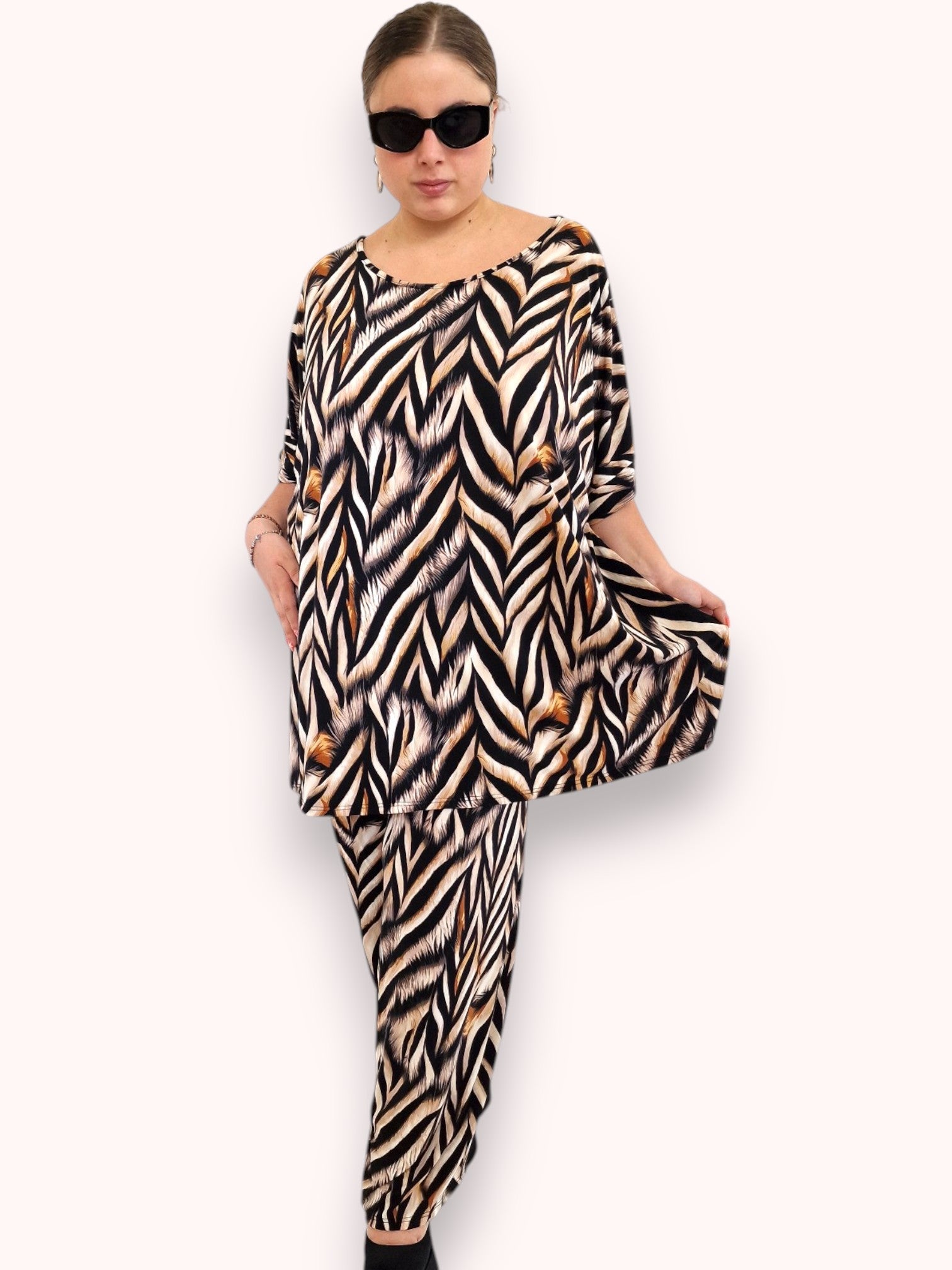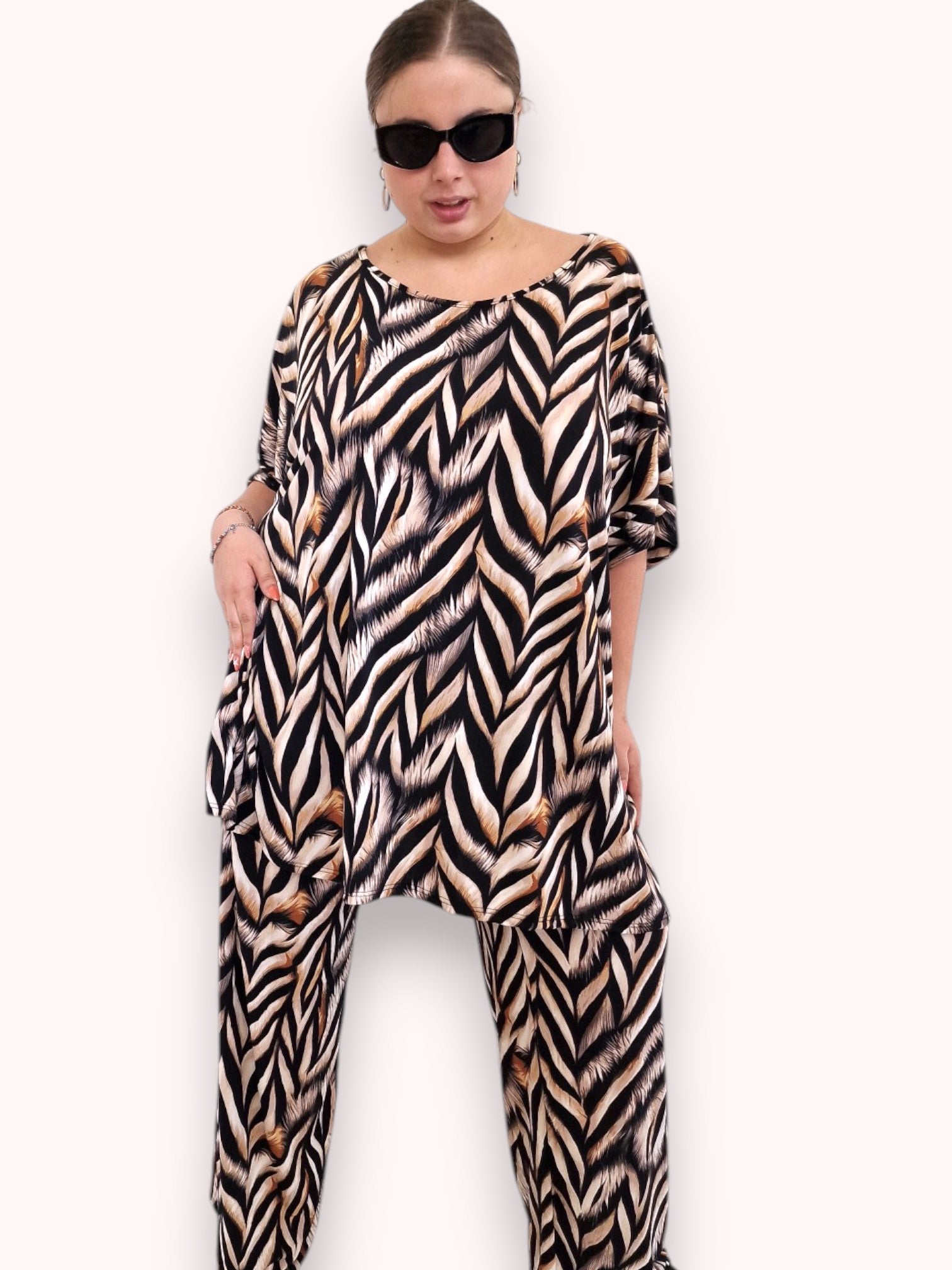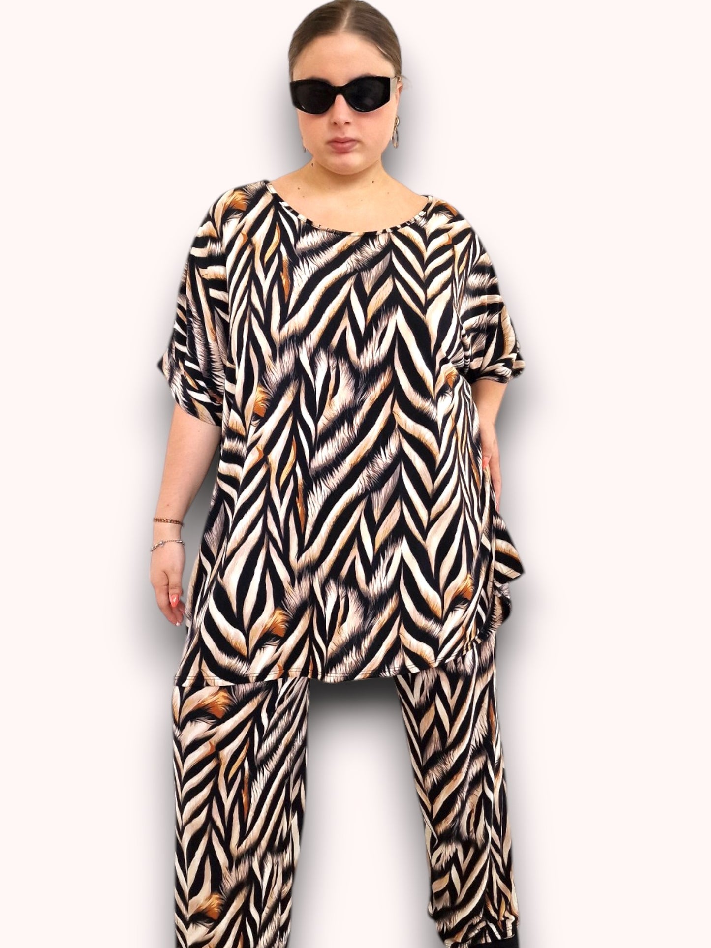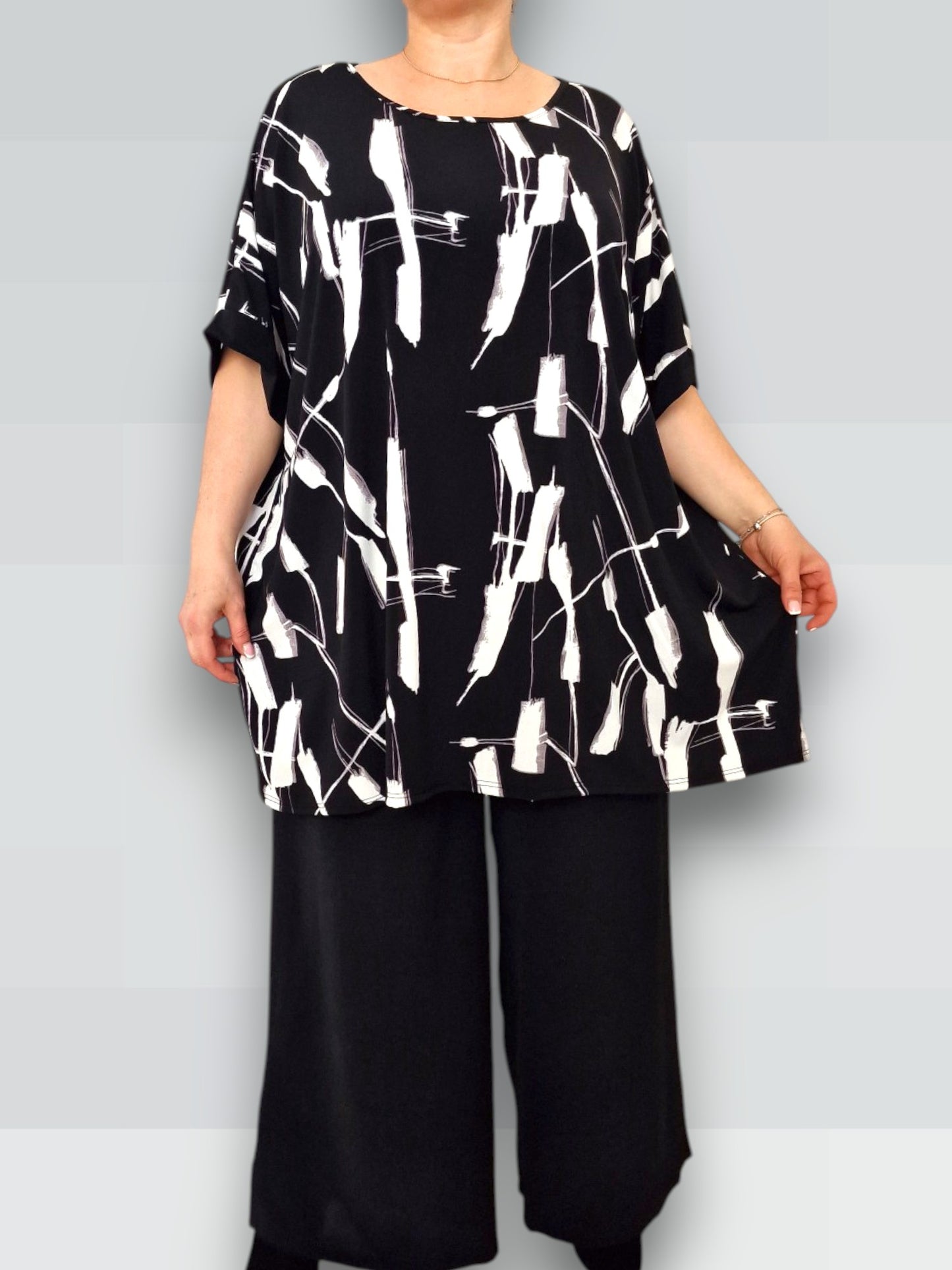 Il modello Fiona è una maxi maglia in crepe di misto viscosa elasticizzato fantasia. Girocollo con bordatura sulla manica .Grandissima vestibilità