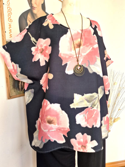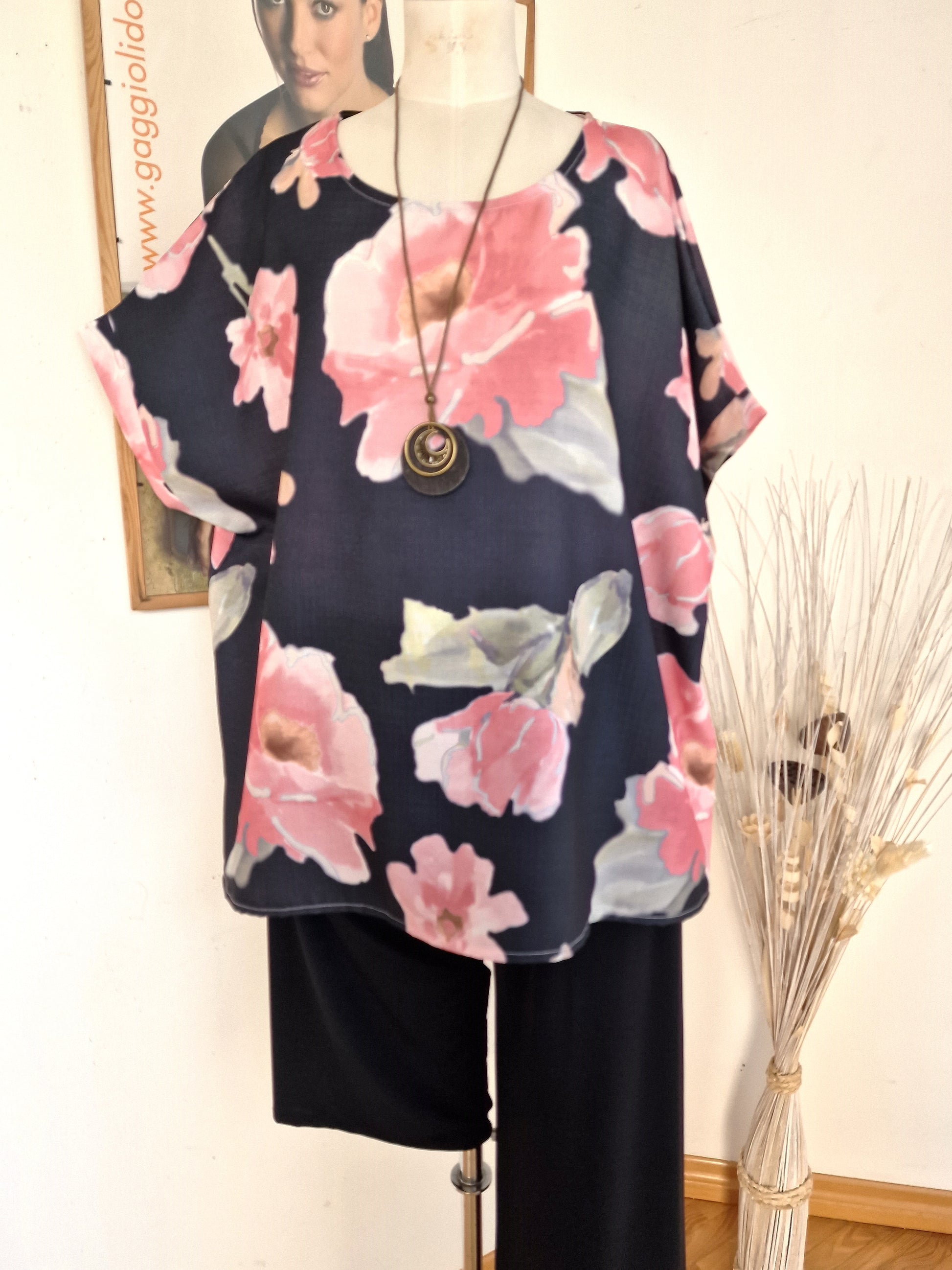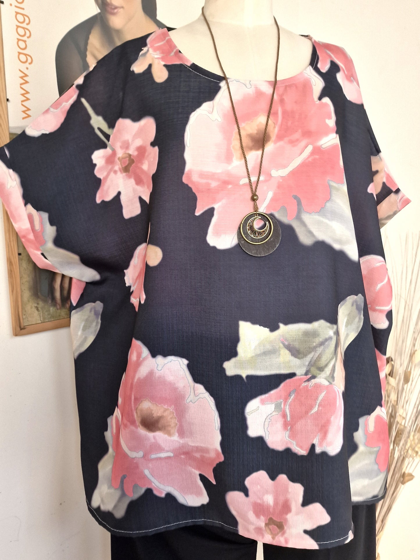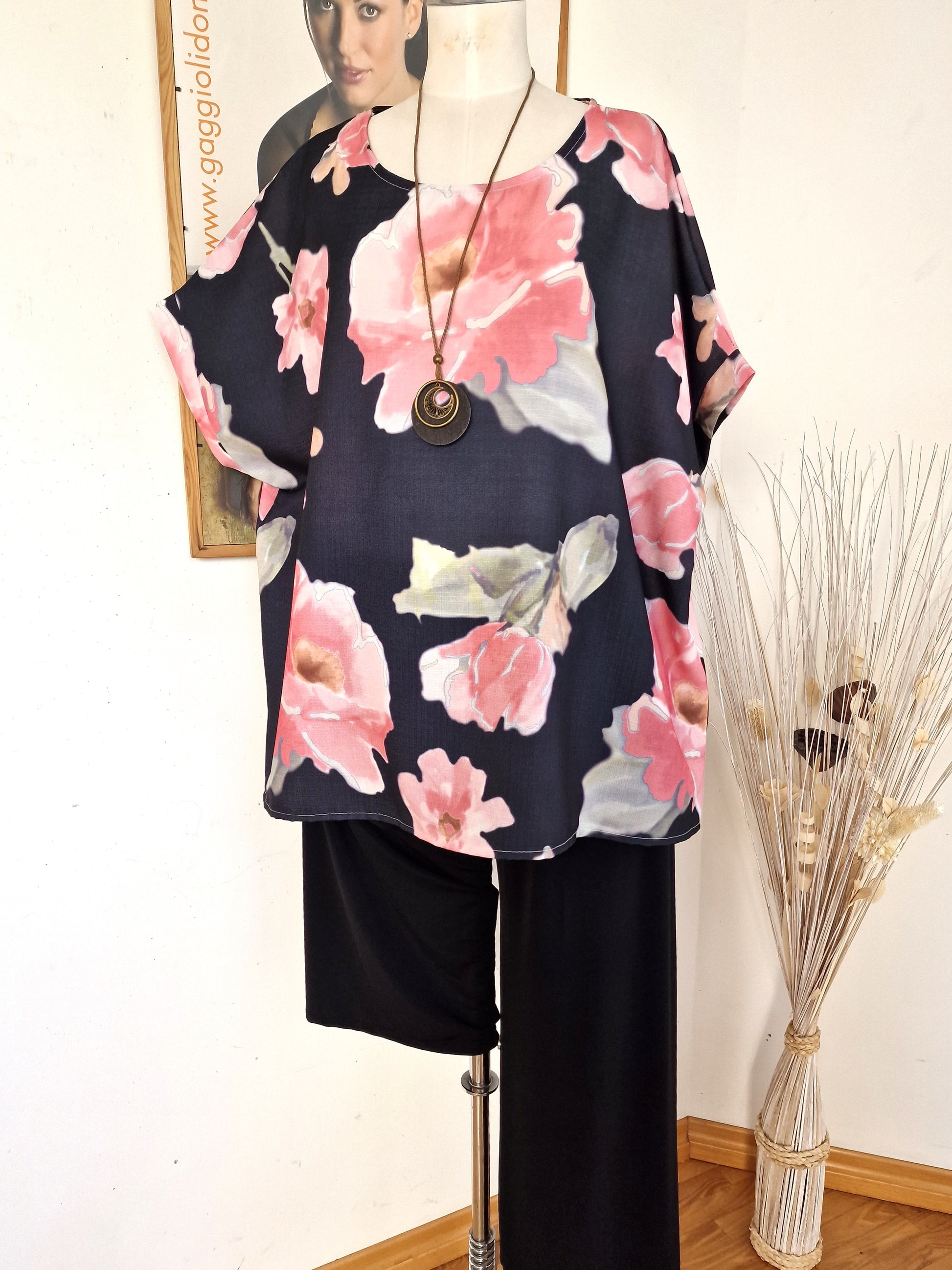 Il modello Sibilla è una Maglia + Collana in tessuto di misto viscosa , lino e cotone Fantasia girocollo con manica corta . l'abbinamento con una collana la rendono una maglia comoda e versatile allo stesso tempo.