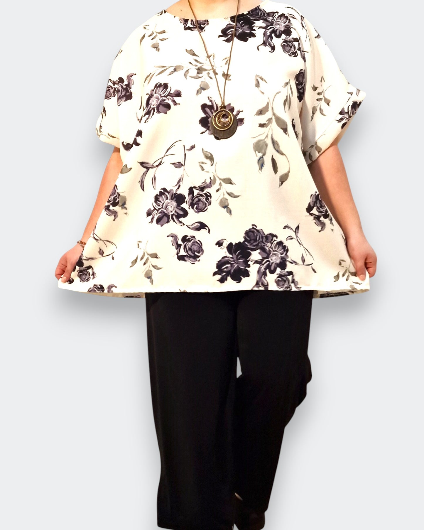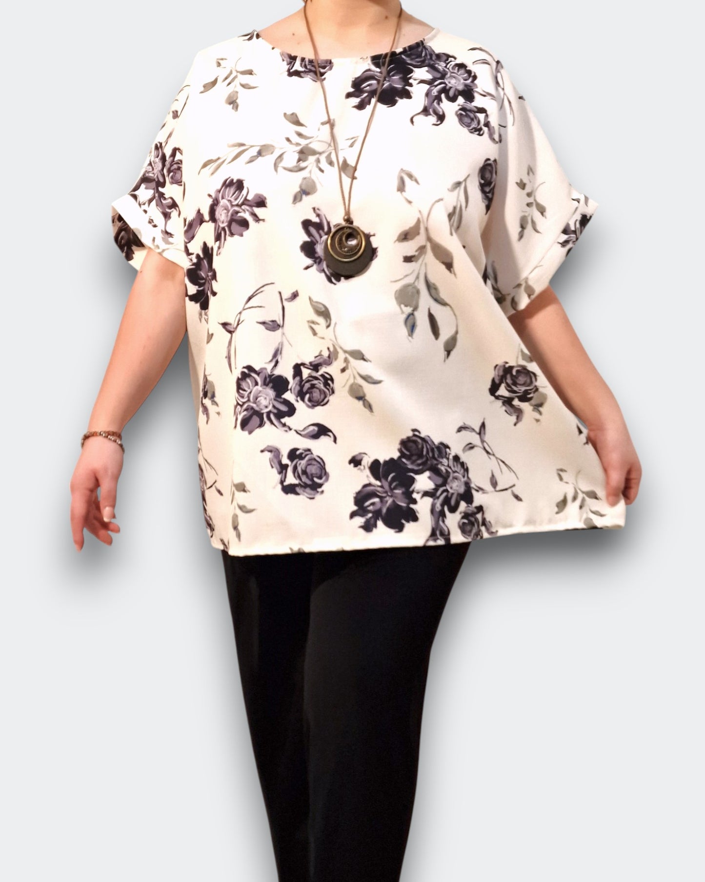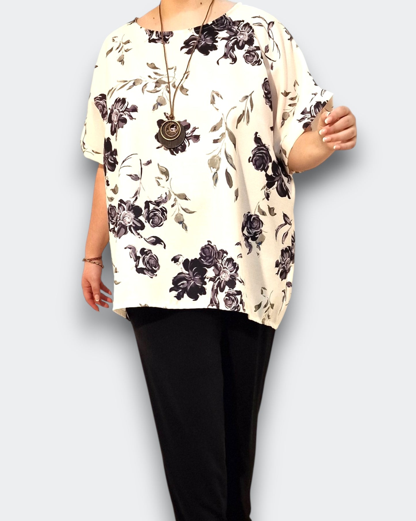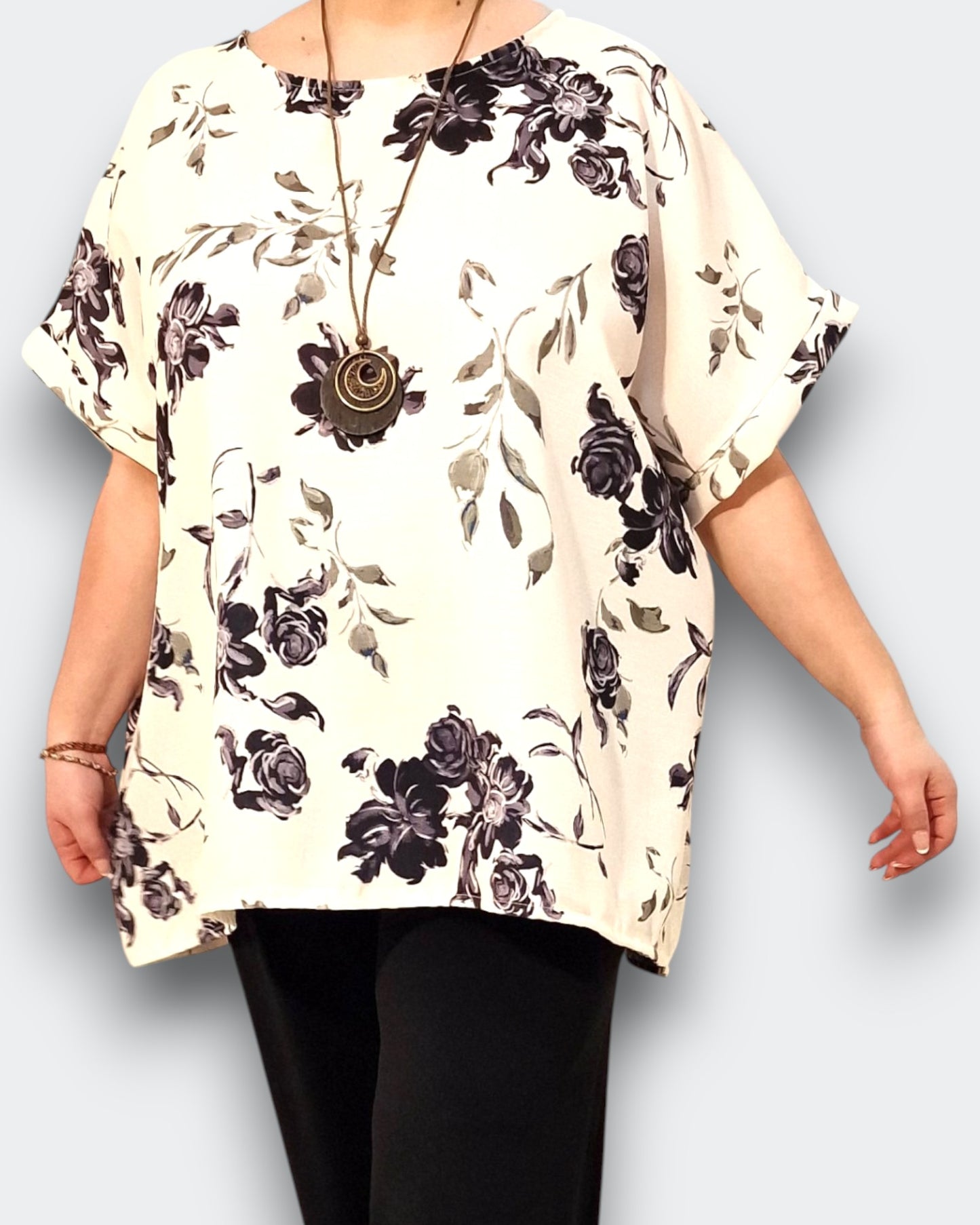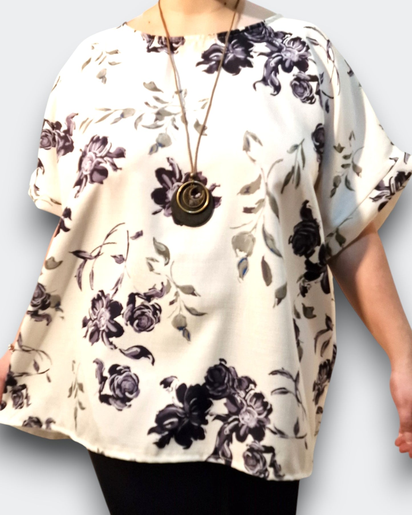 Il modello Stella è una Maglia + Collana in tessuto di misto viscosa , lino e cotone Fantasia girocollo con manica corta . l'abbinamento con una collana la rendono una maglia comoda e versatile allo stesso tempo.