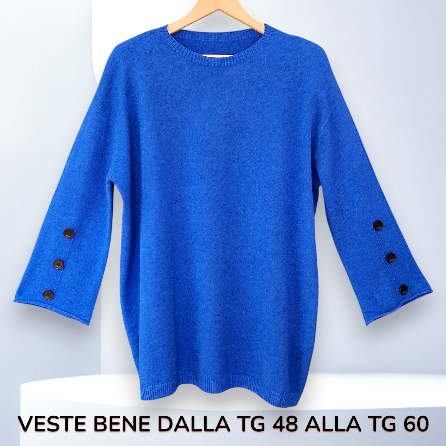 Il modello Roger è una Maxi Maglia Taglia Grande Manica a campana in tessuto elasticizzato di misto viscosa e modal effetto lana. Girocollo con applicazione di tre bottoni sulla manica. Ottima vestibilità, Questo modello è perfetto per chi cerca una maglia più aderente , ma con una grandissima vestibilità. Ottima per le giornate di lavoro o serate informali
